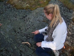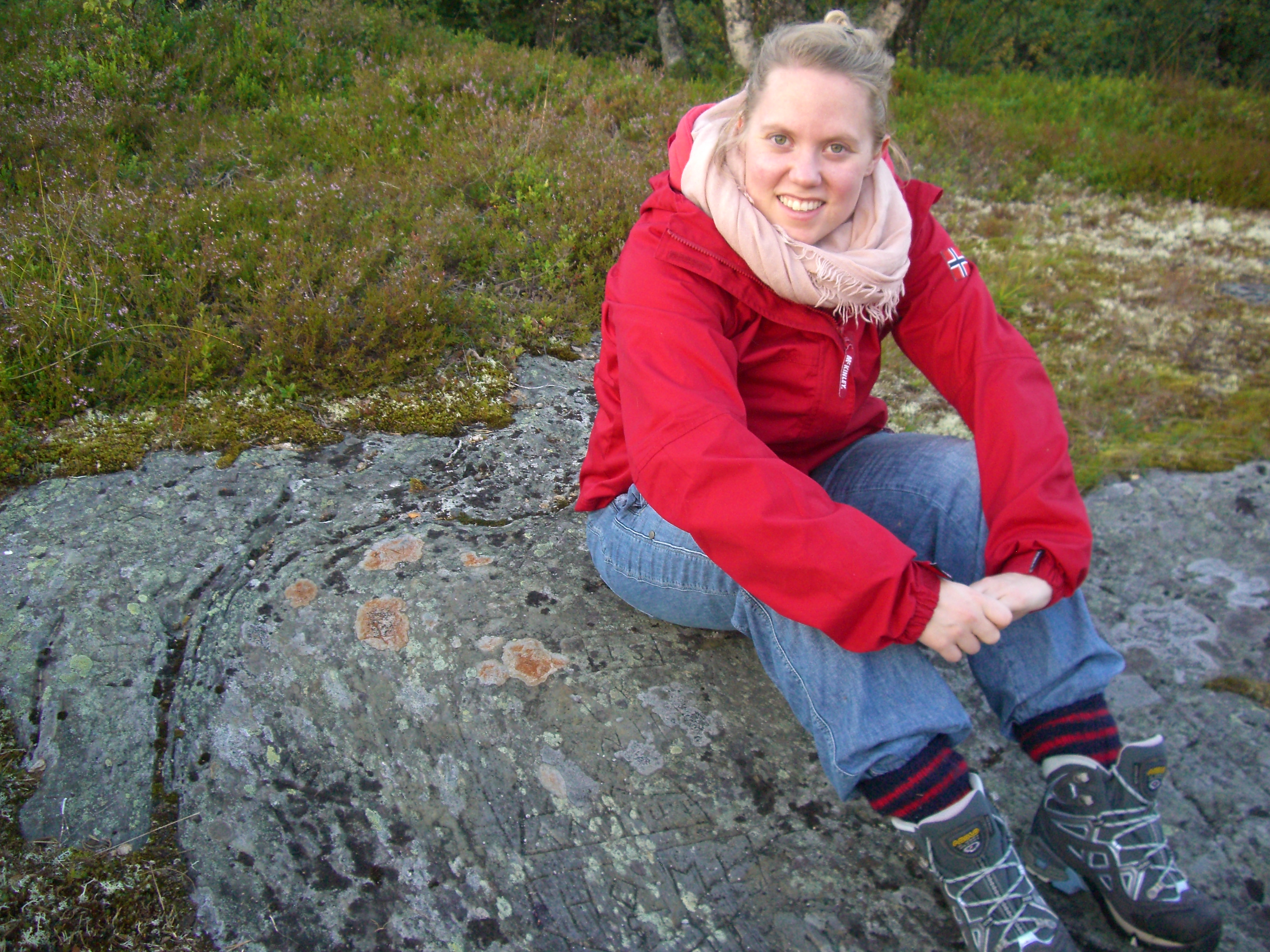 Et sted på berget er det mange som har hugget inn initialer og årstall i fjellet. Kanskje er det ungdommer som har vært budeier på sætrene og deres besøk som har satt sine spor. Det eldste vi fant var fra 1802 – men hver gang vi er der oppe ser vi noe nytt. Det er utrolig hvordan lyset plutselig avslører nye mønstre og ord.