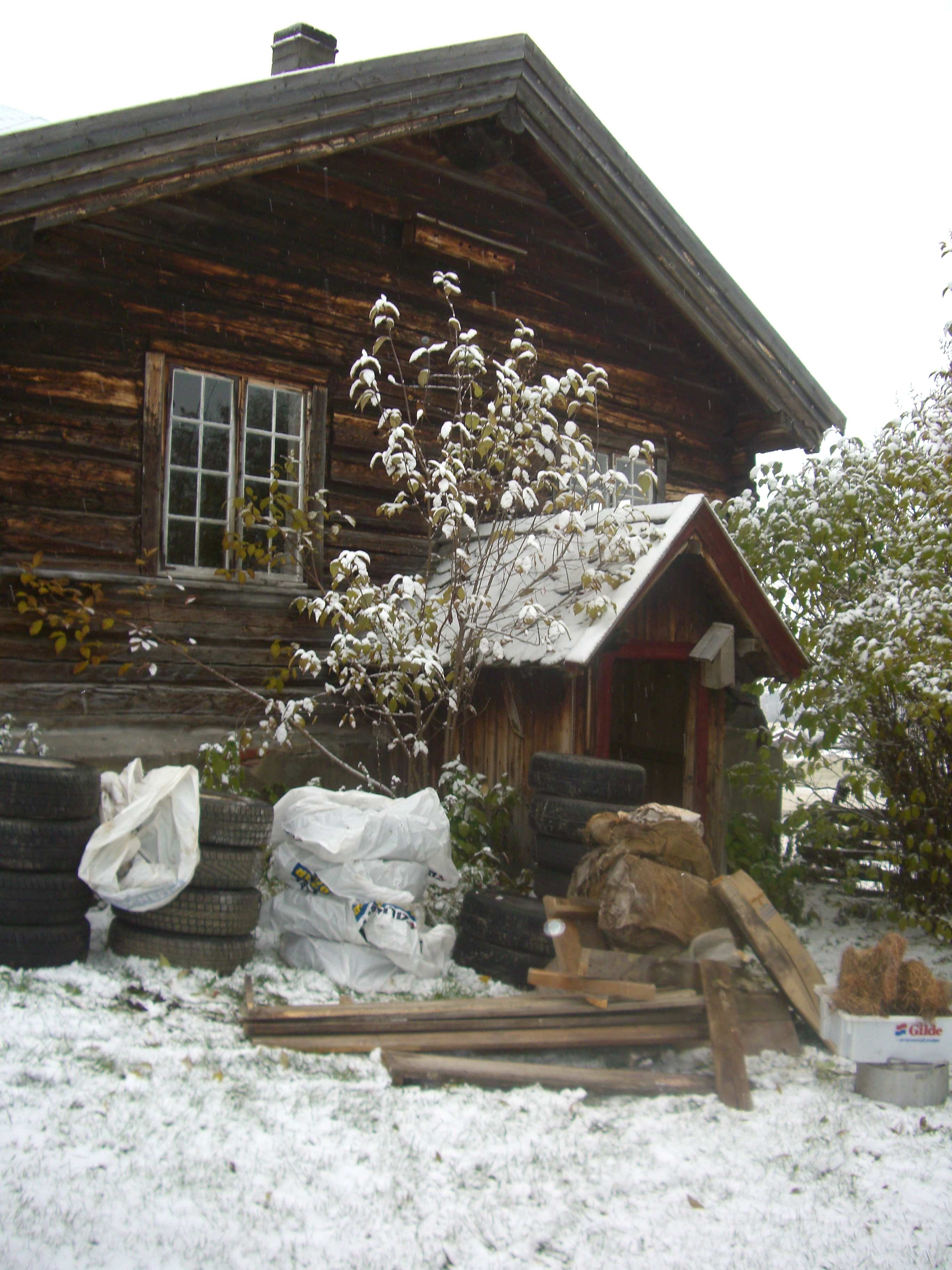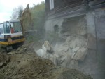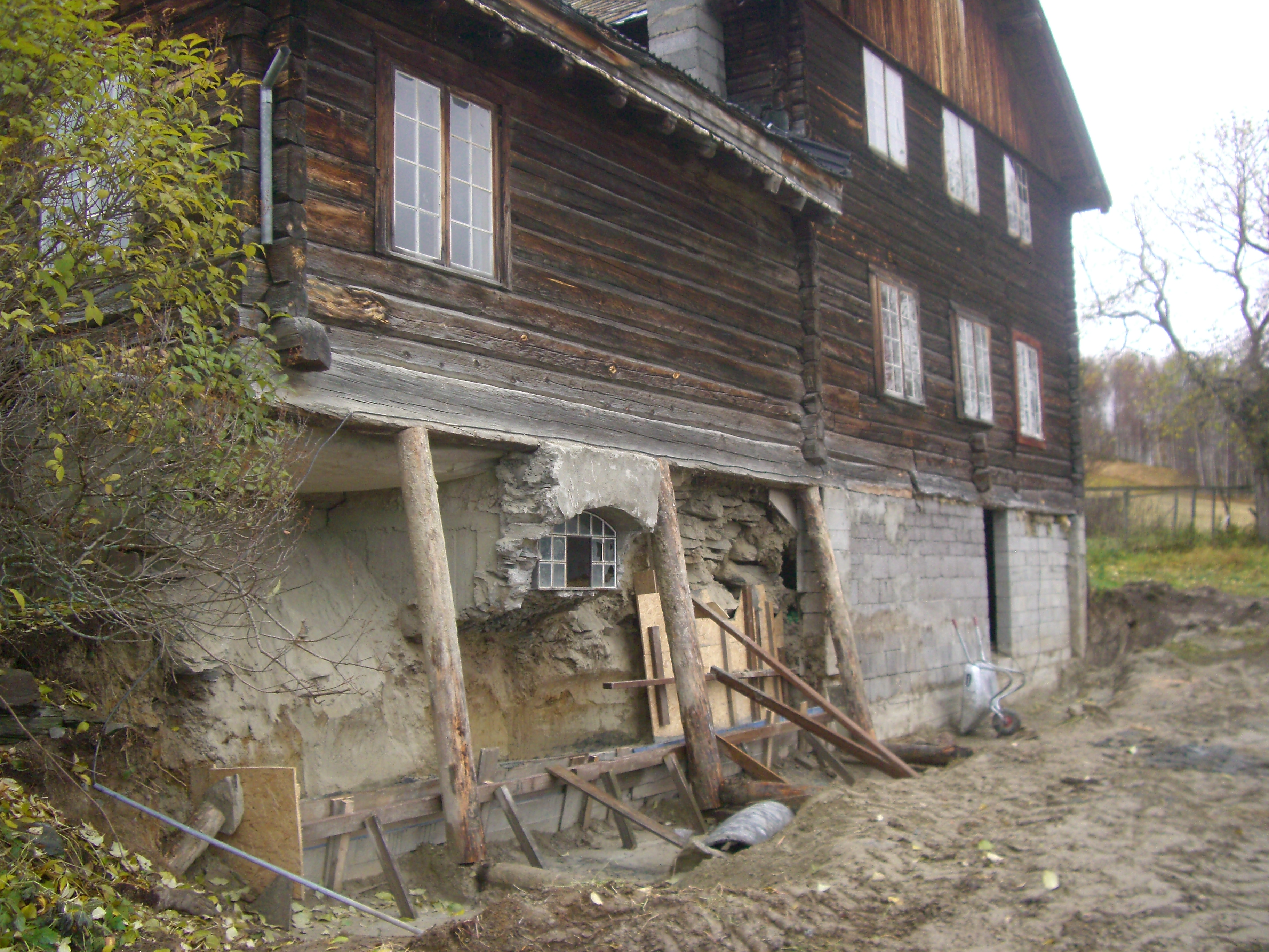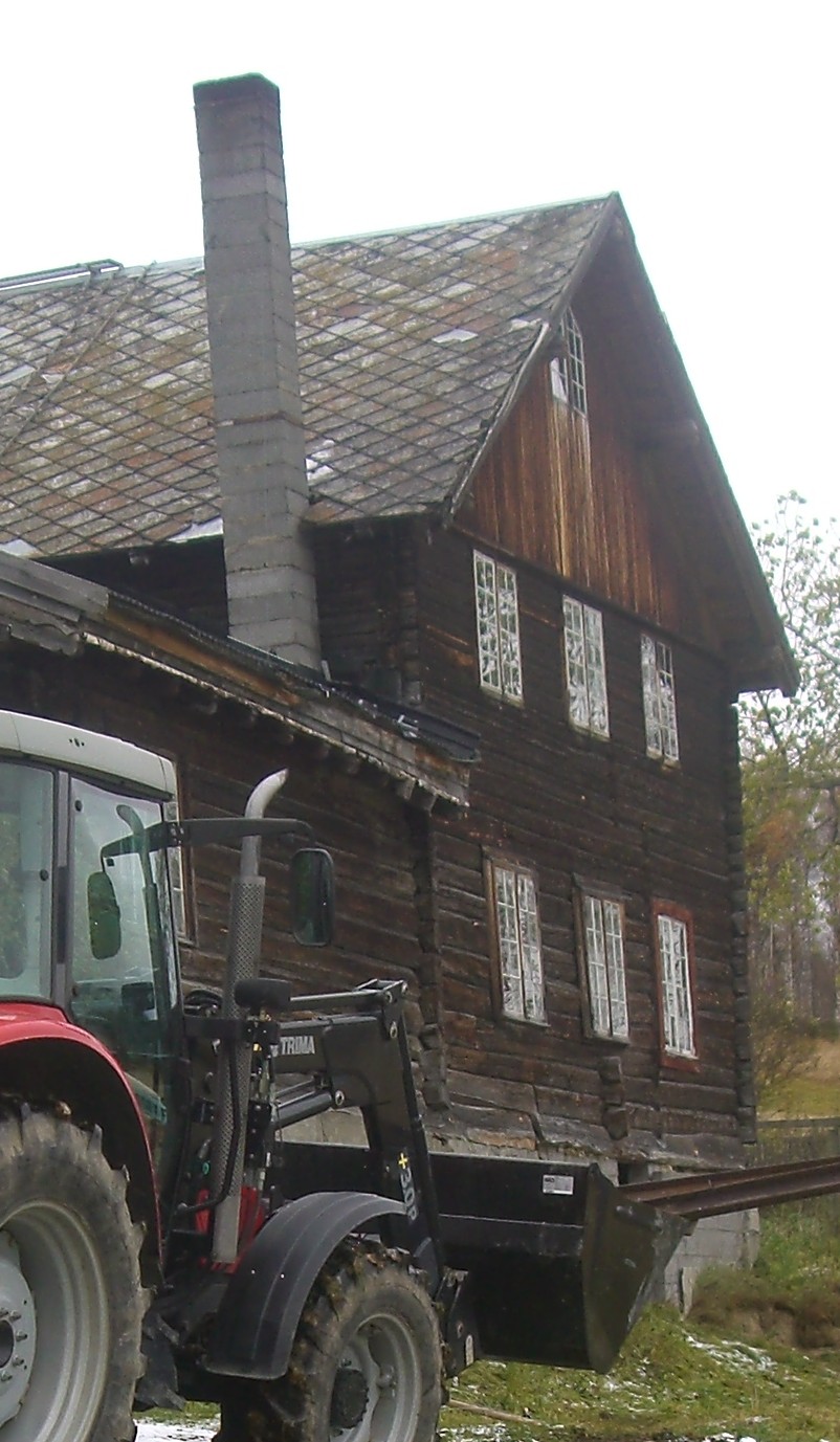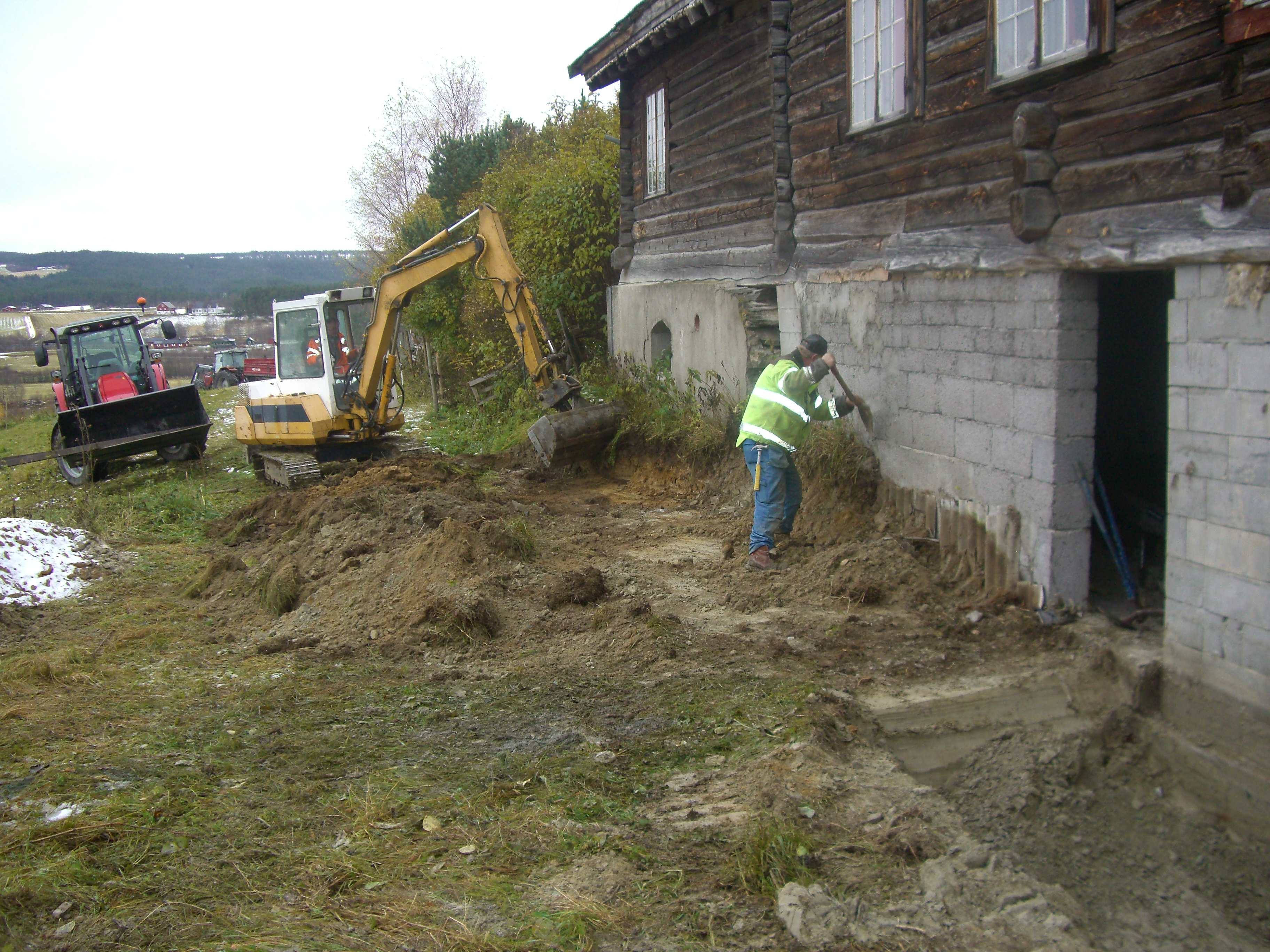 Det er bare å innse – det må ny grunnmur til under mesteparten av huset, og sannsynligvis bør også noen av bunnstokkene skiftes. Deler av huset må også jekkes litt opp og i tillegg må det dreneres rundt hele huset. Dessuten skal det bygges en mindre forstøtningsmur under selve huset. Vi har fått tak i driftige fagfolk som har greie på det, og som kan sitt håndverk; Svein Olav, Ivar og Tor. De kom med masse utstyr og pågangsmot og satte i gang. Men først ble det gjort en innsats fra huseier Stein, som for hånd gravde ut en mengde masse fra innsiden av grunnmuren, før de andre kom med gravemaskin og jobbet på utsiden. Opprinnelig er det to små kjellere under huset, den ene ligger omtrent midt under kjøkkenet, mens den andre ligger under storstua, den lave, enetasjes delen av huset. Kjelleren under kjøkkenet blir ikke berørt av arbeidet som skal gjøres, men veggen fra kjelleren under storstua mot øst, må skiftes. På denne veggen er det også en pipe fra den tidligere peisen i stua. Dette byr på noen utfordringer da muren inntil pipa rives. Vil pipa klare seg og bli stående, er spørsmålet. På den veggen er det også et buet gammelt vindu. Heldigvis gikk det bra med både pipa og vinduet. Utenfor den andre kjelleren, vil det nå bli et nytt kjellerrom som Stein har gravd ut. Denne uka fortsetter arbeidet…