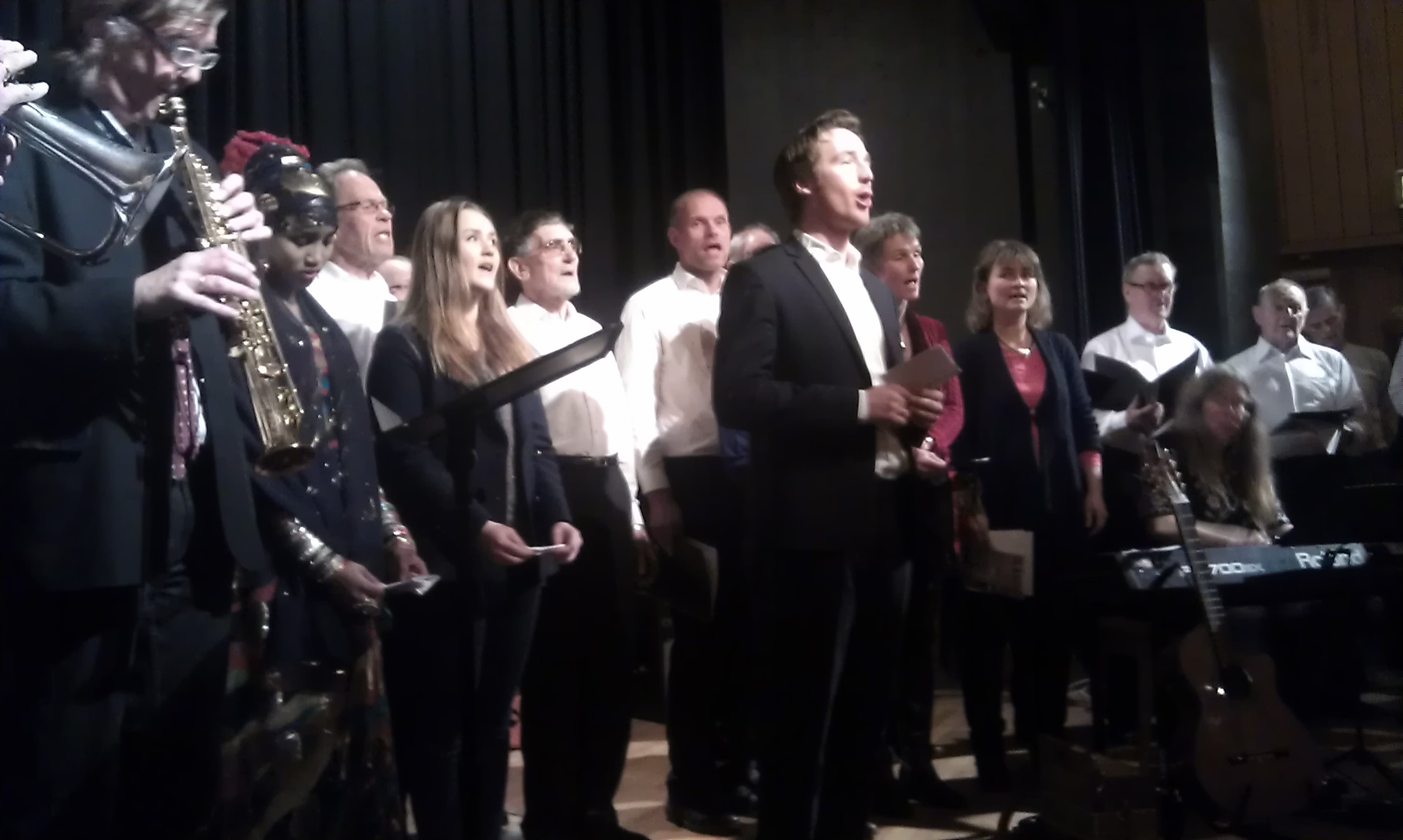 Operasangeren Ola Eggen foran Alvdal mannskor og noen av de andre aktørene som bidro til en flott forestilling på Aukrustsenteret.