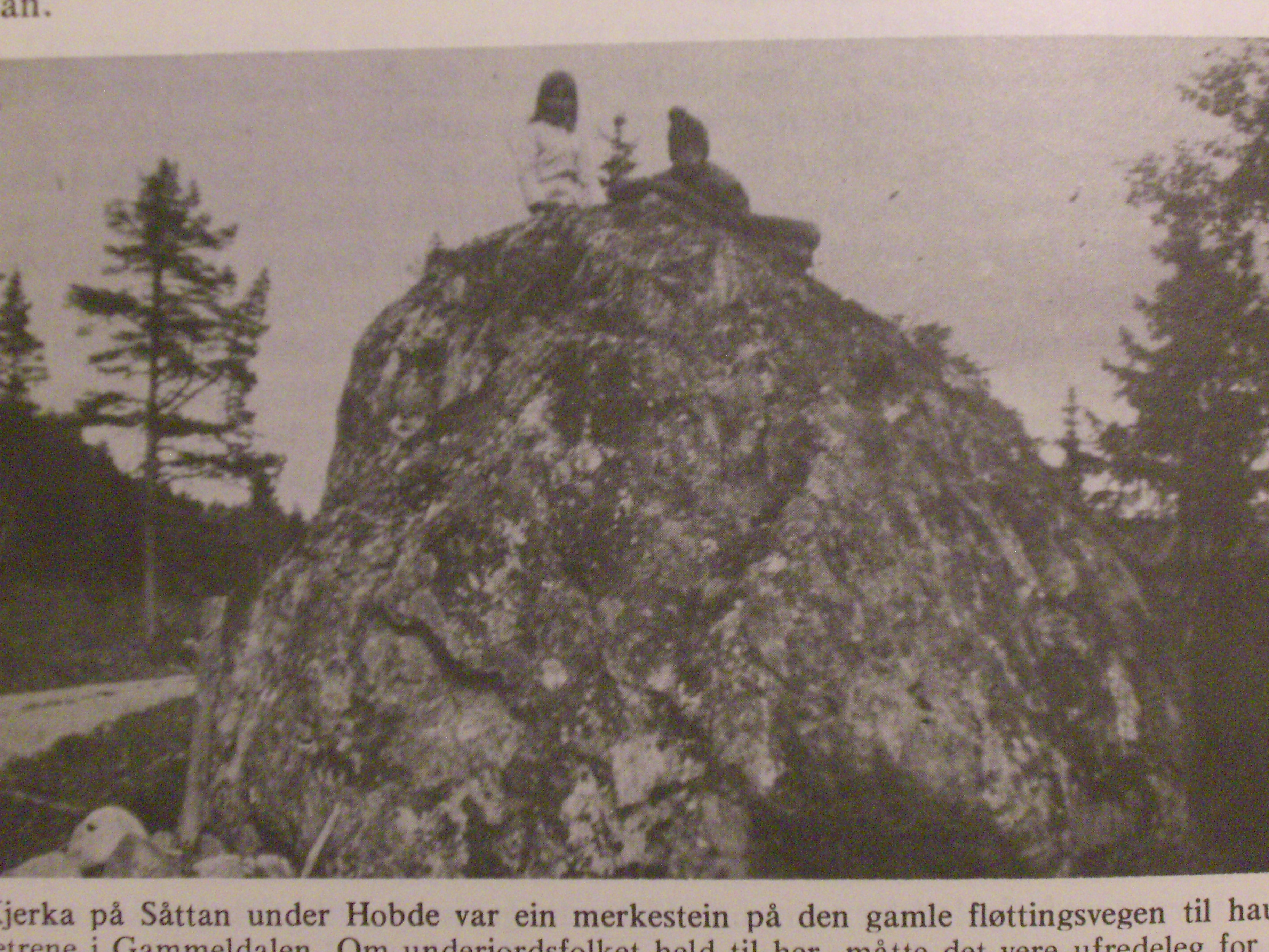 Denne svære steinen var en merkestein på den gamle fløttingsveien til høstsætrene i Gammeldalen. Under den skulle de underjordiske holde til, og steinen ble derfor kalt Kjerka. Kanskje fordi den da skulle være de underjordiskes kirke? Foto: Bjarne Grandum