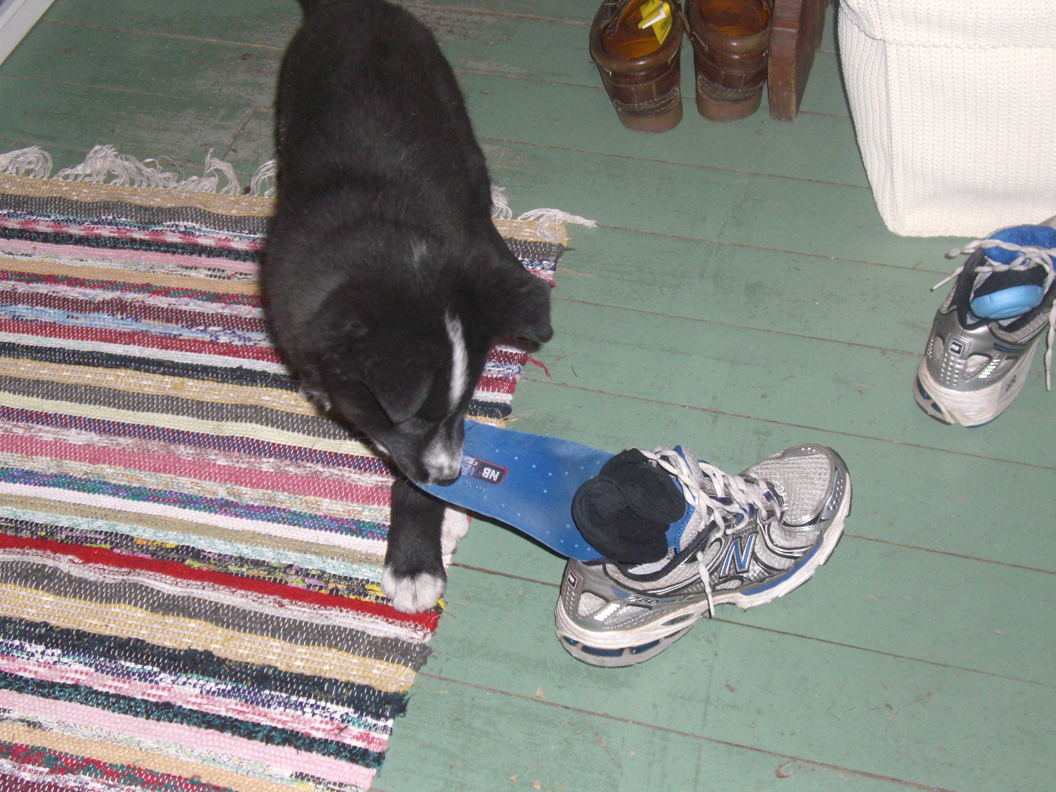 I dag prøvde jeg å ta han med på en liten joggetur, men det var skummelt, syntes han. Lyder av et eller annet (mus?) gjorde at han stoppet og smøg halen mellom bena, og klemte seg inntil meg. Da vi også hørte en annen hund gjø, var det slutt. Han nektet både å gå og løpe lenger, og det endte med at jeg måtte bære ham ned til veien vår. Derfra og hjem løp han det han orket, og da hang jeg så vidt med 🙂