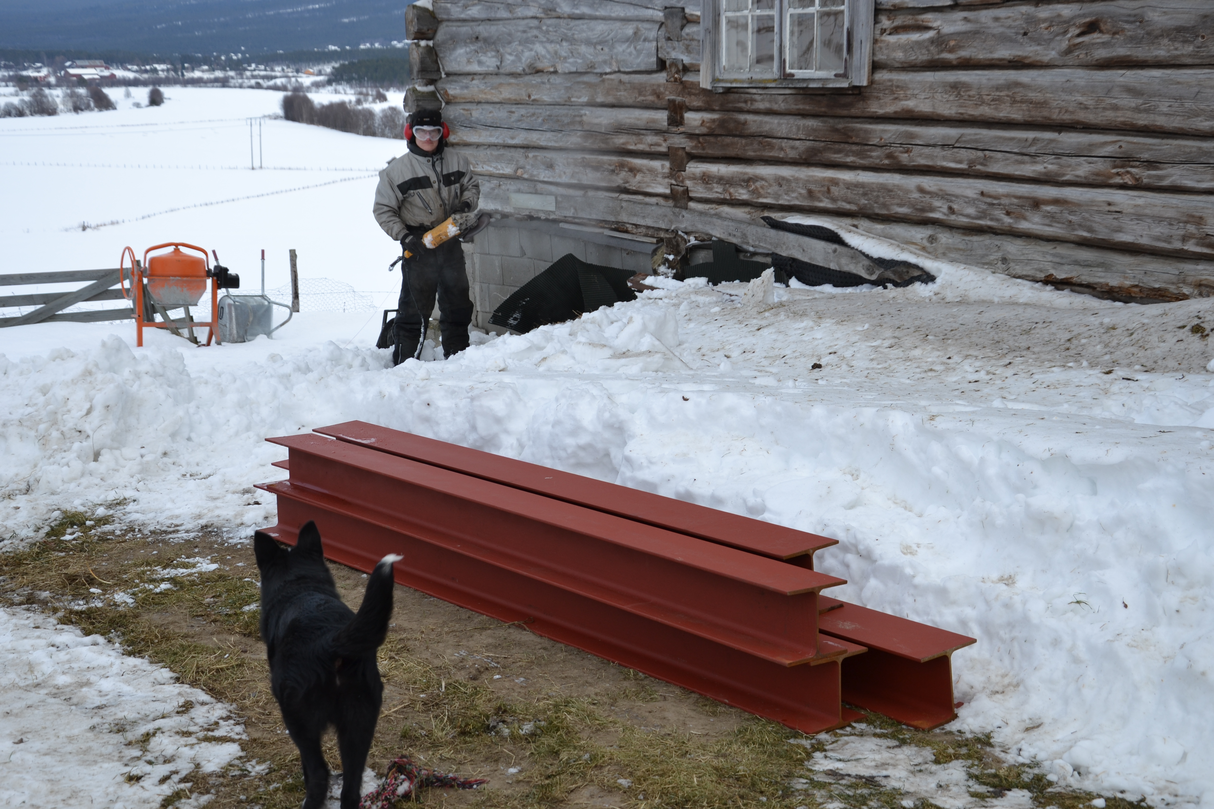 Stålbjelker er levert, disse skal plasseres under huset for å stabilisere det