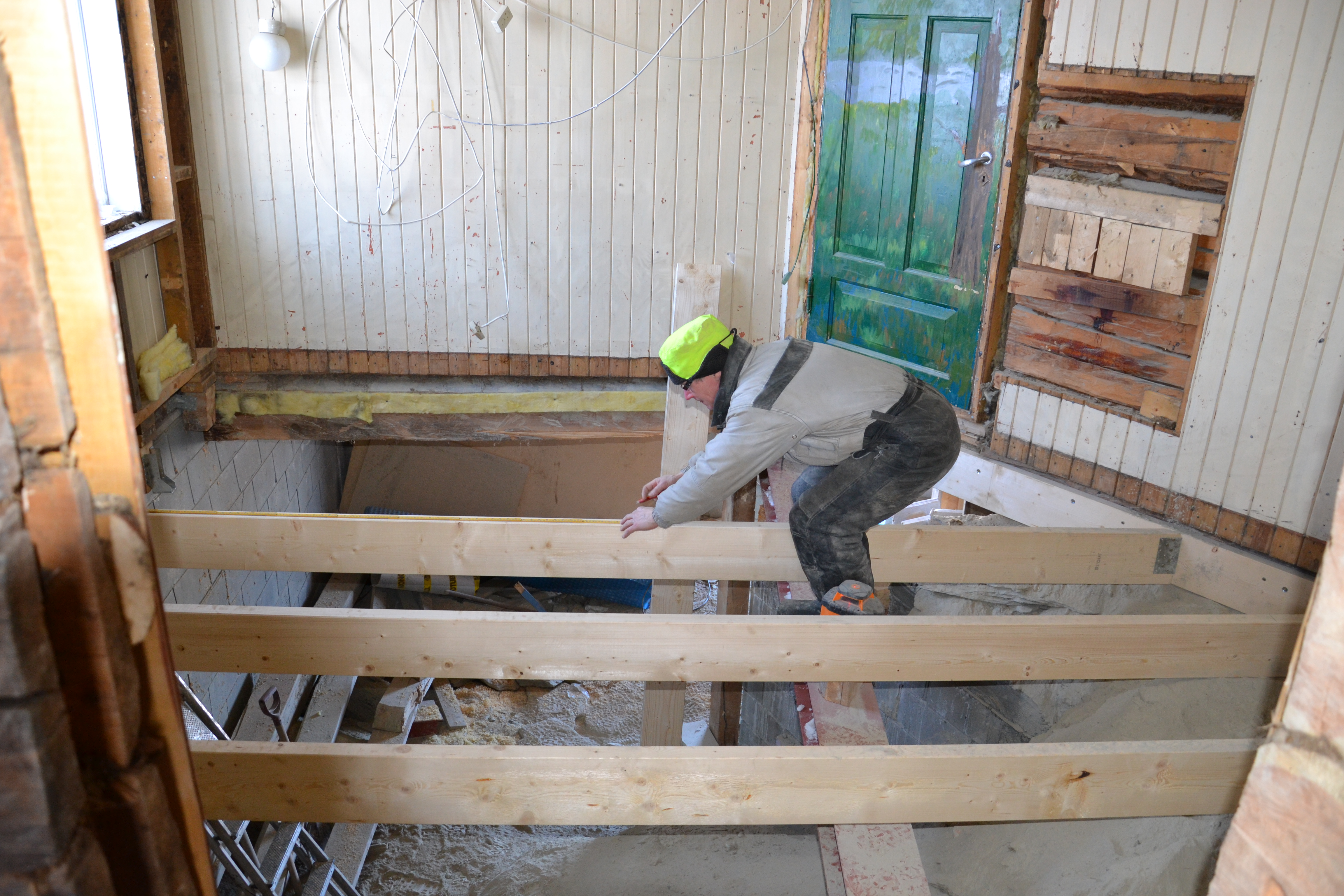 De gamle gulvbjelkene er ikke festet særlig godt, og ga dermed lite hold til gulvet. De må fjernes