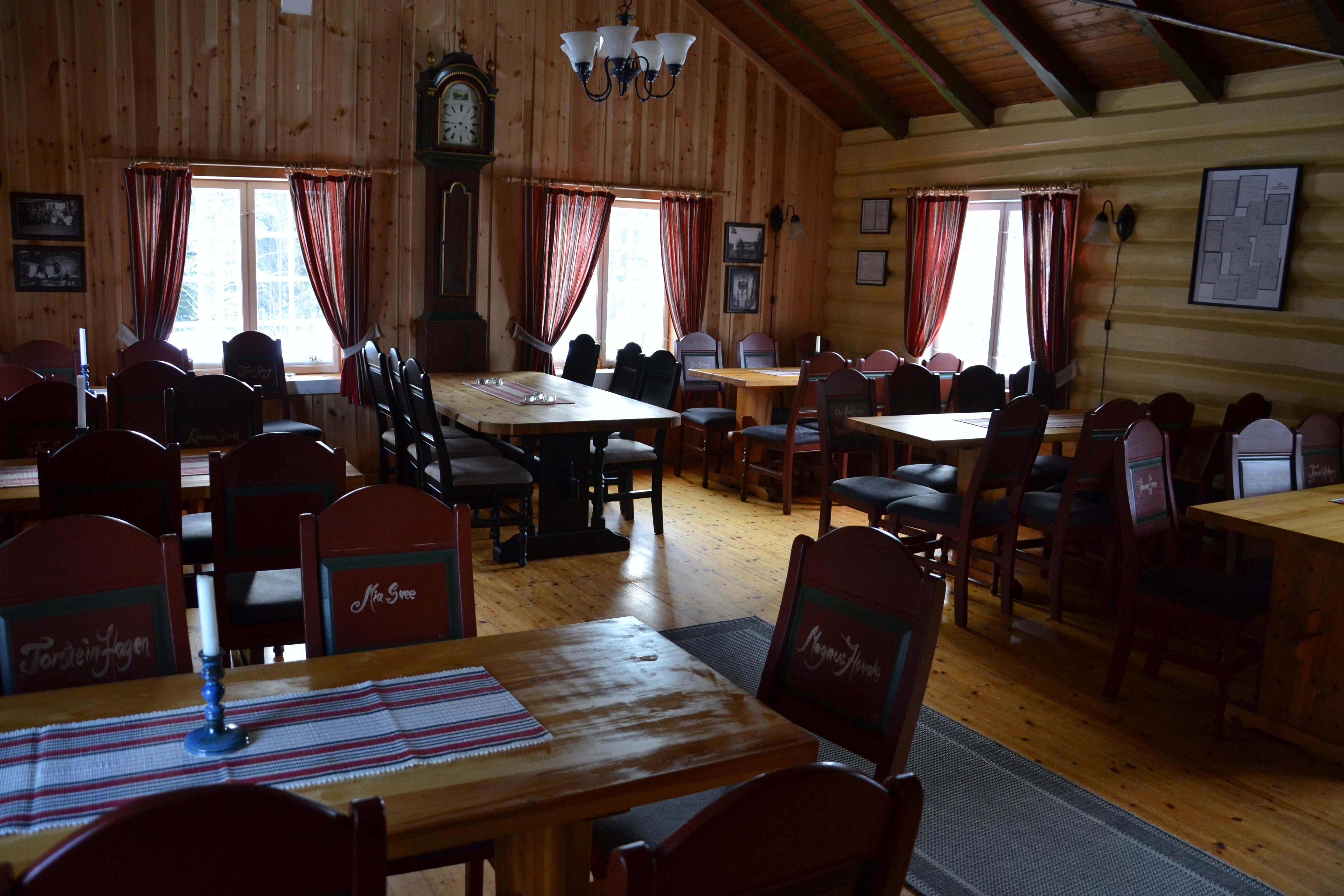 God plass inne i hytta en tidlig søndagsmorgen. Til peisestua her kunne man «kjøpe» en fin østerdalsstol og få navnet sitt malt på. Andre steder på Tynset har man kunnet kjøpe litt kunstgress for å finansiere kunstgressbanen eller en lyktestolpe for å få lysløype! Skihytta kan forøvrig leies til ulike arrangementer.
