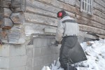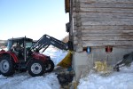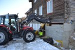 - Traktoren kjøres forsiktig mot huset og dytter stokken på plass