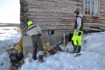 Hos oss foregår det alternative påskeaktiviteter i år. Både innvendig og utvendig jobbes det på høygir på våningshuset. Vi må passe på mens det er påskegjester som kan ta i et tak! Den nederste bunnstokken på husets østside lå vridd etter at tidens tann har beveget tømmeret. Den måtte rettes opp før det fortsettes å sette opp ny grunnmur.