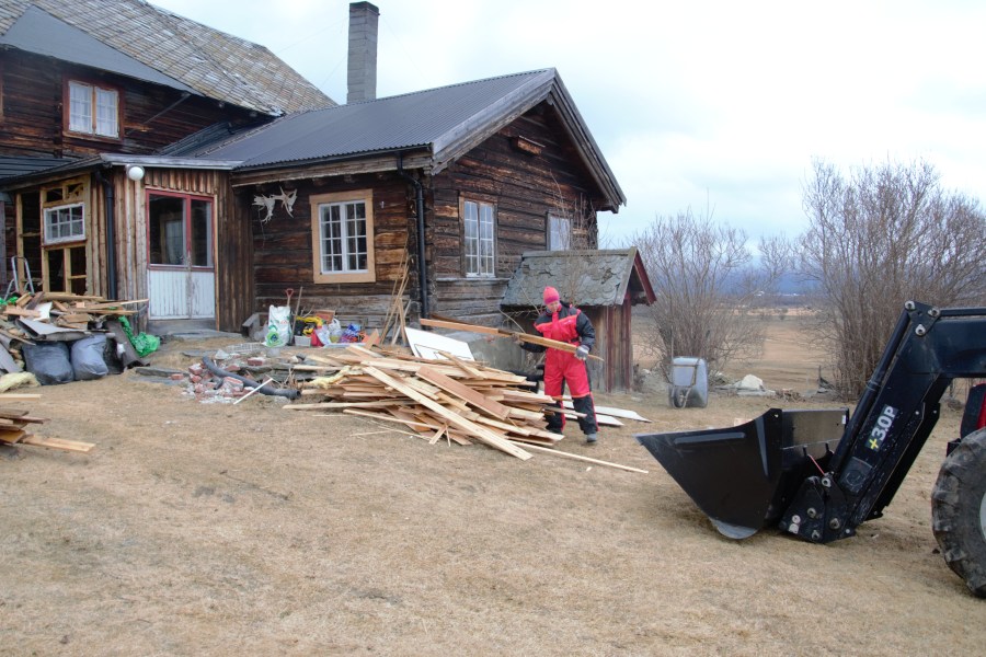 Alle ubrukelige materialer blir lempet i traktorskuffen og kjørt til bålet