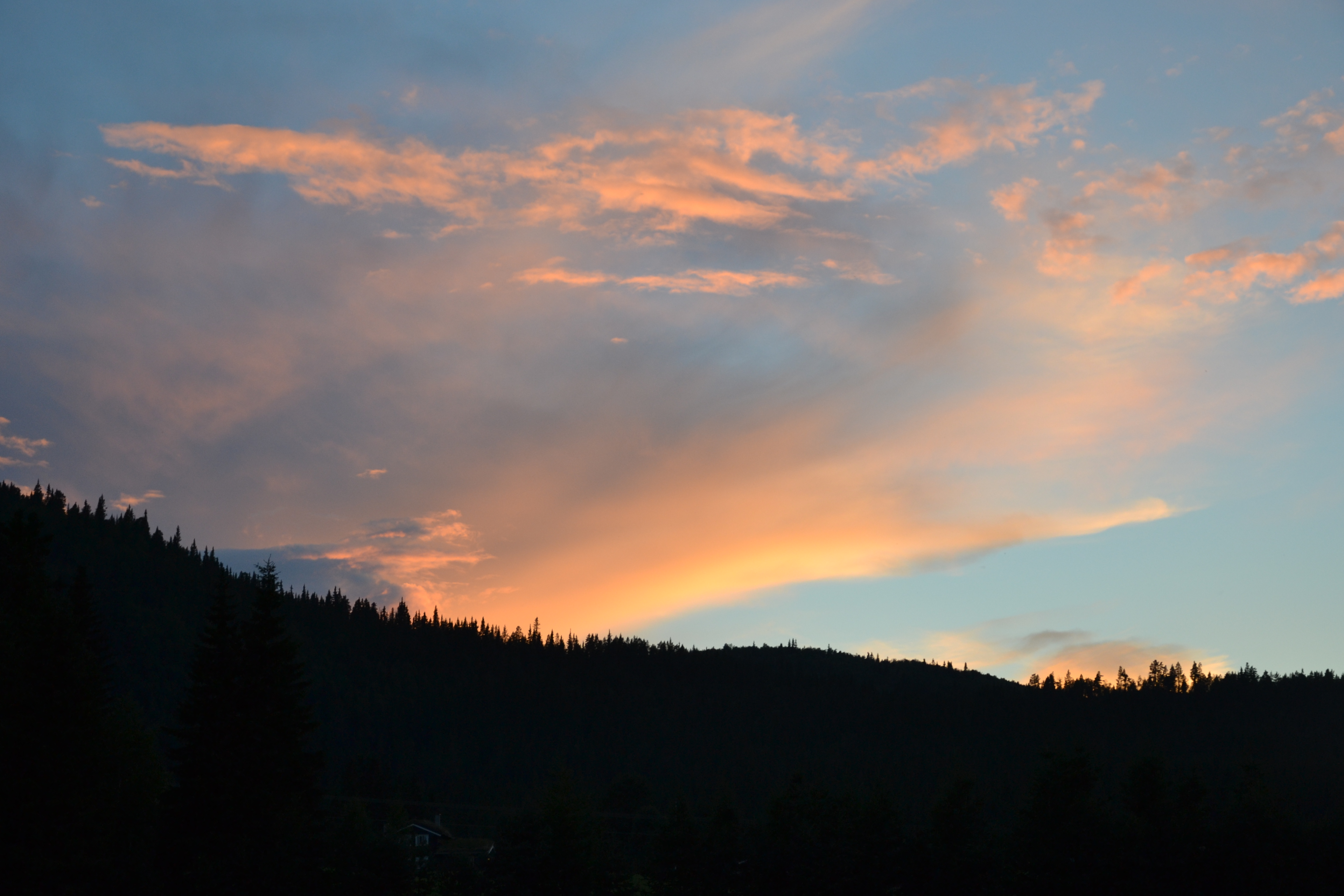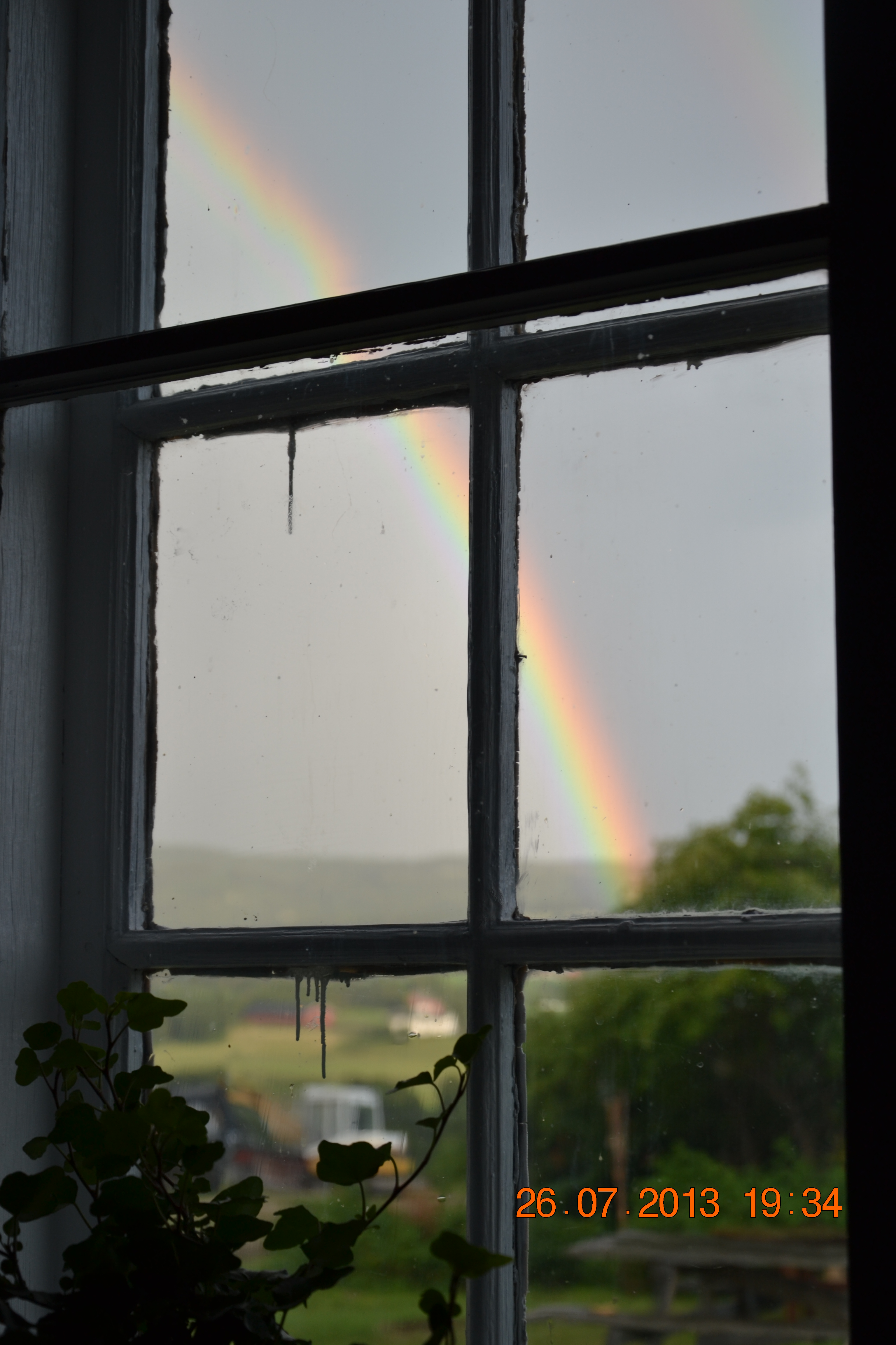 Det er ingen selvfølge å kunne sitte utendørs de lange, lyse sommernettene vi har her på våre trakter. I så fall trenger man som regel i hvert fall de faste ulltrøyene og -buksene for å holde ut. Men i år har også vi hatt deilige varme dager og kvelder, og vi har kunnet nyte uteliv til langt uti de små timer – UTEN annet enn sommertøy på! Her er fortsatt nettene ganske lyse og vi håper varmen vil vare lenge ennå. Akkurat nå sitter jeg forøvrig å kikker på en fantastisk regnbue, og det drypper litt fra himmelen. Men temperaturen er fortsatt god, og forhåpentligvis er det bare en byge.