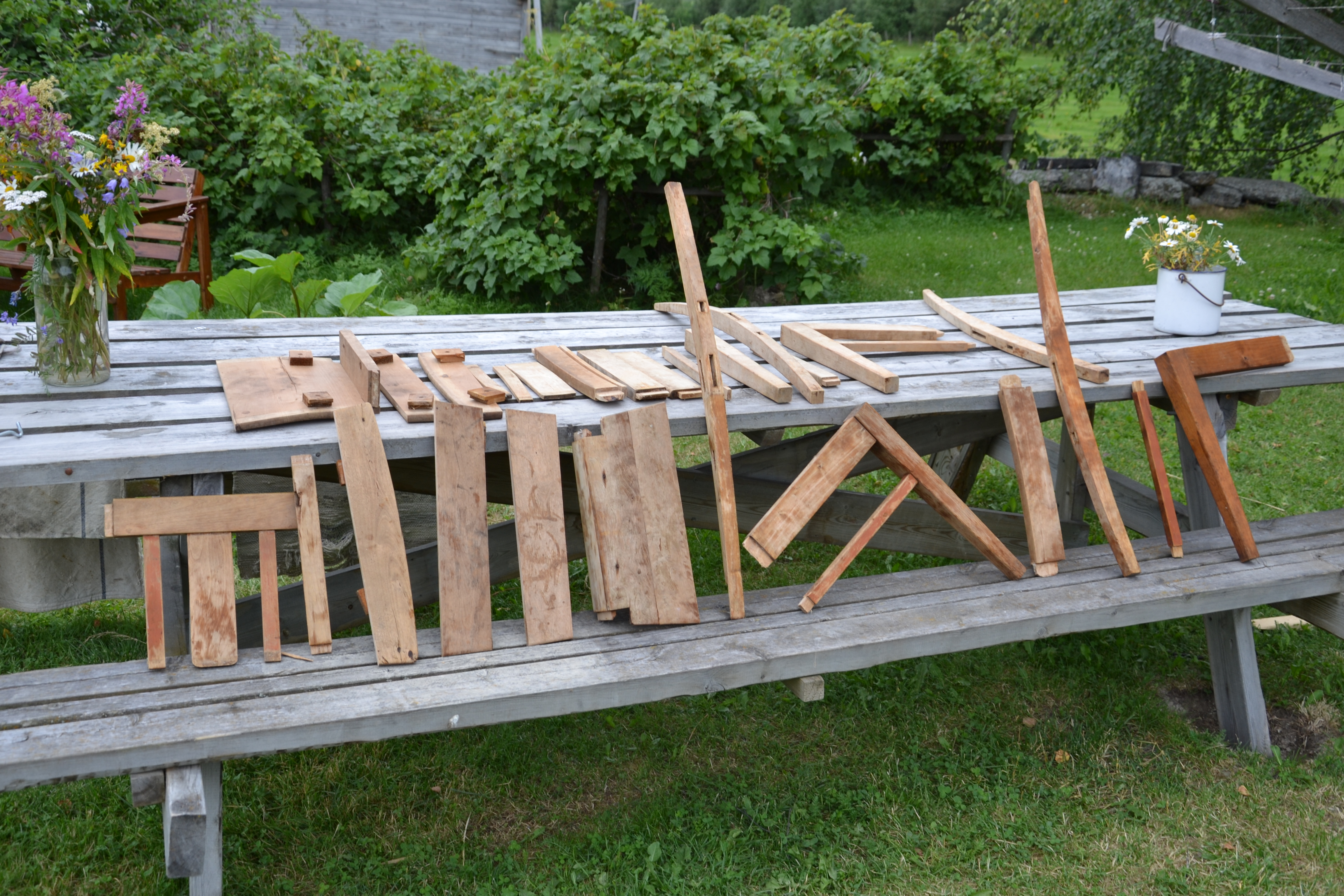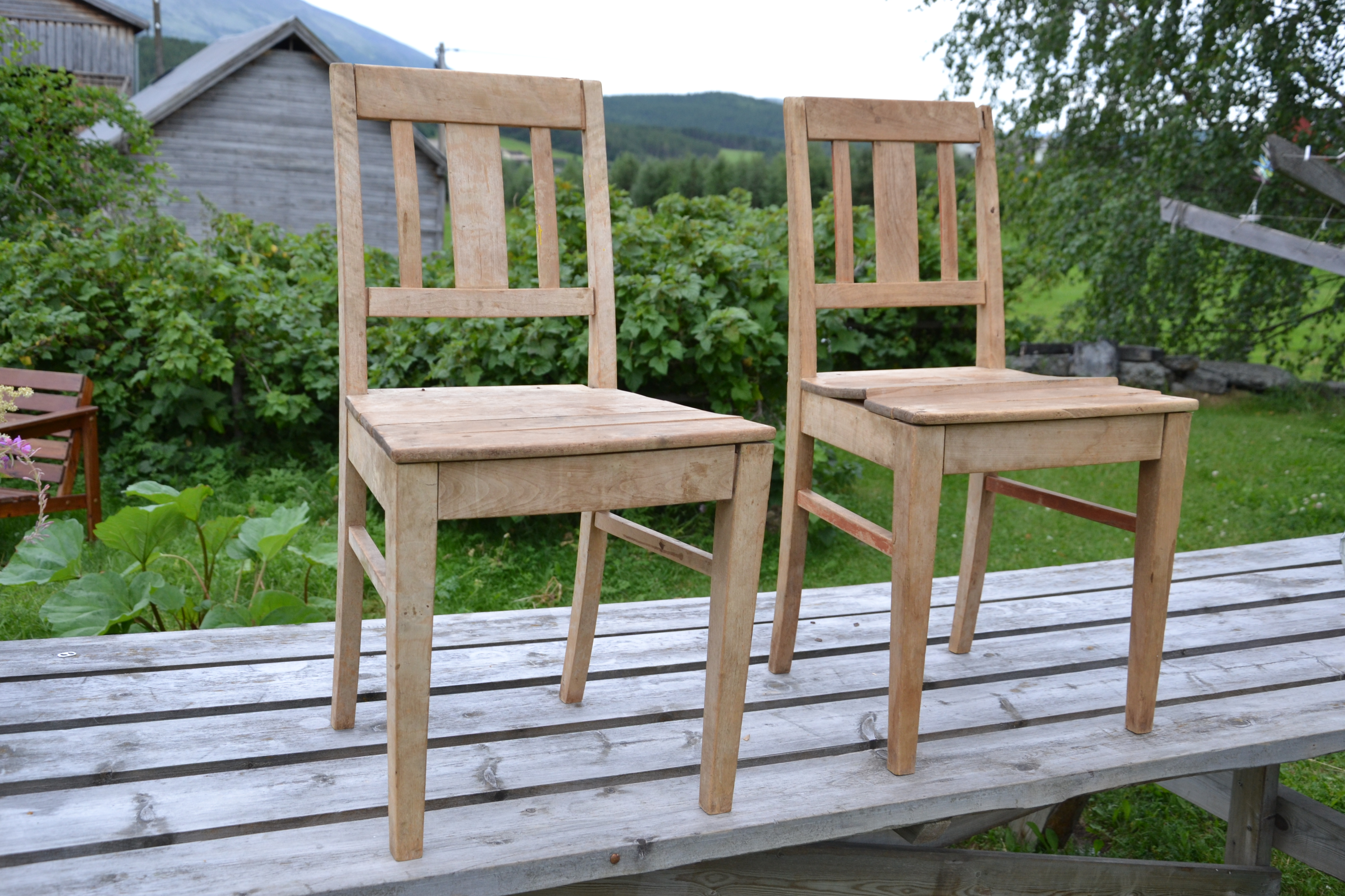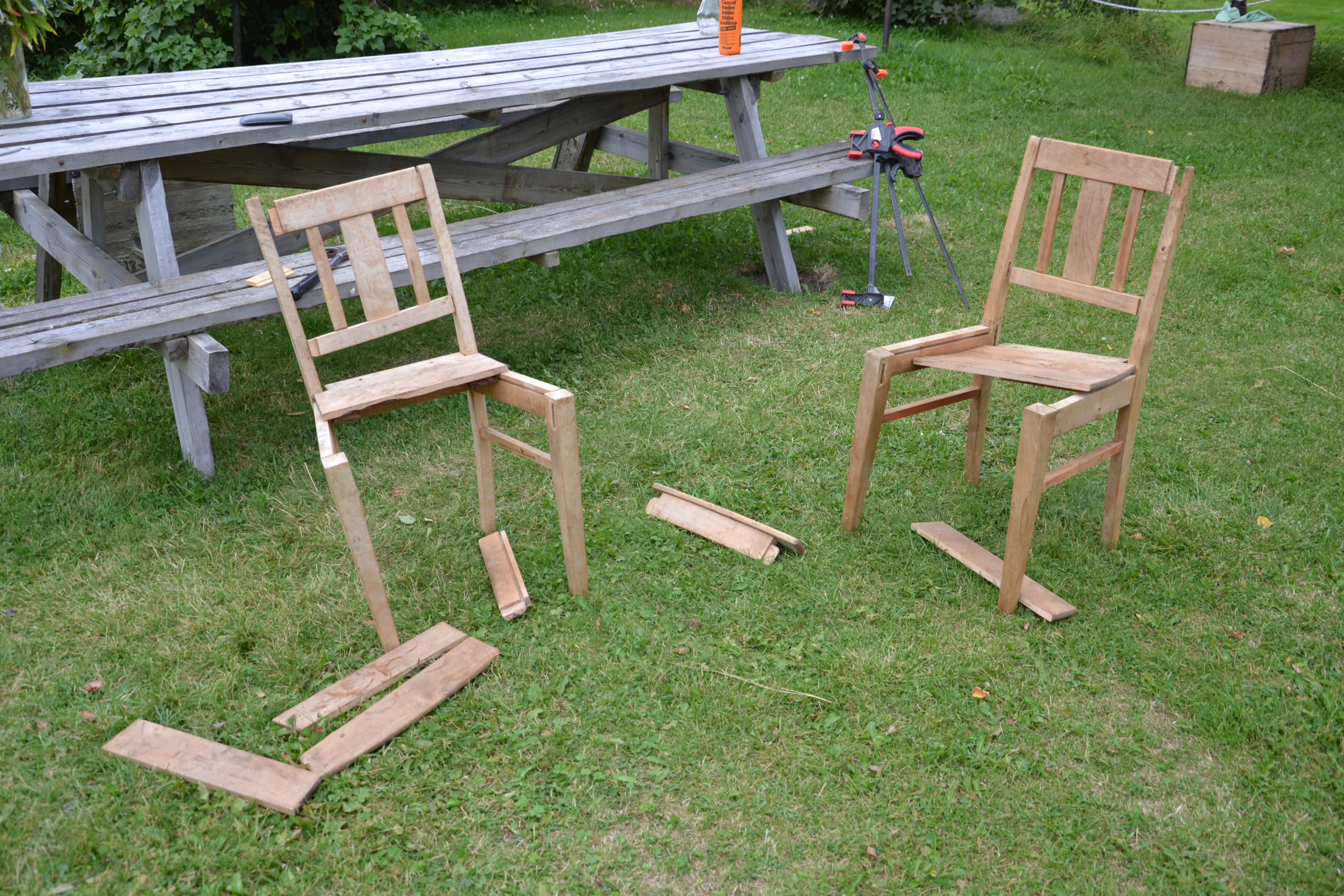 I et av våre mange ryddeprosjekter dukket det opp to stoler – det vil si, deler av stoler – som vi håpet ville utgjøre to hele stoler når de ble satt sammen. Med friskt mot satte jeg i gang. Først tok jeg alle bitene enda litt mer fra hverandre for så å vaske dem grundig. Treverket liknet bjørk, og så veldig bra ut. Delene ble satt utover for å tørke, og deretter begynte puslingen. Det viste seg å skulle bli vanskeligere enn antatt. Da jeg trodde at jeg hadde skjønt det, og fått bitene sammen, raste det fra hverandre igjen – eller bitene måtte tvinges sammen med makt – altså åpenbart ikke riktig. Delene var jo ikke merket, og jeg forsto at jeg brukte biter til en stol som var ment til to forskjellige stoler. Til slutt fikk jeg det likevel til, tror jeg i hvert fall. Problemet nå er at de ikke er limt – og derfor må tas fra hverandre igjen. Men da skal jeg ha med meg hjelp til å holde, for jeg opplevde flere ganger at stolen falt fra hverandre, og så skal delene merkes.
