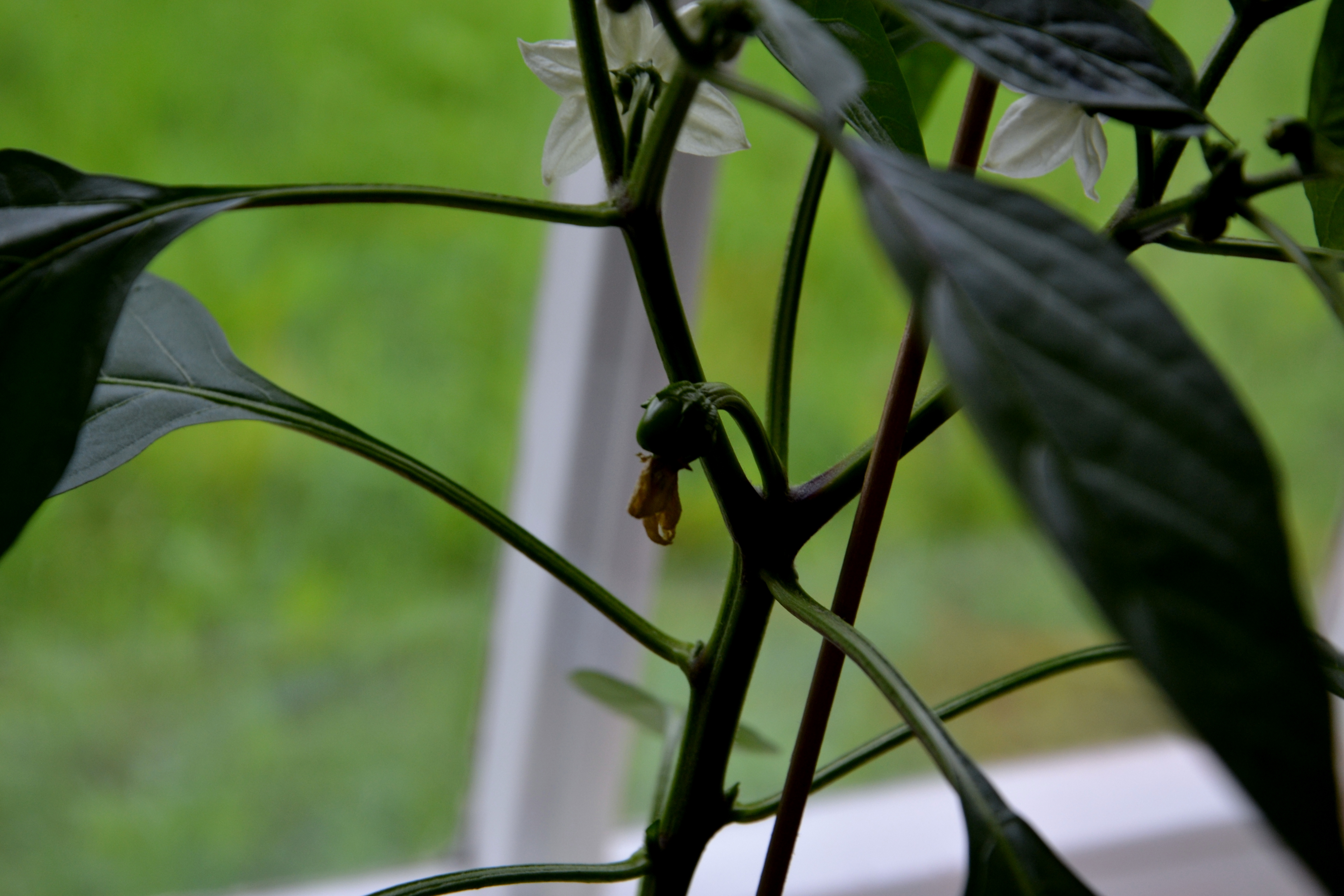 Paprikaplanten har jammen begynt å bære frukter! En bitteliten paprikababy vokser frem etter at blomsten har visnet, og flere kommer