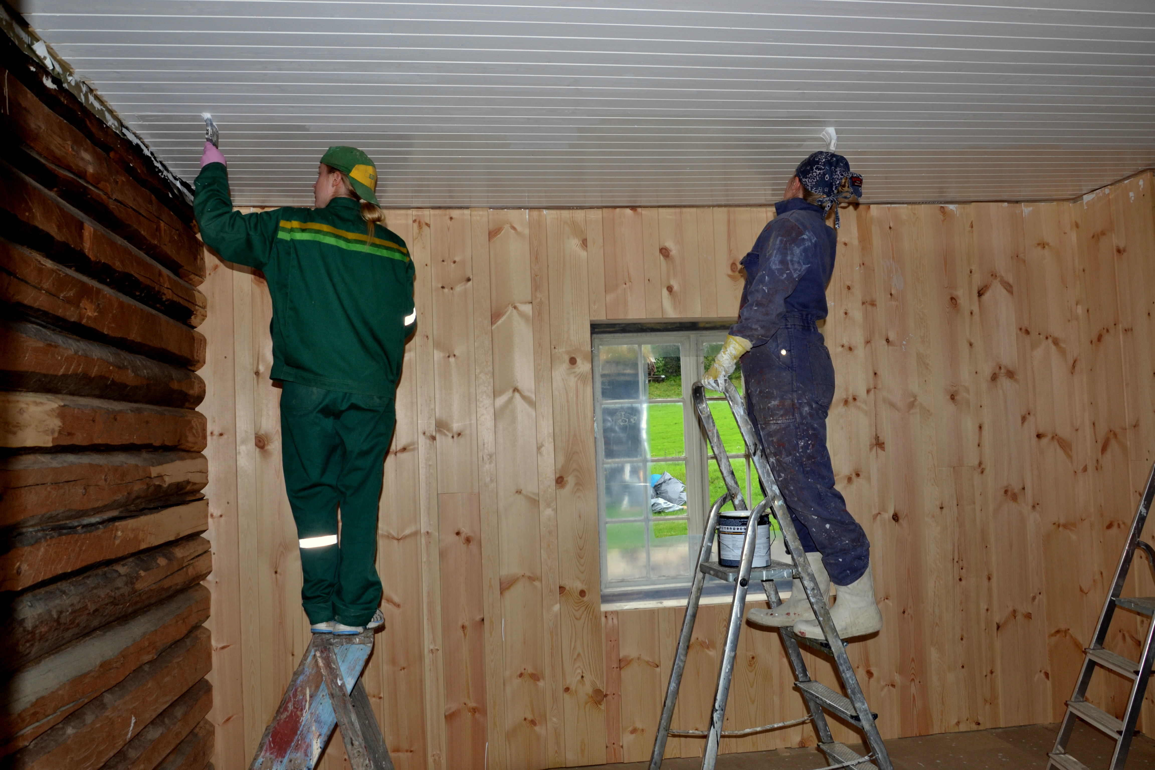 Taket i stua har blitt malt hvitt og blankt