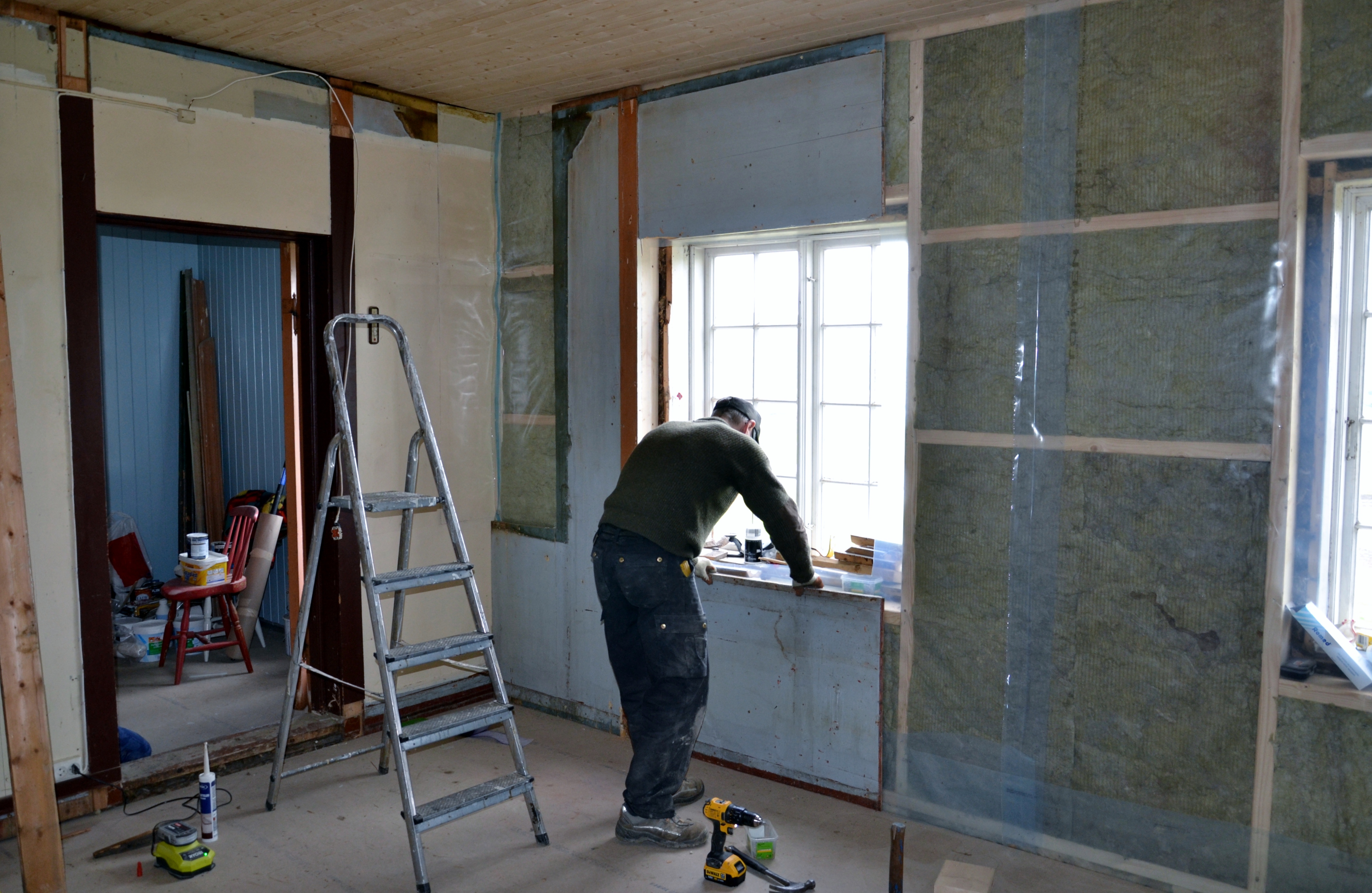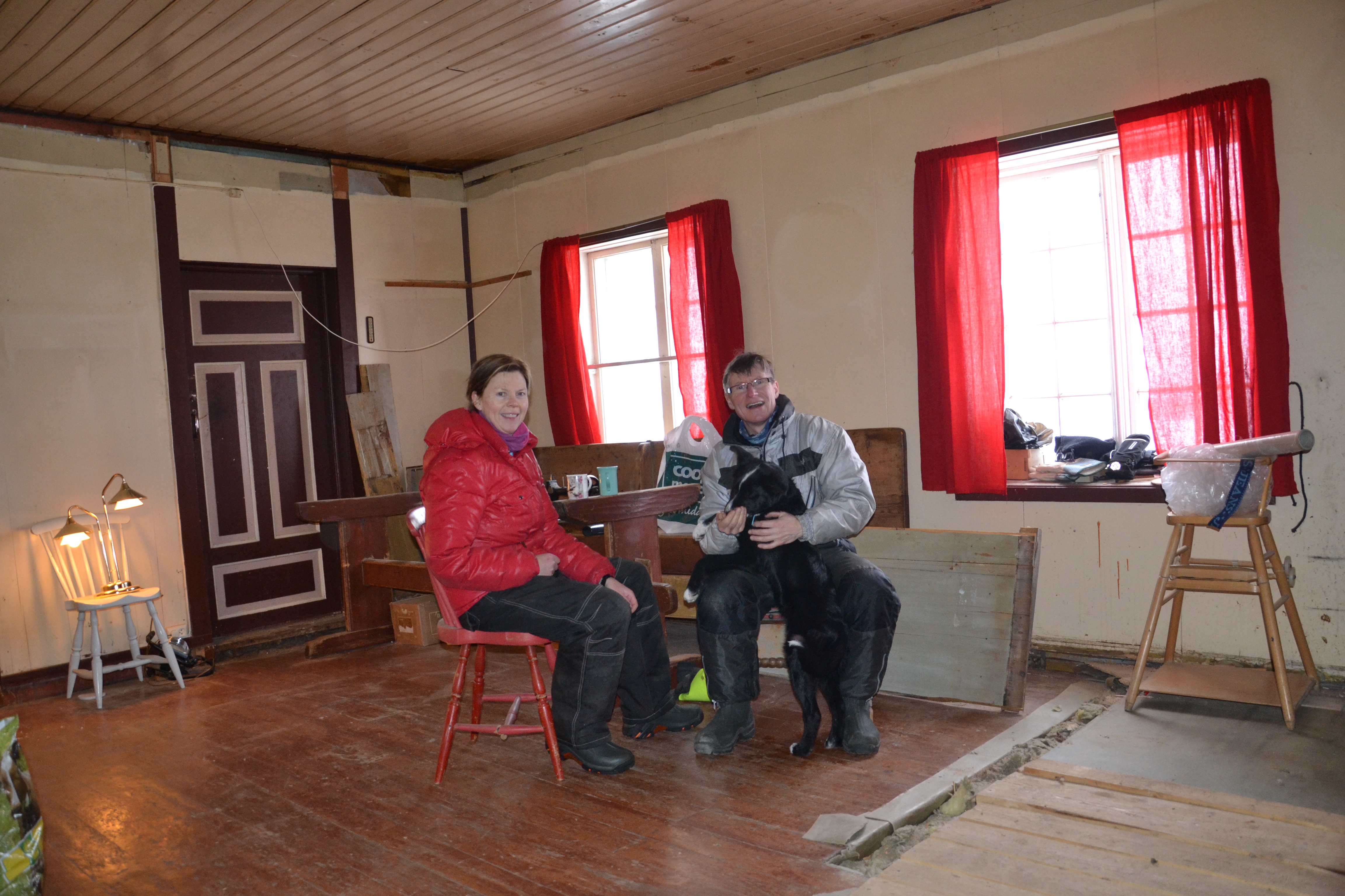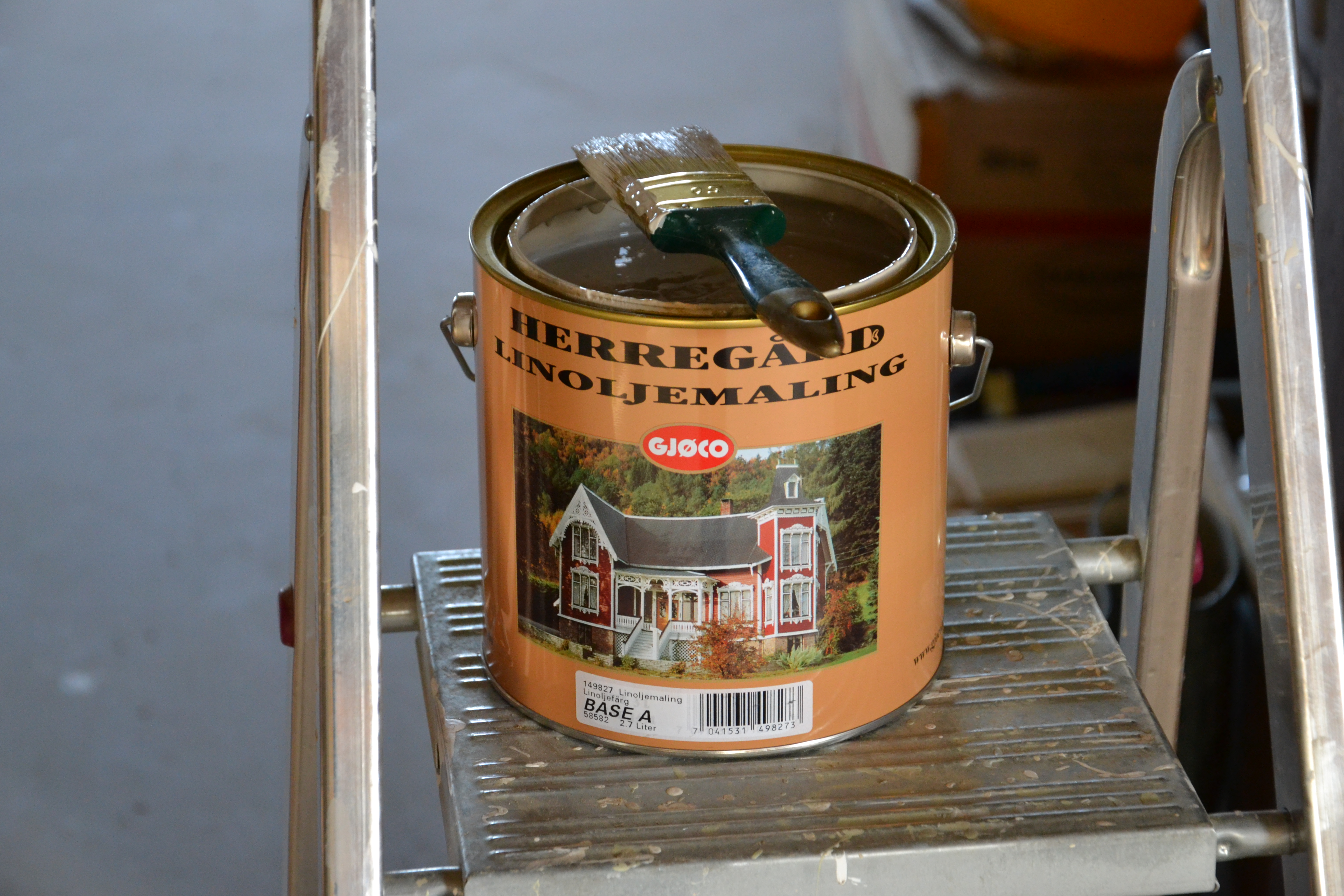 Jeg har sett frem til å starte malingen på kjøkkenet – eller kanskje jeg skal si at jeg har vært veldig spent på hvordan det vil ta seg ut. Vi bestemte oss for å bruke linoljemaling på den gamle veggen. Den består av et spesielt panel, håndlaget av tjukke furubord, satt tett sammen slik at de danner en bred, glatt plate. Mellom platene er det satt smale, flate bord, noen millimeter tjukkere enn de brede platene og som binder dem sammen. Ved å gå ut fra farger vi har funnet på det gamle panelet, har vi bestemt oss for en lys blå-turkis farge, som likner mye på en av originalfargene. Det var ikke så lett å se hvilken av fargene som var originale, for det var svært mange sjatteringer av blått/turkis. Nå er to strøk malt, og resultatet så langt ser lovende ut. Stolpene mellom skal få en gråfarge, og gulvet vil vi male likt dem. Litt tungvint med linoljemaling, både fordi den har rykte på seg å være spesiell og vanskelig å få til, men mest fordi den slett ikke er å få tak i her vi bor (bortsett fra om vi bestiller store kvantum). Dermed må jeg ut på tur for å handle malingen. Bygger’n på Os, rundt fire mil nordover mot Røros, er heldigvis behjelpelige med i hvert fall treliters spann. Tidligere kunne vi få en-liters bokser også, men det er visst ikke lenger i produksjon, dessverre.