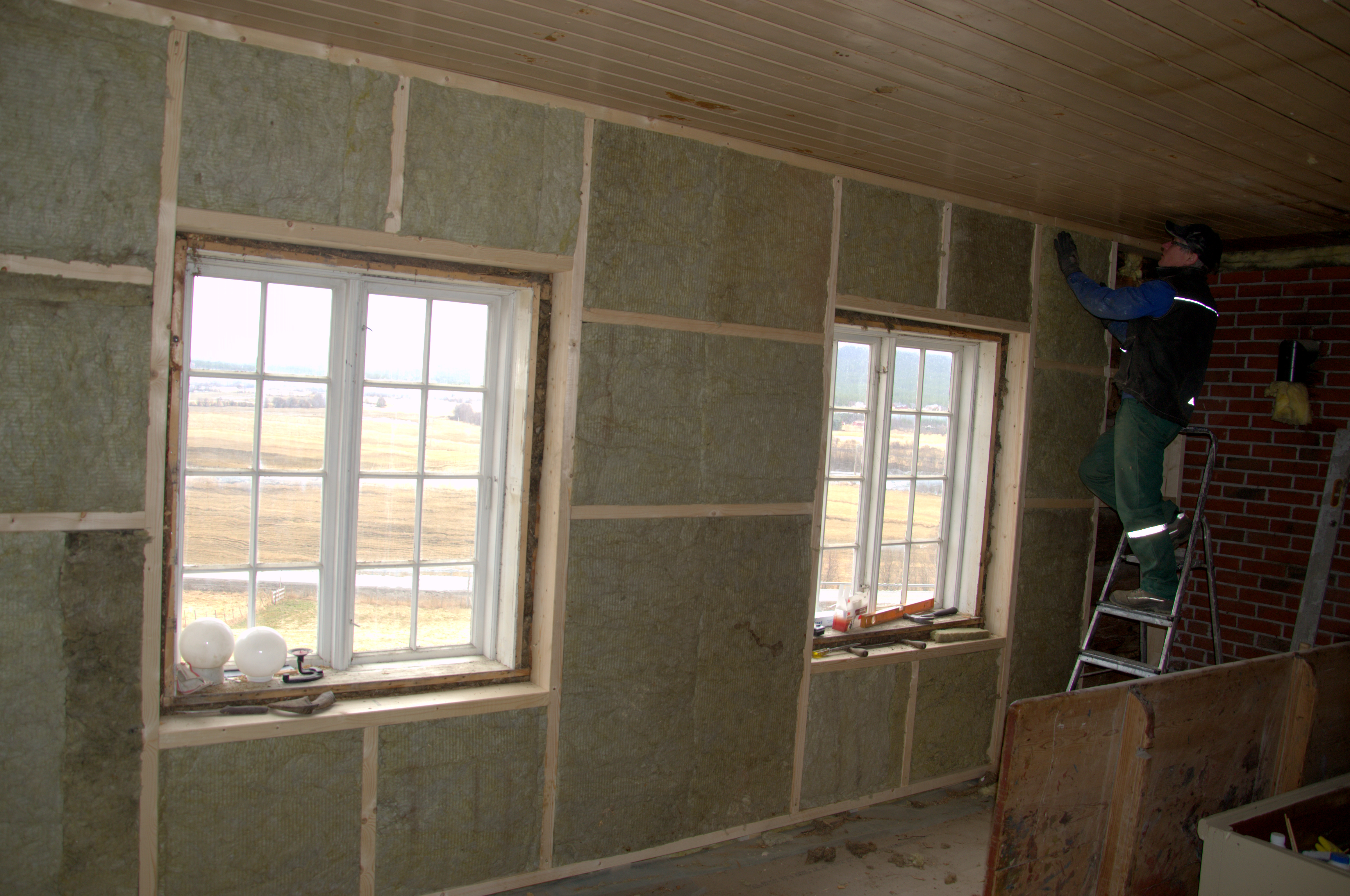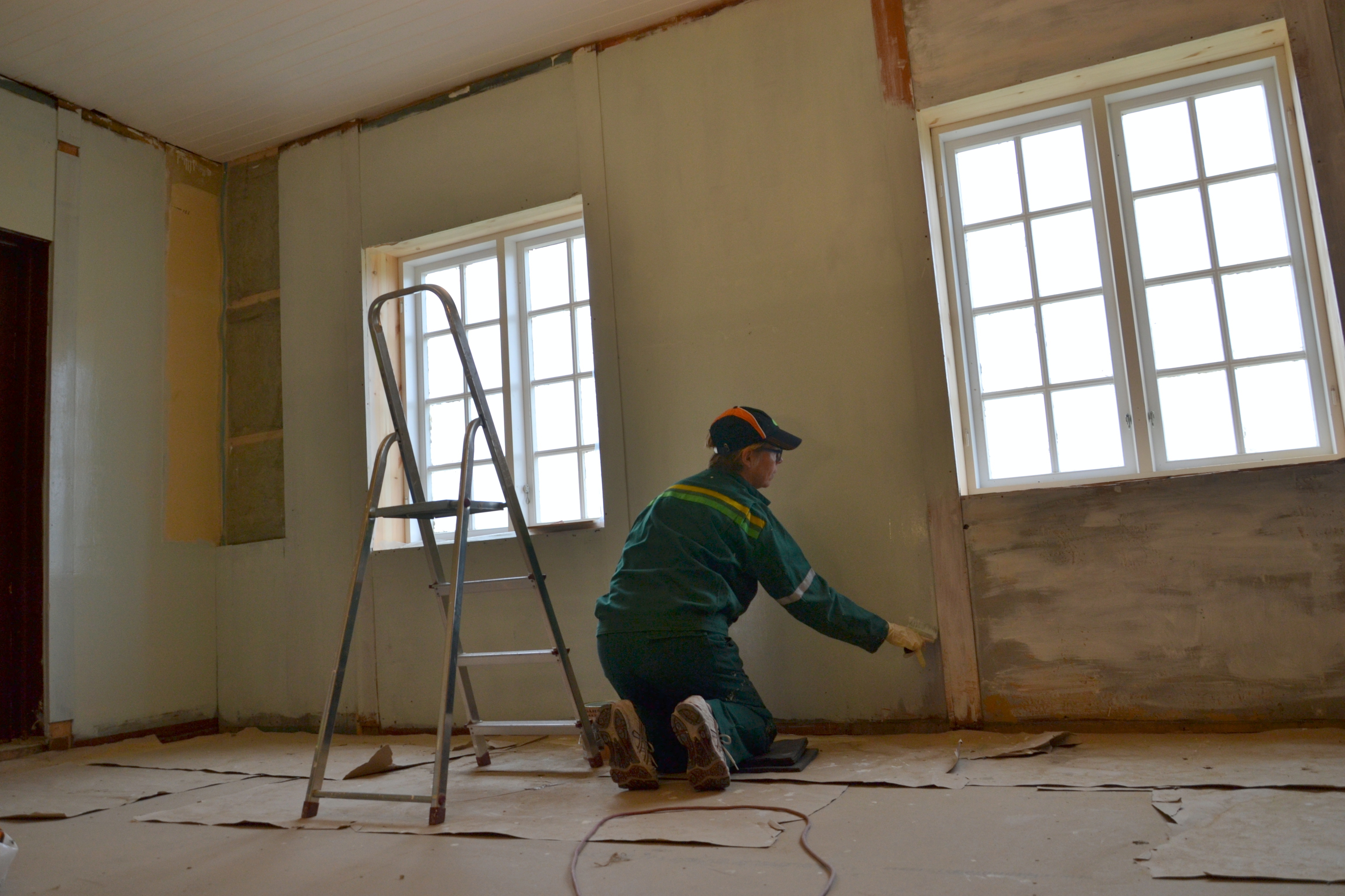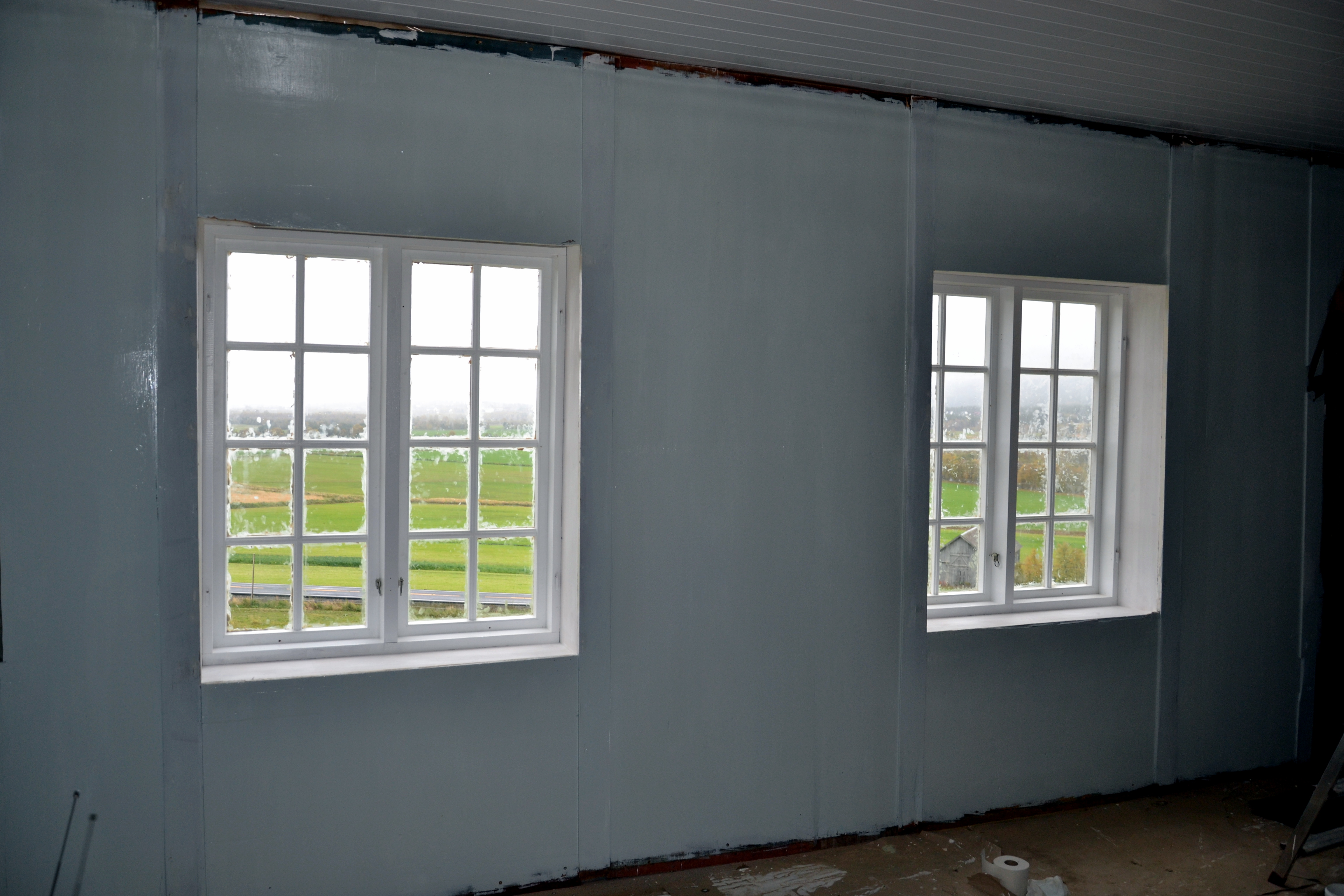 Jeg har sett frem til å starte malingen på kjøkkenet – eller kanskje jeg skal si at jeg har vært veldig spent på hvordan det vil ta seg ut. Vi bestemte oss for å bruke linoljemaling på den gamle veggen. Den består av et spesielt panel, håndlaget av tjukke furubord, satt tett sammen slik at de danner en bred, glatt plate. Mellom platene er det satt smale, flate bord, noen millimeter tjukkere enn de brede platene og som binder dem sammen. Ved å gå ut fra farger vi har funnet på det gamle panelet, har vi bestemt oss for en lys blå-turkis farge, som likner mye på en av originalfargene. Det var ikke så lett å se hvilken av fargene som var originale, for det var svært mange sjatteringer av blått/turkis. Nå er to strøk malt, og resultatet så langt ser lovende ut. Stolpene mellom skal få en gråfarge, og gulvet vil vi male likt dem. Litt tungvint med linoljemaling, både fordi den har rykte på seg å være spesiell og vanskelig å få til, men mest fordi den slett ikke er å få tak i her vi bor (bortsett fra om vi bestiller store kvantum). Dermed må jeg ut på tur for å handle malingen. Bygger’n på Os, rundt fire mil nordover mot Røros, er heldigvis behjelpelige med i hvert fall treliters spann. Tidligere kunne vi få en-liters bokser også, men det er visst ikke lenger i produksjon, dessverre.