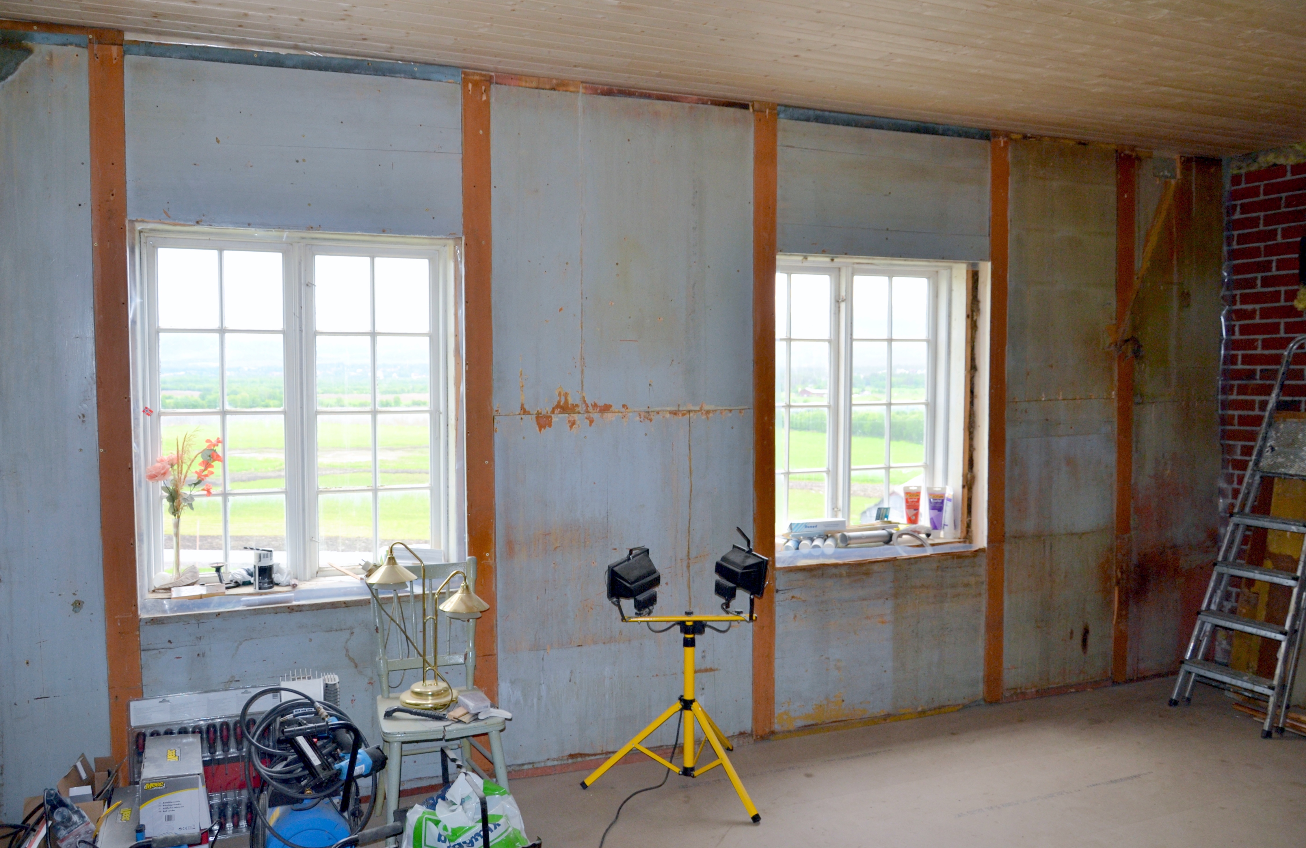 Hei Mads! Så artig måte å gjøre det på! Vi får se hva det blir til her, tar uansett pause i dag og vil se hvordan det ser ut når det tørker skikkelig 🙂 Vi har i hvert fall valgt å beholde riper og hakk i panelet, etter års bruk. Det gjør det også litt mer levende enn om det skulle sparkles og pusses helt glatt. Da kunne vi vel like gjerne ha brukt nye plater. Måtte imidlertid sparkle litt noen store sprekker mellom et par plater, men etter de to strøkene ser det ut til at sparkelen ikke synes gjennom.