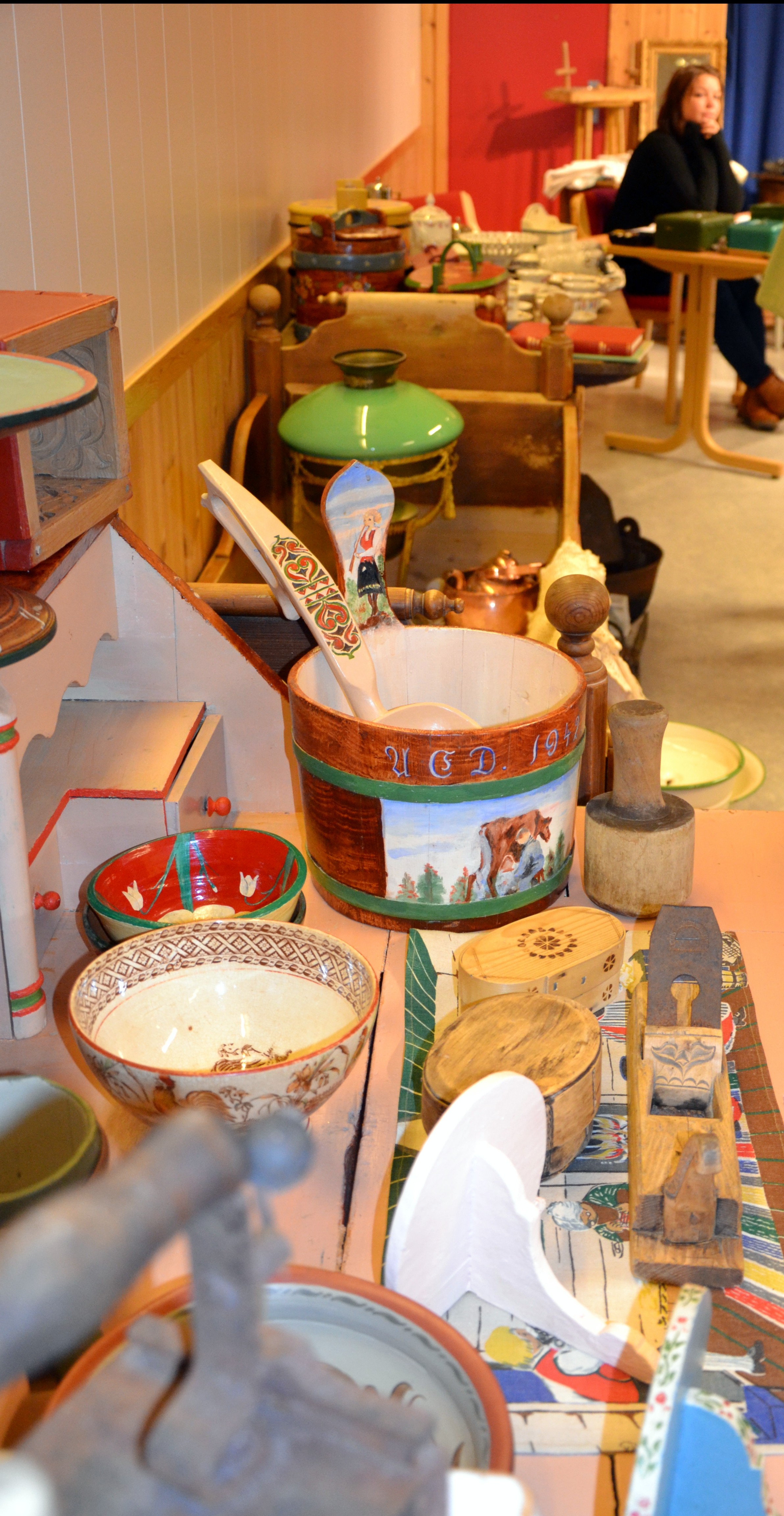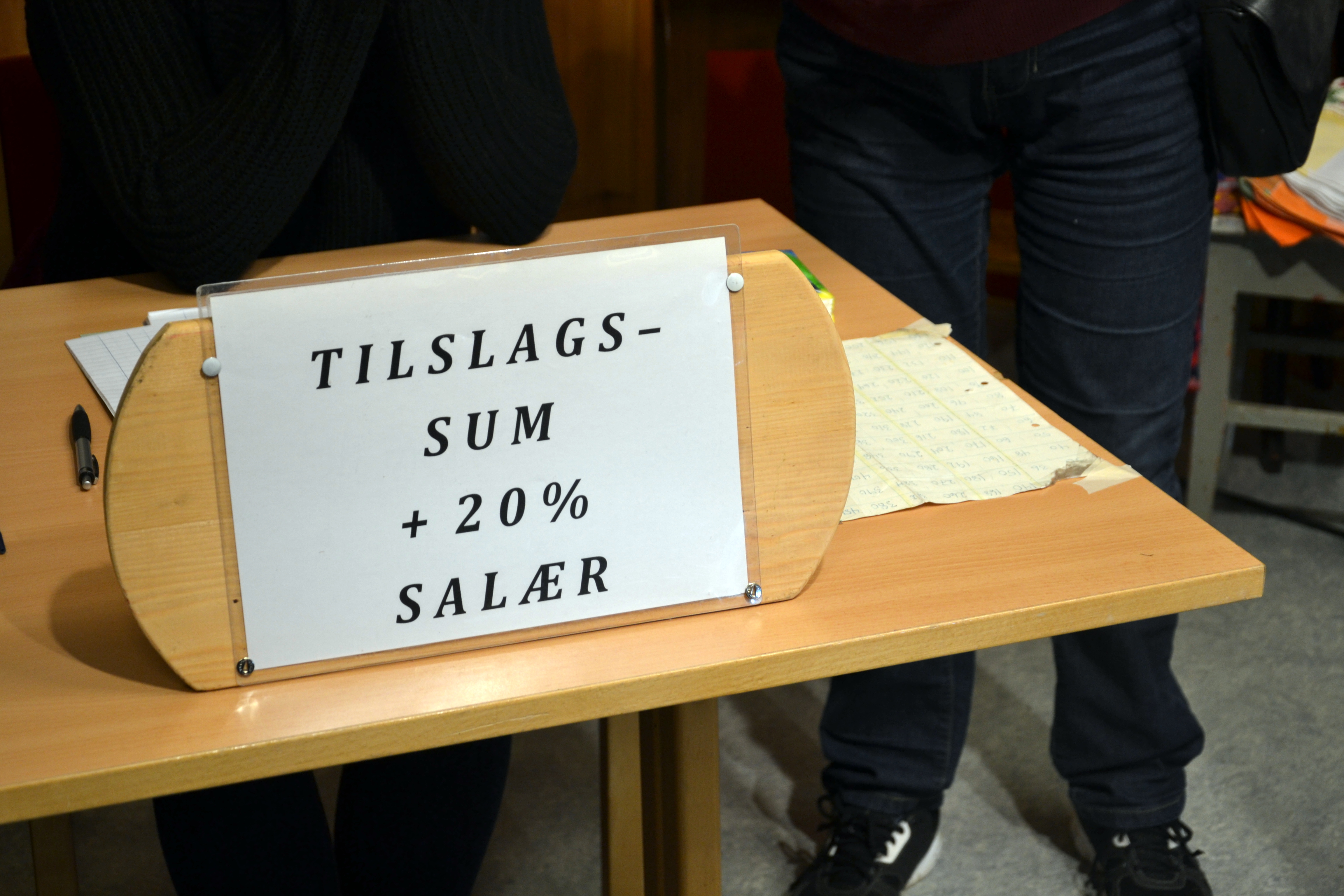 Bak rekken med auksjonsgjenstander skimter vi Ola Ryes eldste datter som sitter klar i sekretariatet. Sammen med moren holder hun styr på hvem som får tilslag og til hvilke summer