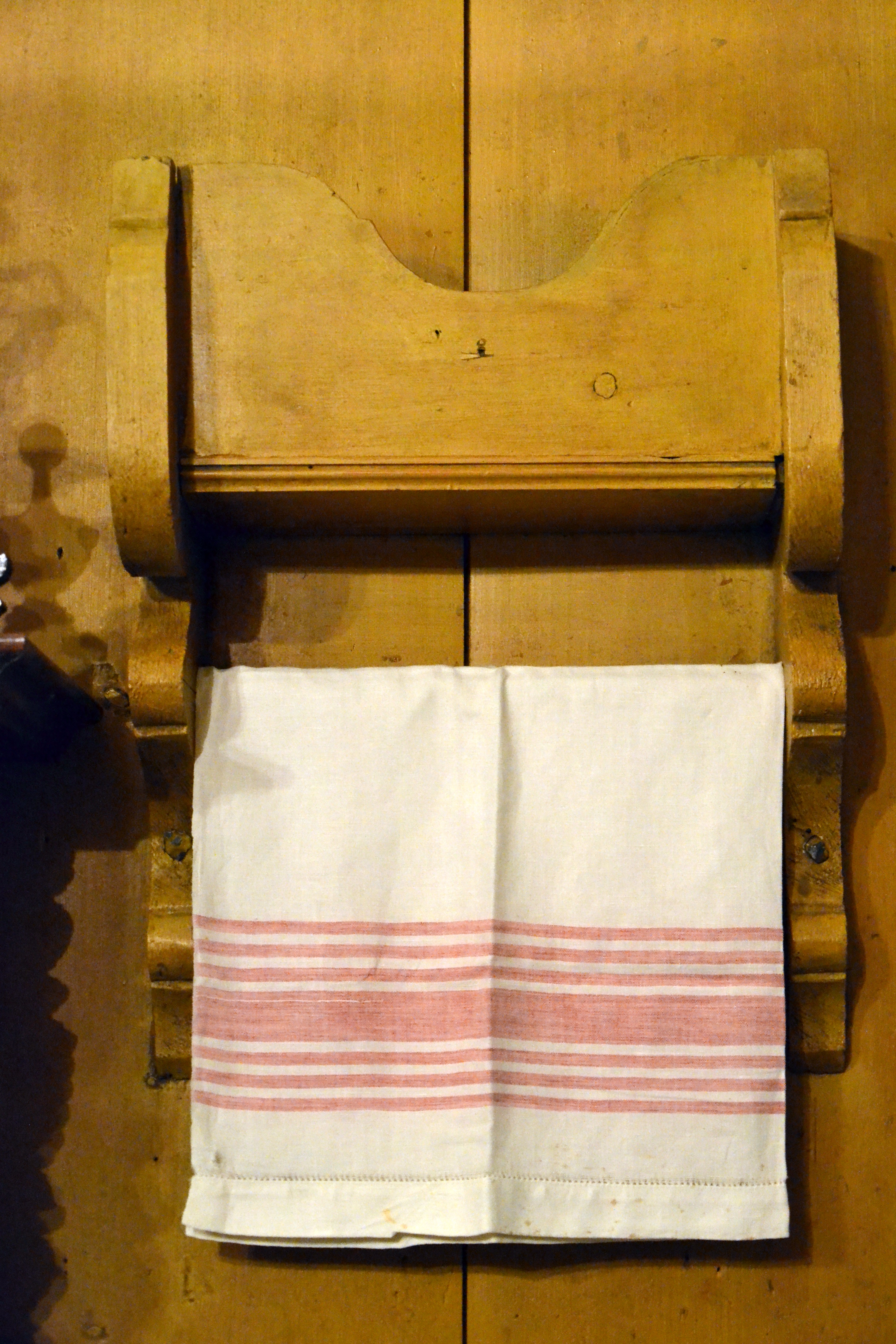 Lurer på om noen vet hva denne ble brukt til? Det er en slags dyp hylle eller «eske» med en stang under (her henger det et pyntehåndkle på stangen). Hylla er lita og nett, bare 34 cm bred og total høyde er 43cm. Hylla vår er malt i samme okergule farge som veggen i gammelstua. Vi har funnet et par andre liknende hyller som har vært litt forskjellige i utformingen – og dessverre også litt ødelagte. Jeg syns den er fin og dekorativ, og skulle gjerne visst mer om hva den har vært brukt til opprinnelig.