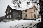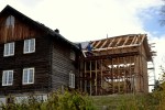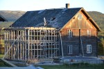 Det eldgamle våningshuset er i ferd med å få et moderne tilskudd i form av bad og vaskerom. Tilbygget er i to etasjer. Det er laget i stavlaft, en byggeteknikk som vi kjenner best fra de gamle stavkirkene som ble bygget frem til 1500-tallet. Det lages en ramme med topp- og bunnsvill med hjørnestaver. Inni denne rammen felles det inn stående veggplanker, som danner en jevn vegg. Gavlen på tilbygget er laftet. Det er Svein Olav Nymoen som sammen med sin kompanjong, Tor, står for arbeidet her. Innvendig gjør vi mesteparten selv, med unntak av isolering, samt paneling i tak i andre etasje. Etter først å ha avrettet gulvet og lagt membran – alt etter våtromsnormen, har vi startet flislegging på vaskerommet. Snart skal skillevggene settes opp og paneles. Nå hviler vi først våre ømme rygger og såre knær.