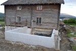 - Grunnmuren er satt og det er laget en ramme, bunnsviller, rundt det hele