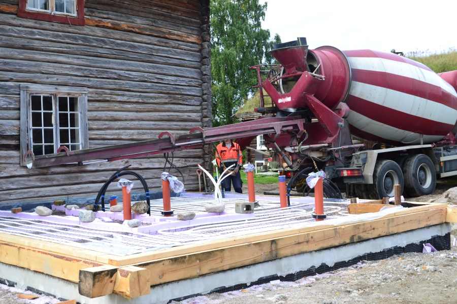 Vannrørene til varme er også på plass, og det støpes over