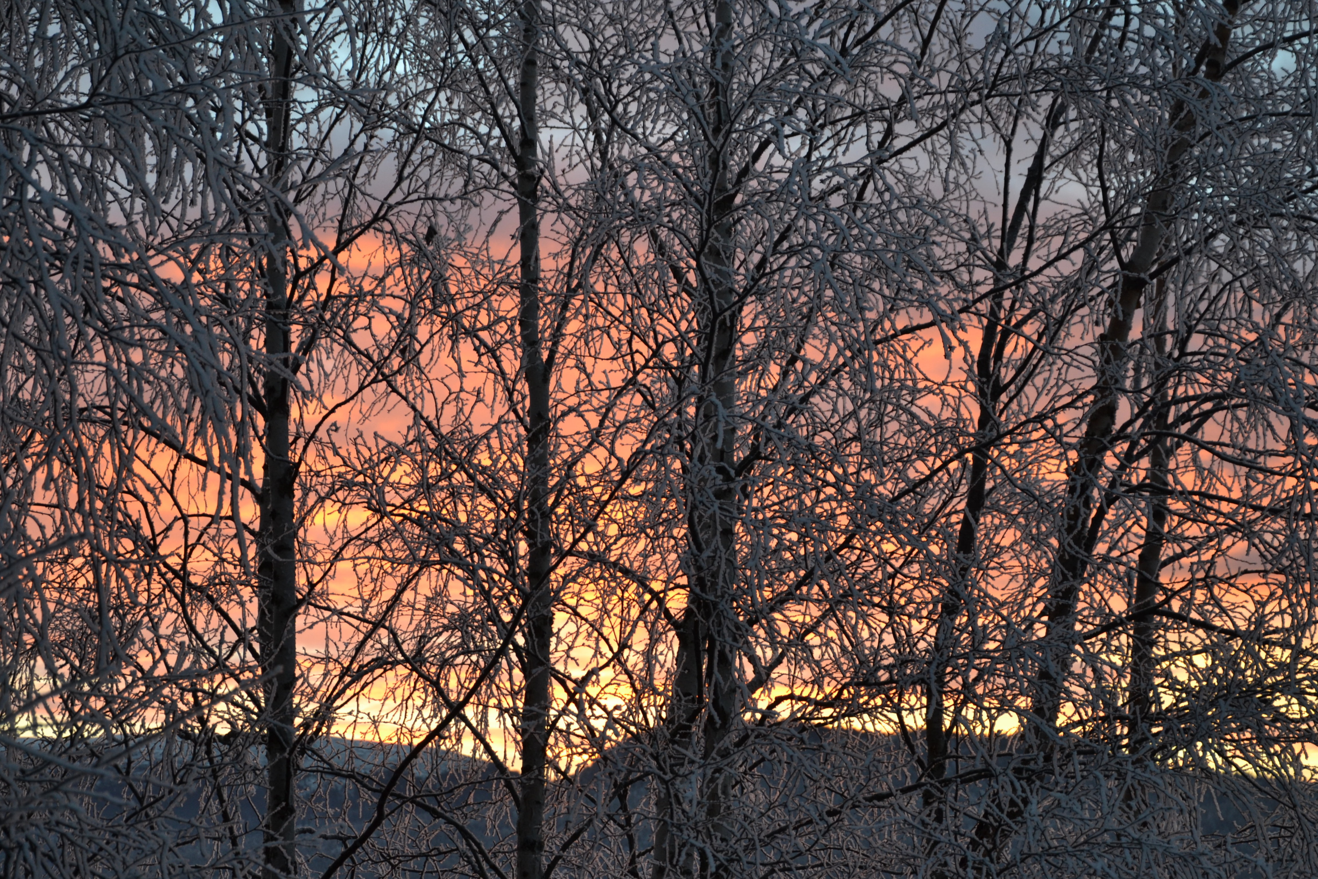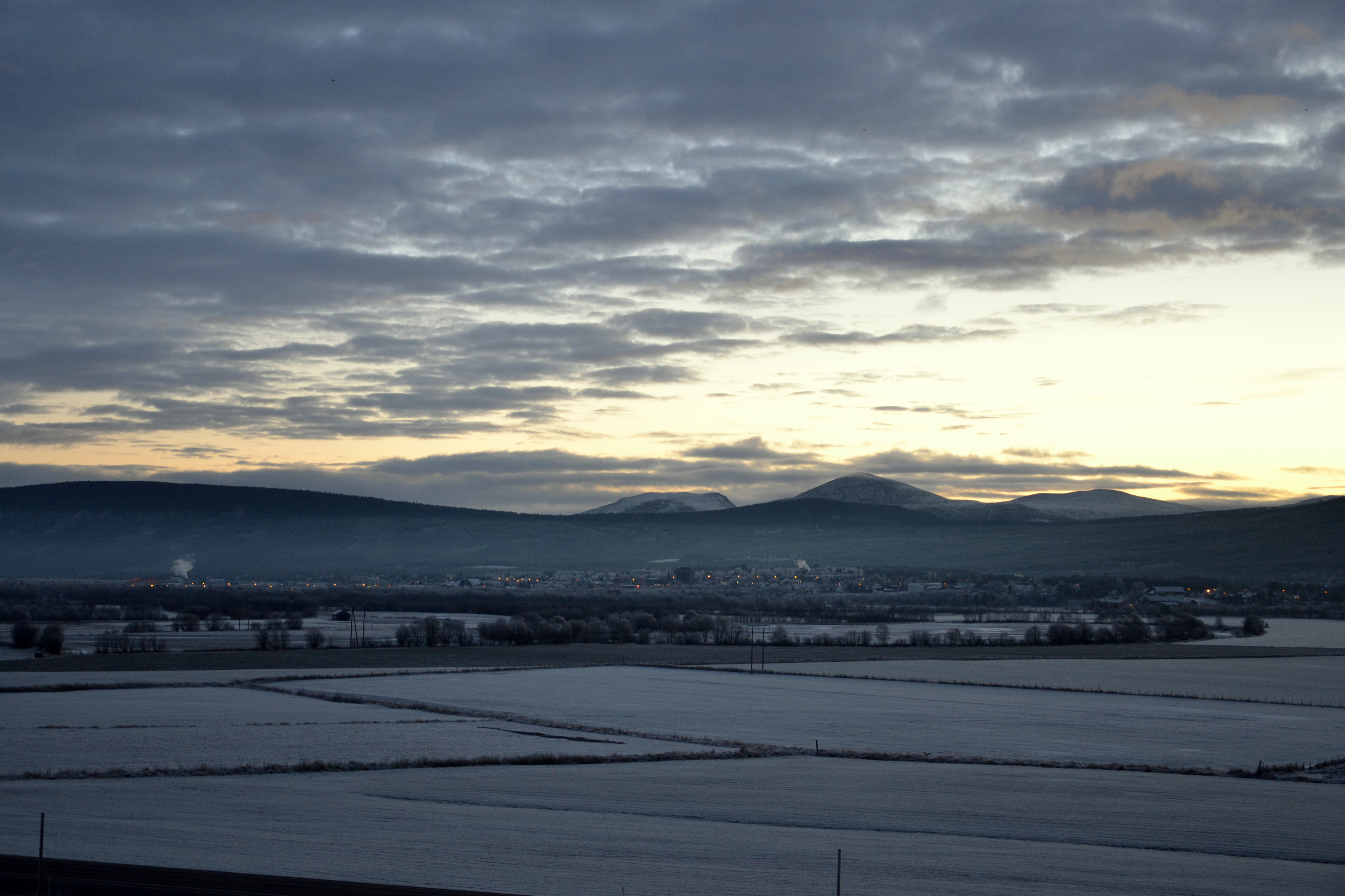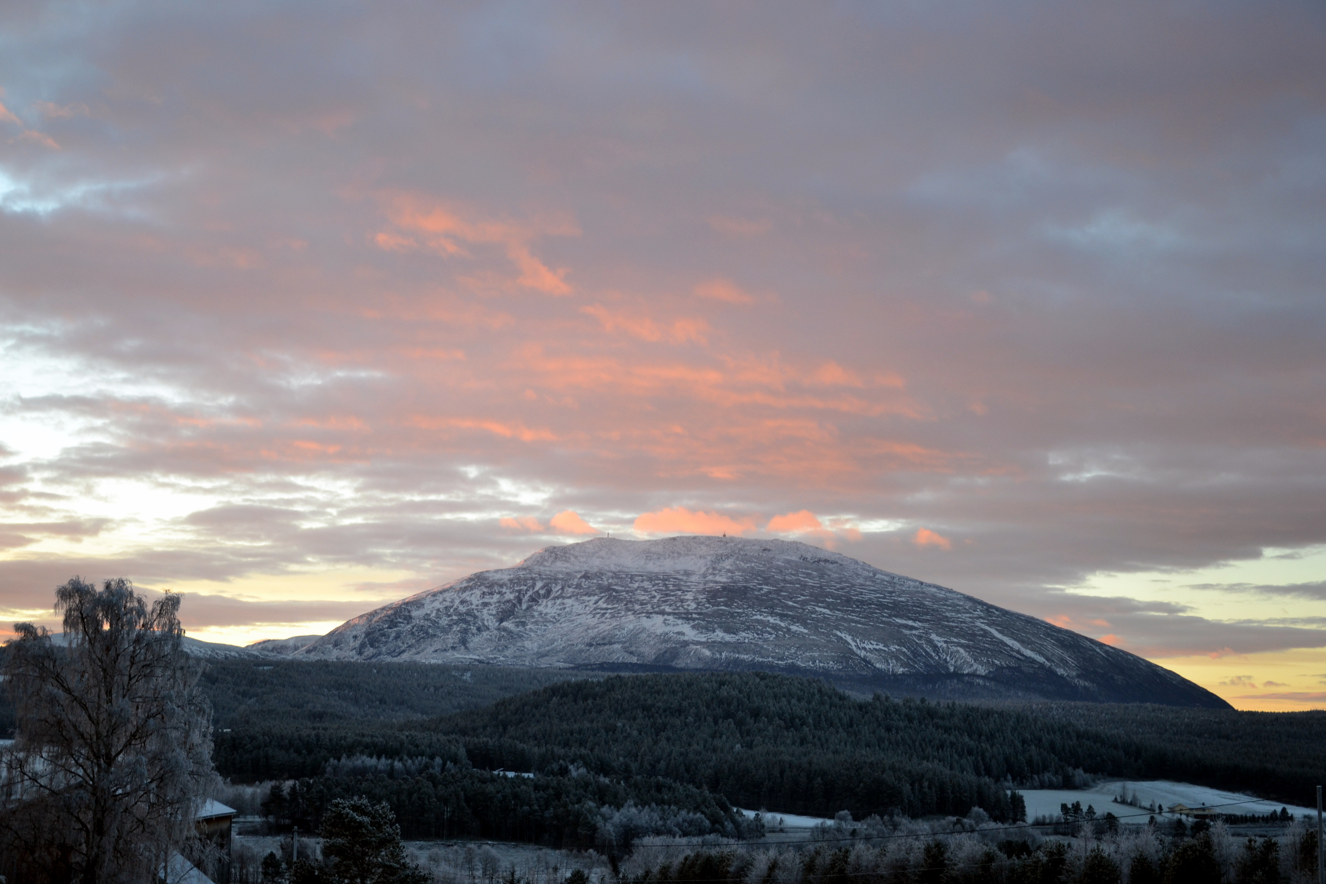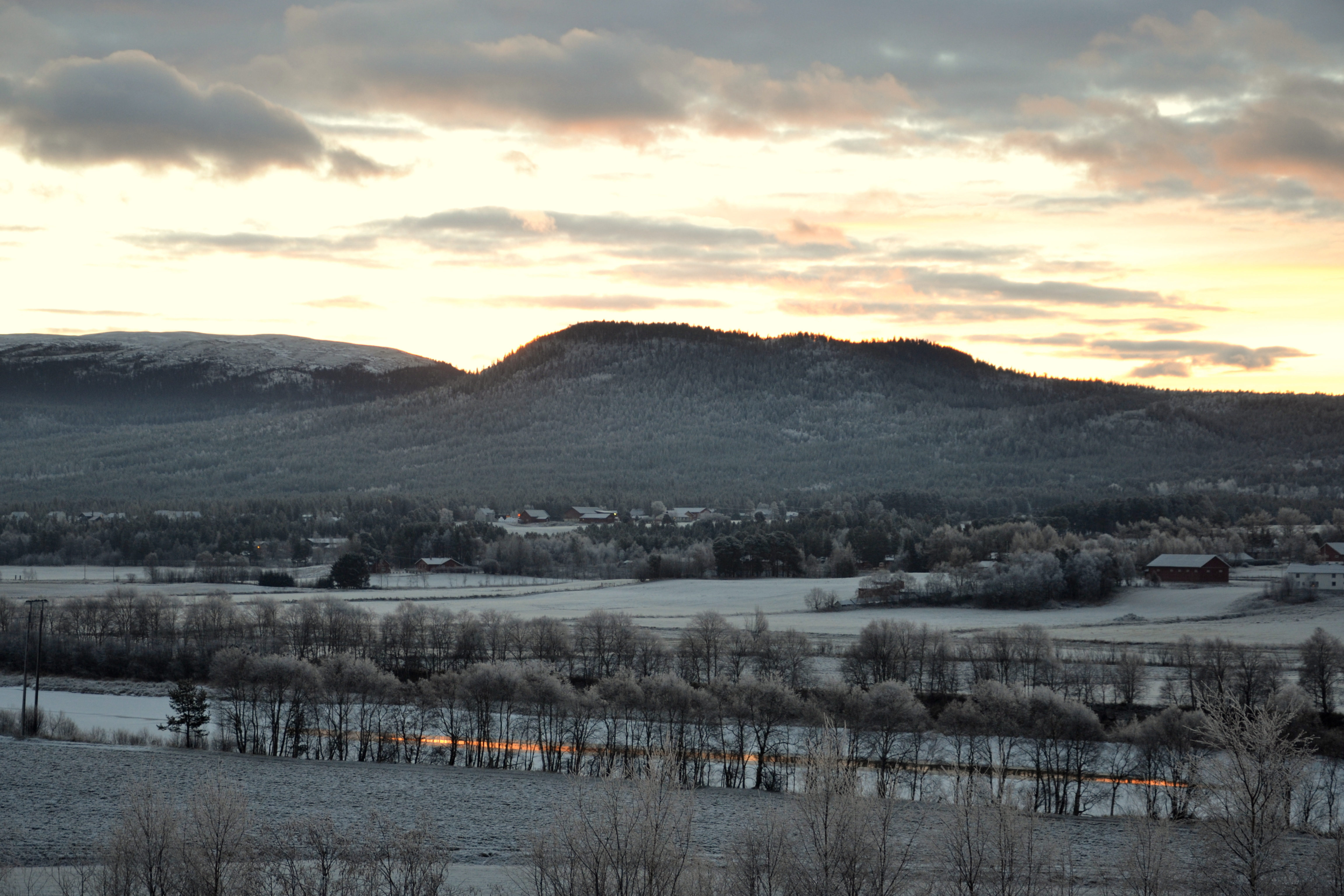 Vakker soloppgang over Tynset i går! Da jeg kom ut på tunet i grålysningen og kikket mot bygda, var det nærmest som om alt var i svart-hvitt. Grålysningen er altså et veldig passende ord. Den bleke himmelen ble langsomt farget pastellrosa og fersken og etter hvert nærmest eksploderte den i en flom av rødoransje. Vi så solstrålene, men selve solskiva ville ikke vise seg. Når den endelig nådde over kanten av åsen, var den nemlig dekket av skyer og det hele var over. Inni hodet mitt hørte jeg Morgenstemning av Grieg mens jeg sto og småfrøs og var vitne til denne nydelige morgenstunden. Her deler jeg noe av det vi så:
