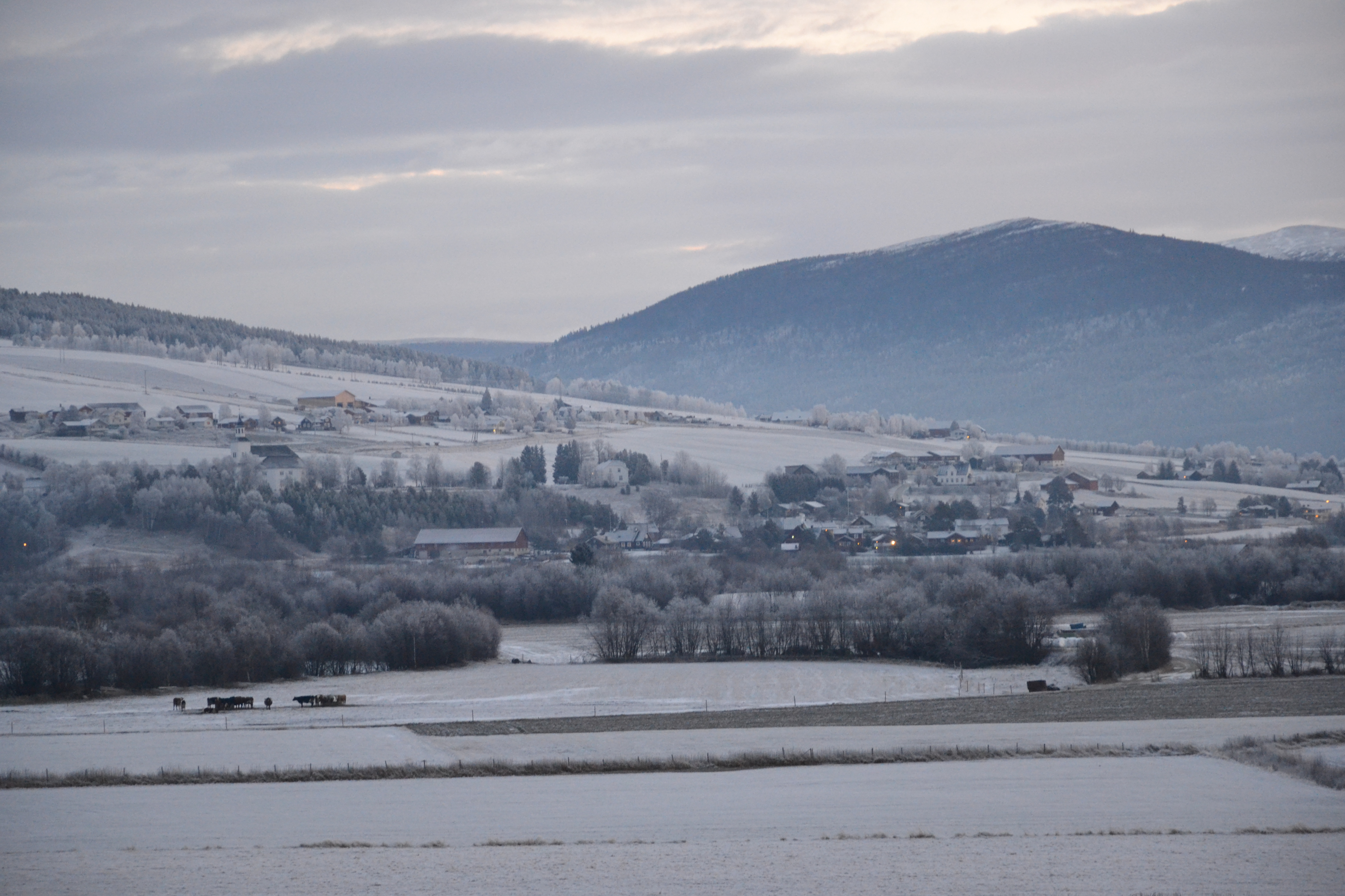 Bygda er grå, eller kanskje også litt blå denne kalde, tidlige novembermorgenen. Naboens kyr trives ute tross kulda og flokker seg på åkeren som de pleier