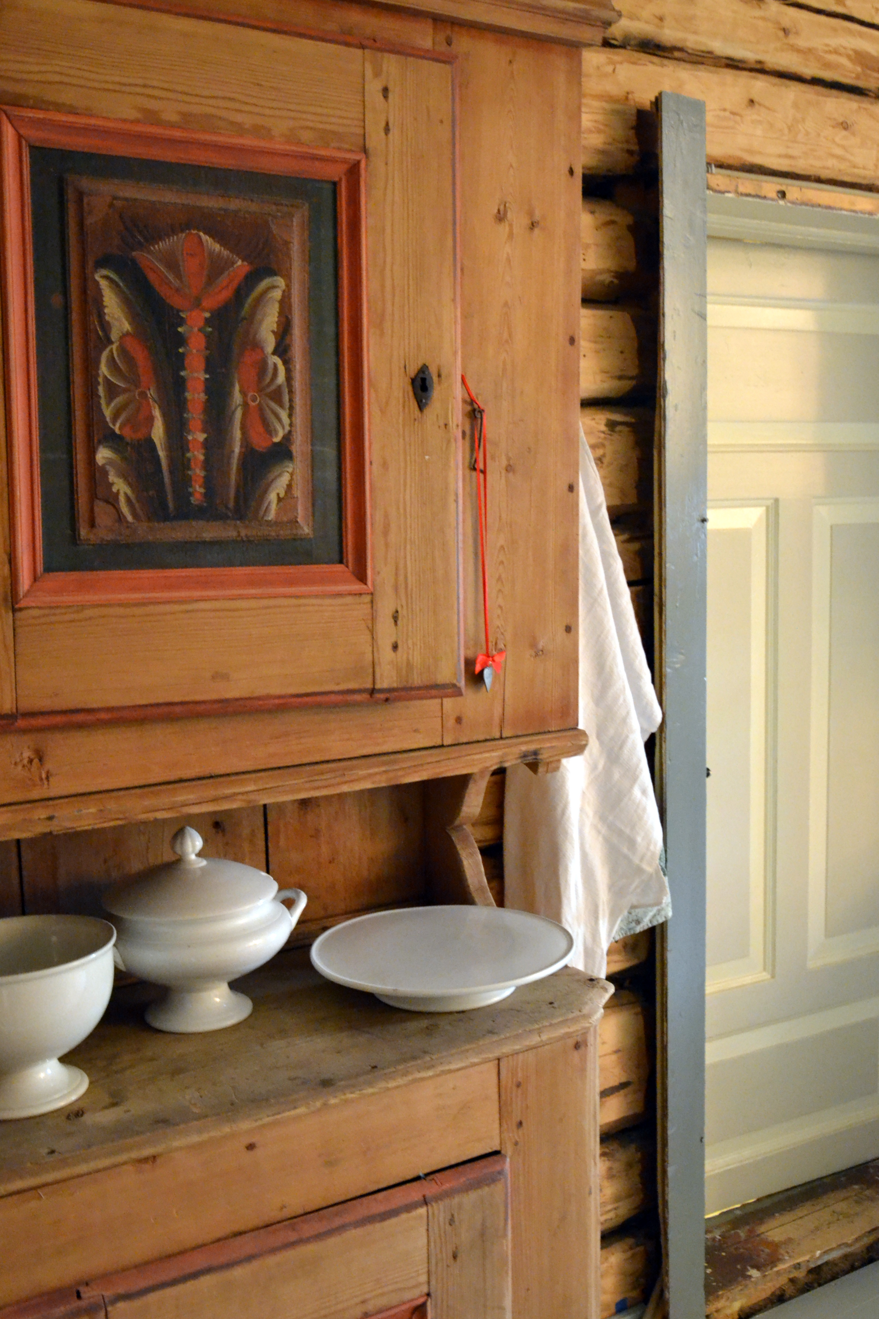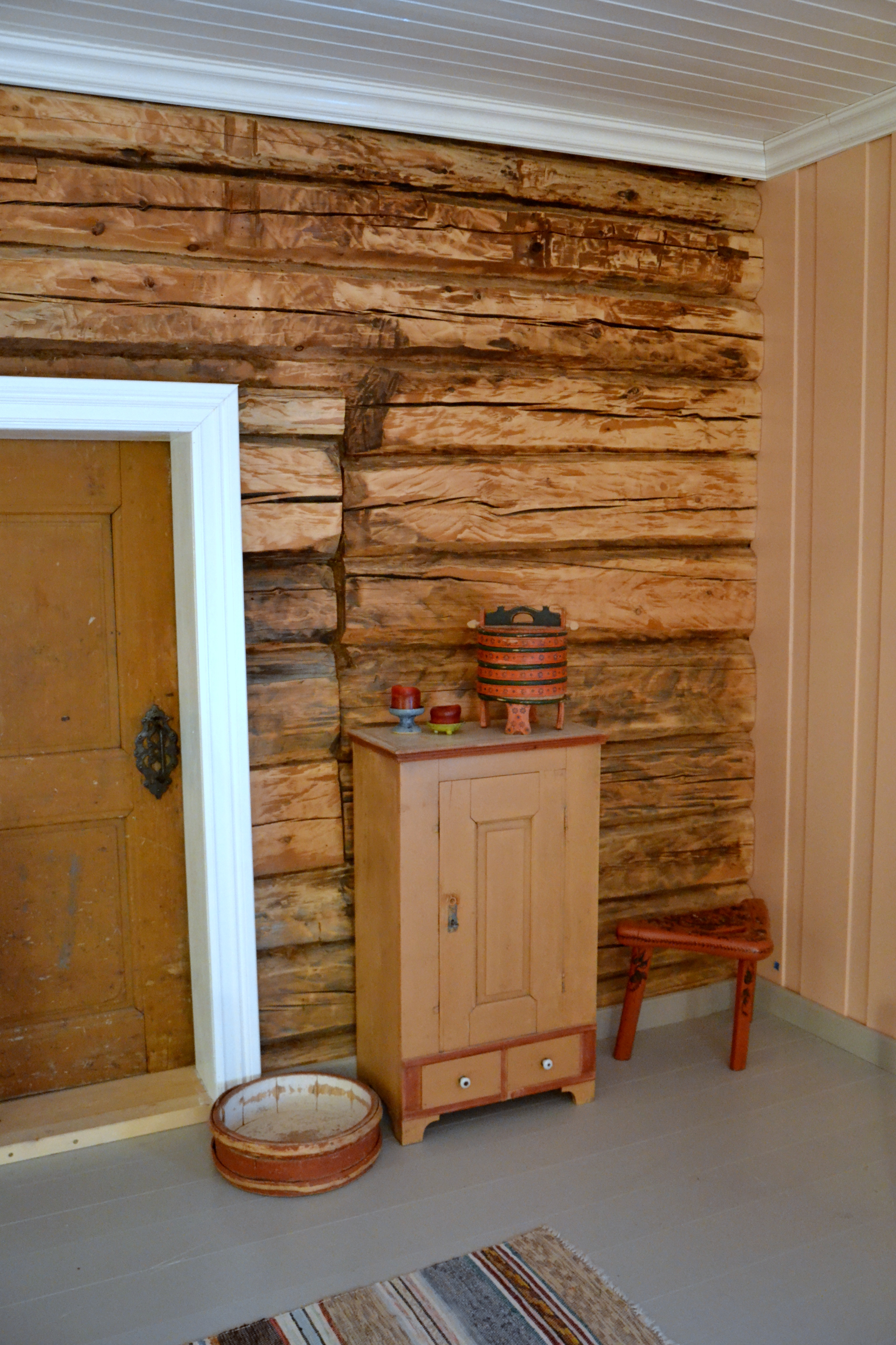 1700-tallsdøra mellom stua og soverommet har fått selskap av et gammelt skap, en nydelig dekorert grøtdall, en mjølkebunk og en trebenet fjøskrakk. (Forøvrig en gedigen kontrast til TV’n som står i en annen del av rommet)