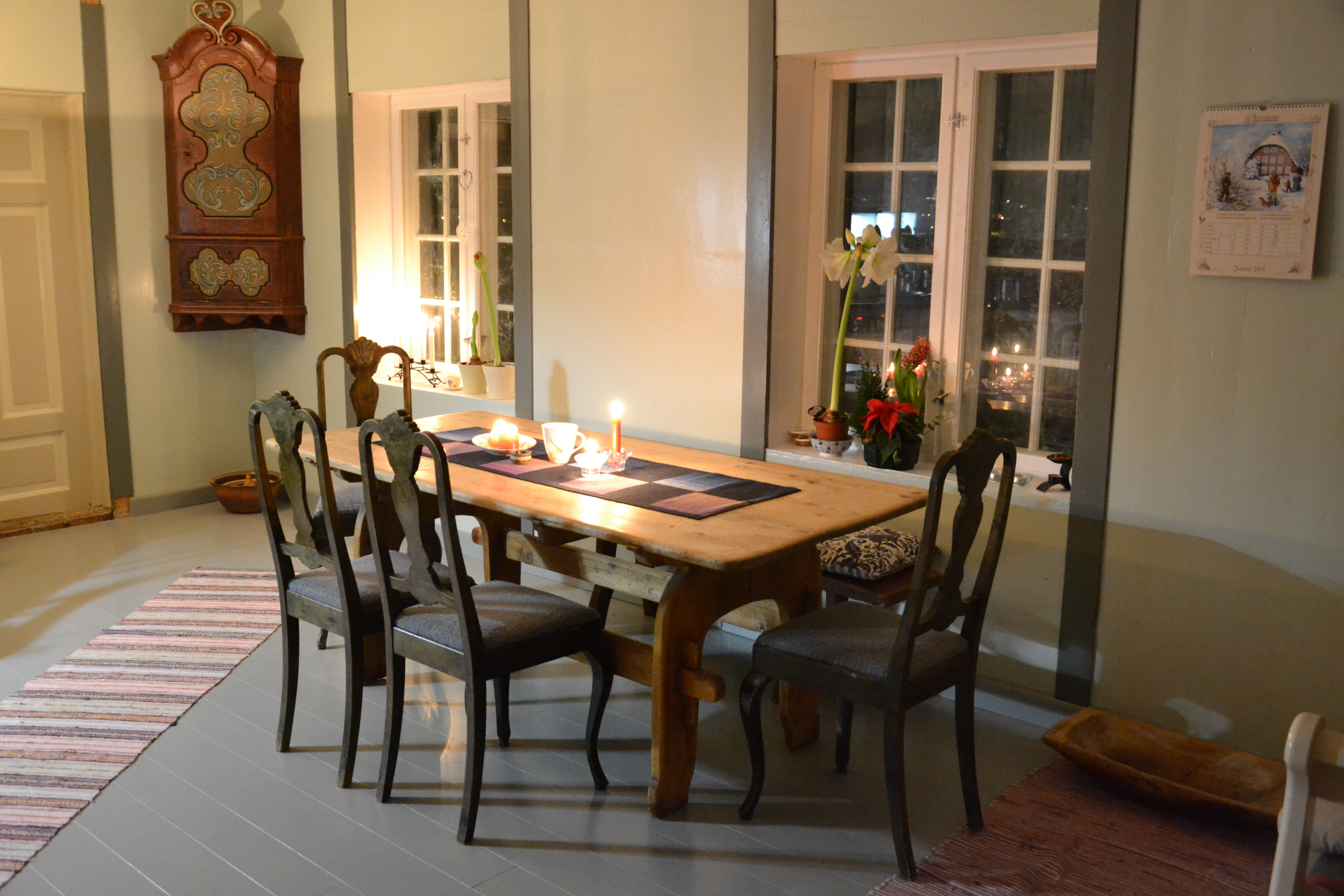 Vårt gamle kjøkkenbord passer godt inn. Stolene som kommer fra en auksjon på Kvikne, og var eierens svennestykke, er utrolig gode å sitte på. De passer kanskje ikke helt inn sammen med bordet, rent stilmessig, men pytt!