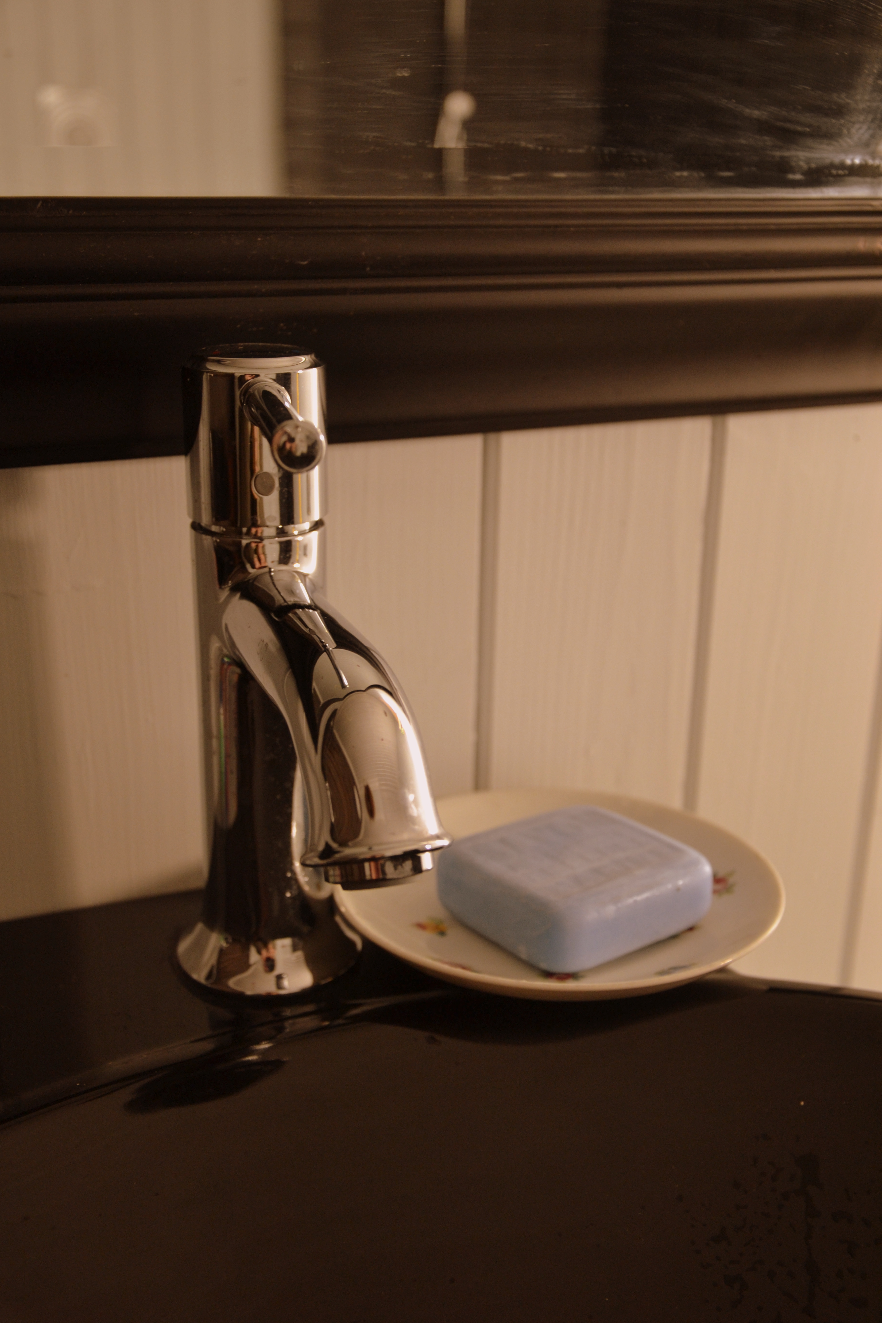 Den gamle benken som ble funnet på låven, har blitt skrapt og pusset og fått flere lag med ny maling, den samme blå gråtonen som panelveggene. To sorte servanter er plassert oppå benken, praktisk når man er mange familiemedlemmer som tar tannpussen samtidig!