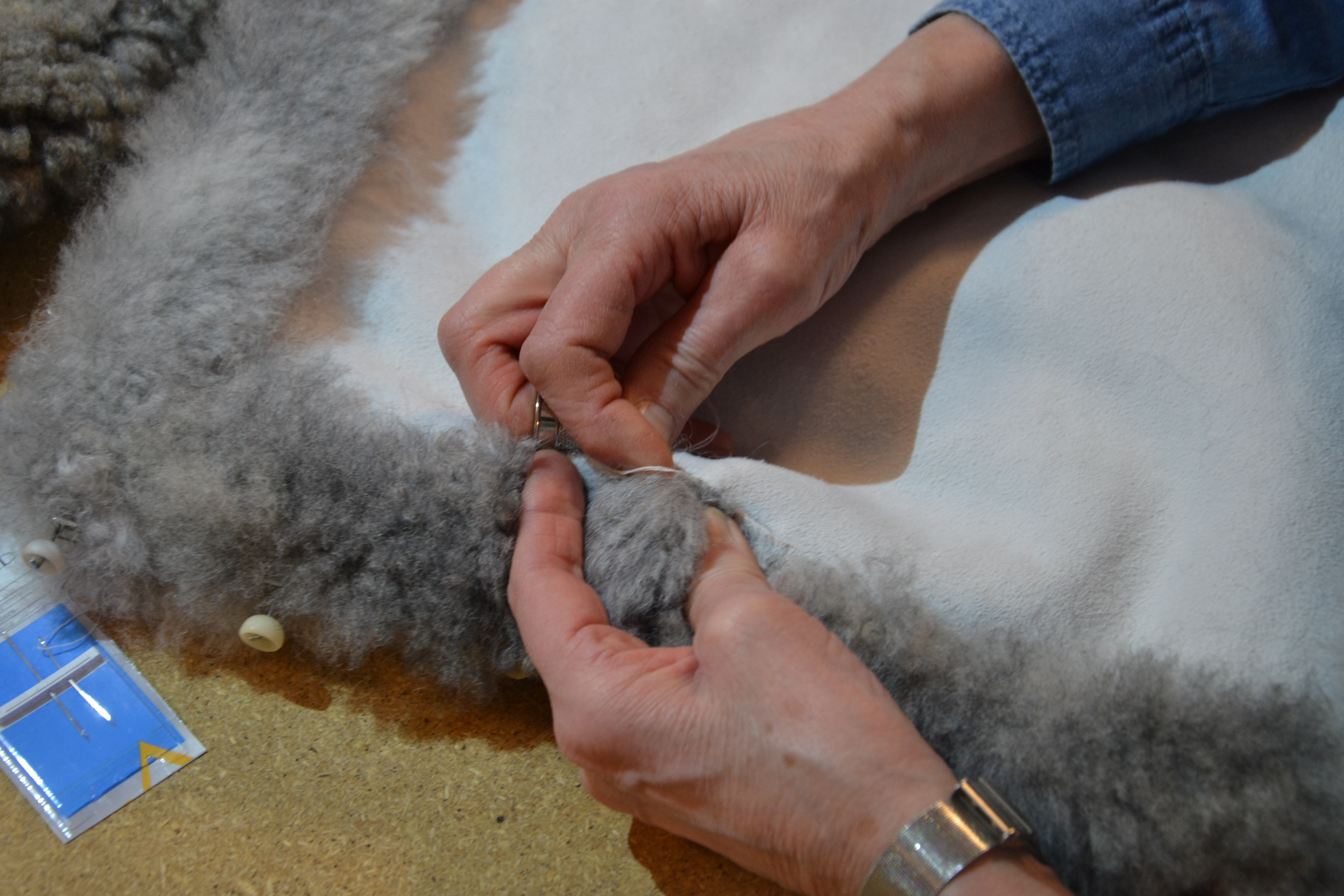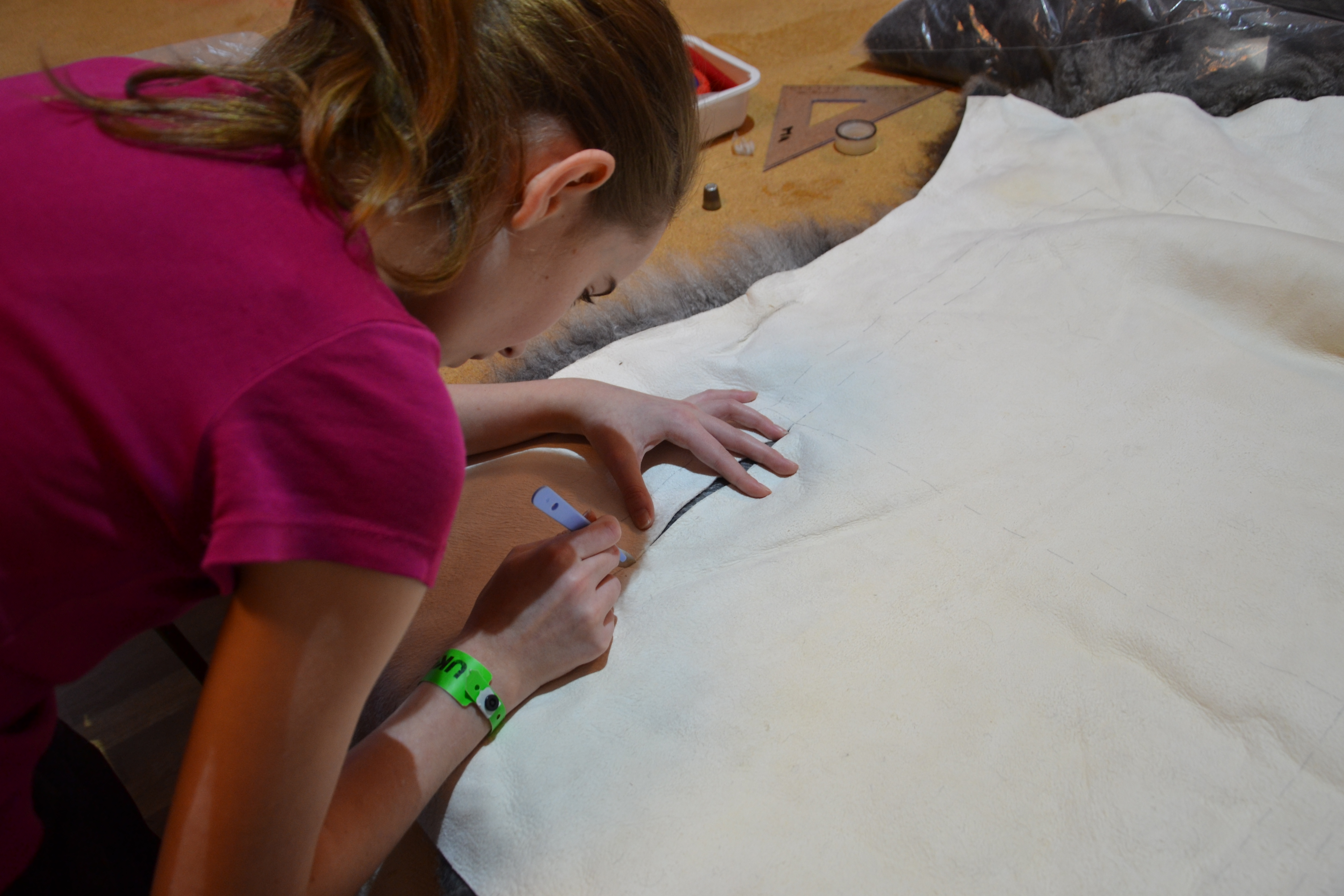 Jeg har lært å sy i skinn! Gjennom husflidslaget i nabobygda har jeg fått være med på et kurs med 71 årige Liv fra Innset, som øste sin mangslungne kunnskap over sju kvinnfolk i helga. Litt streng var det nødvendig å være, og Liv godtok for eksempel ikke at vi sluntret unna å bruke fingerbøl, og den skulle sitte på langfingeren! Den er sterkest, og da unngås belastningsskader, mente Liv. Basert på erfaring fra mange tidligere kurs, hadde hun også tatt med plaster, men denne gangen ble det heldigvis ikke bruk for det.