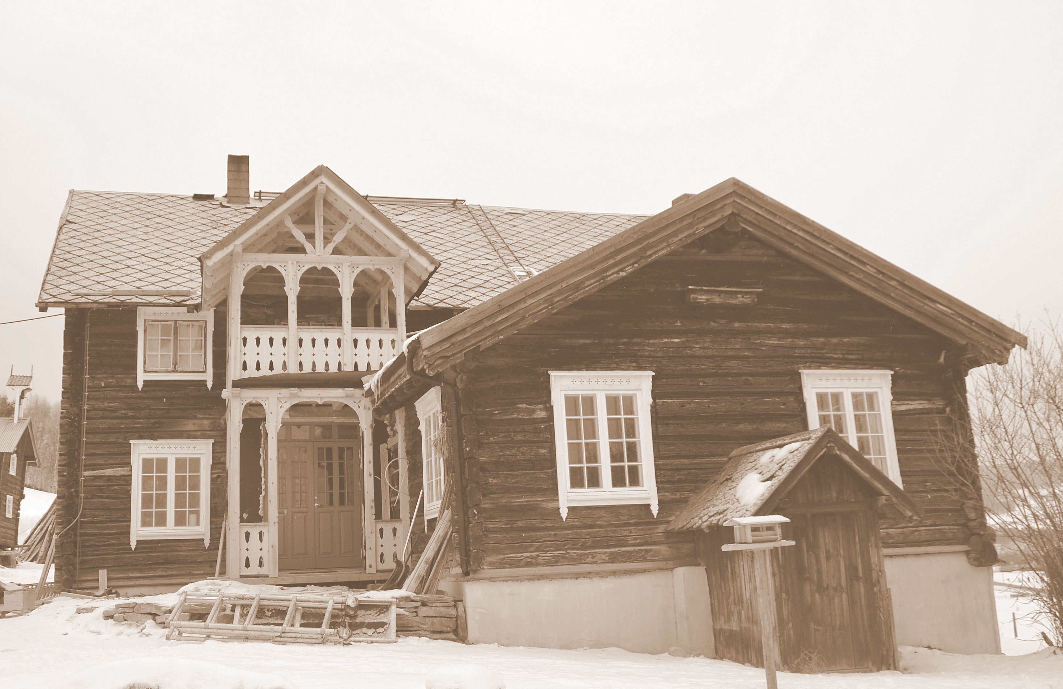 Vår venn, historikeren Mads, kommenterte et tidligere innlegg som omhandlet inngangspartiet på huset, med at et slikt grovt gammelt tømmerhus med sveitserveranda, lignet et norsk troll med brudekrone. Et fantastisk bilde på våningshuset vårt, syns jeg. Og se, nå begynner trollet å ta form med krone, slik det var for mange tiår siden!