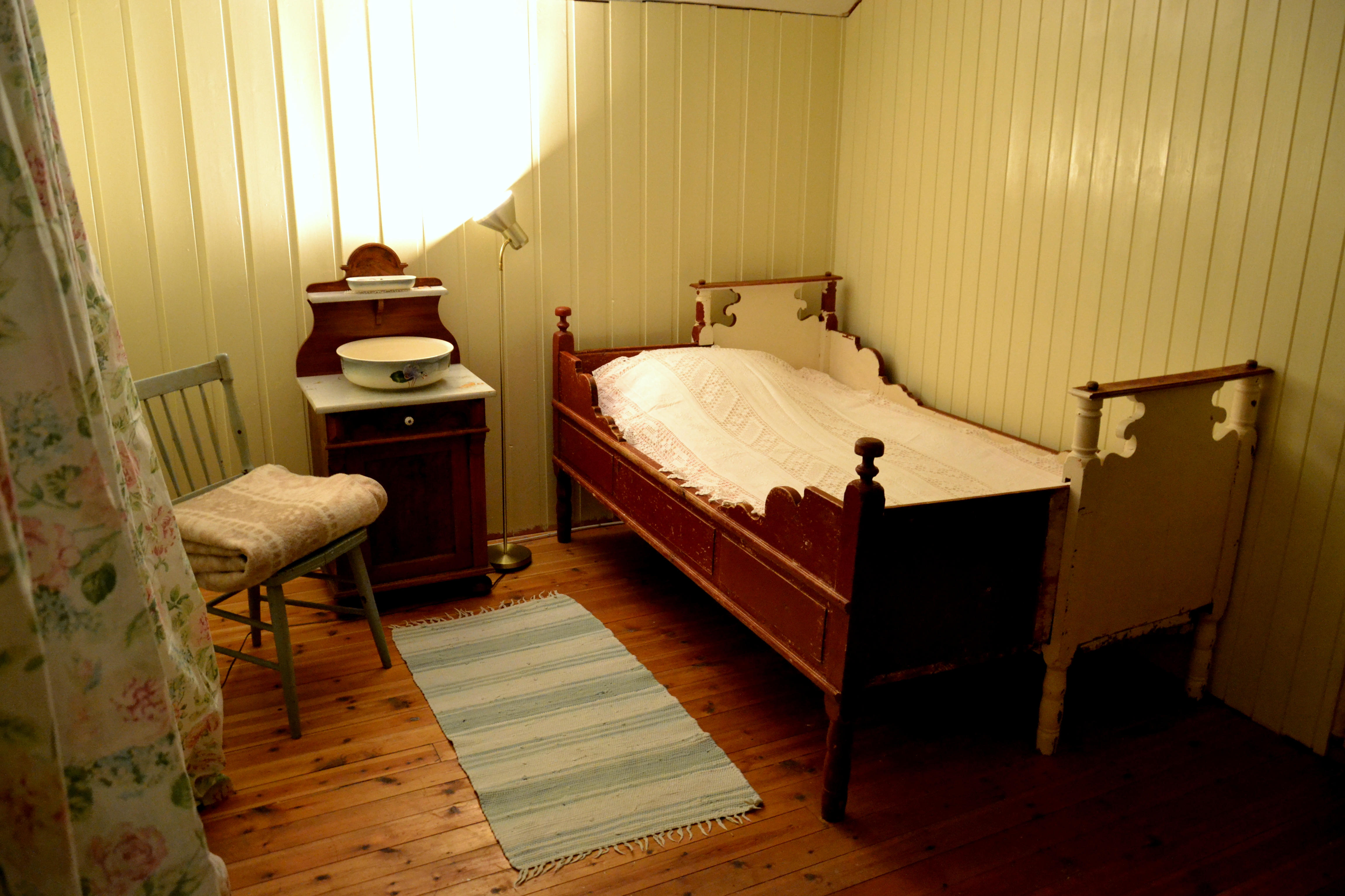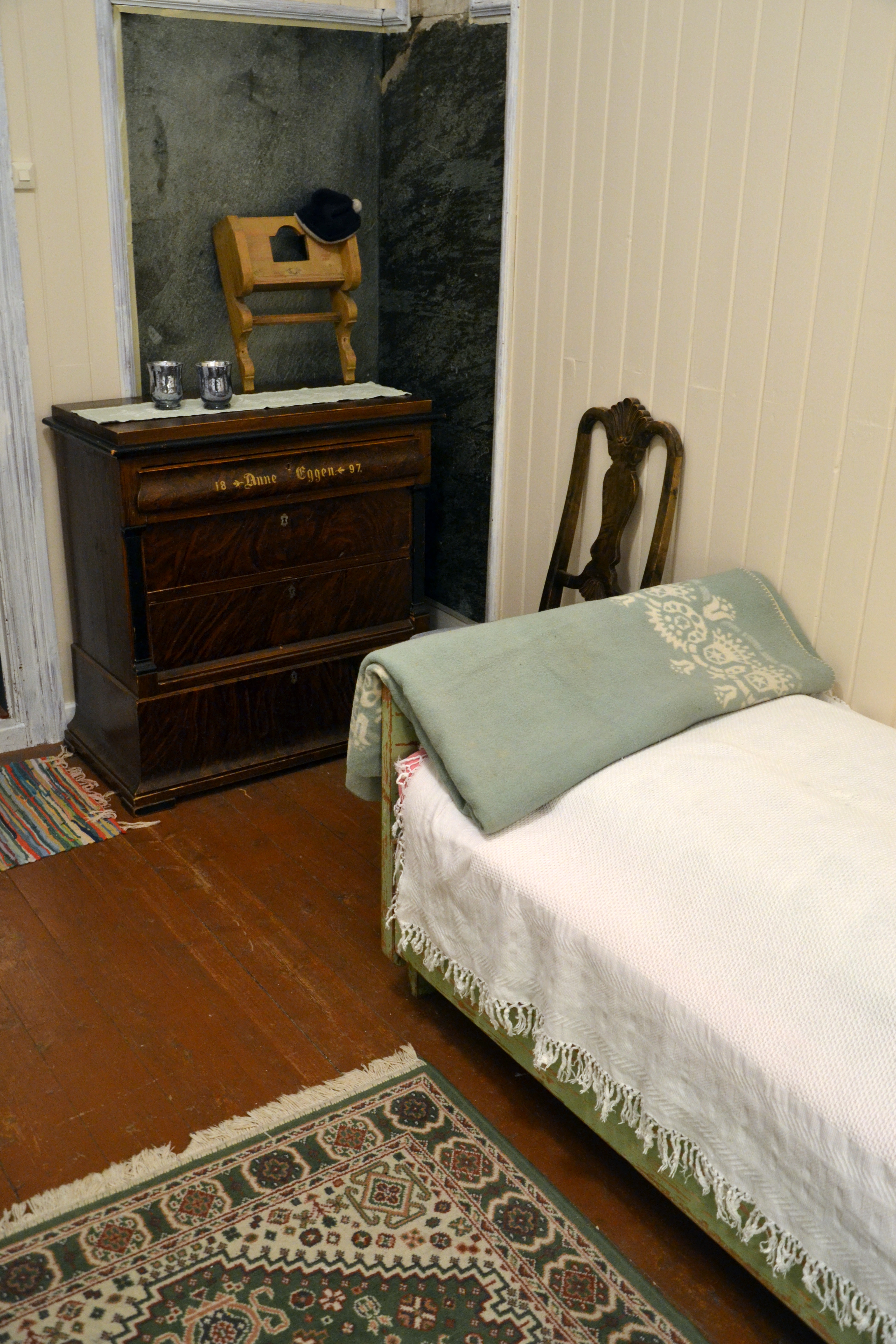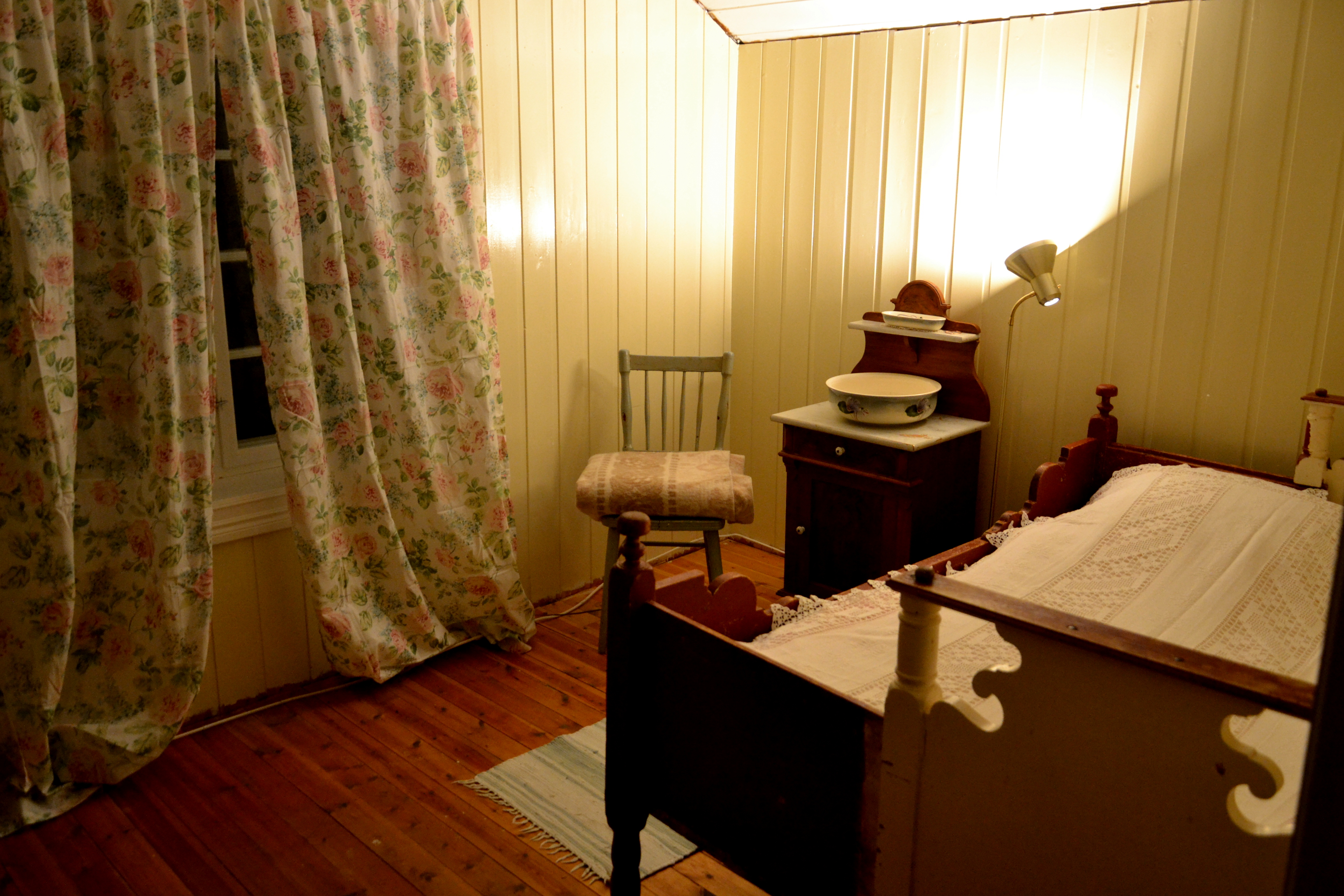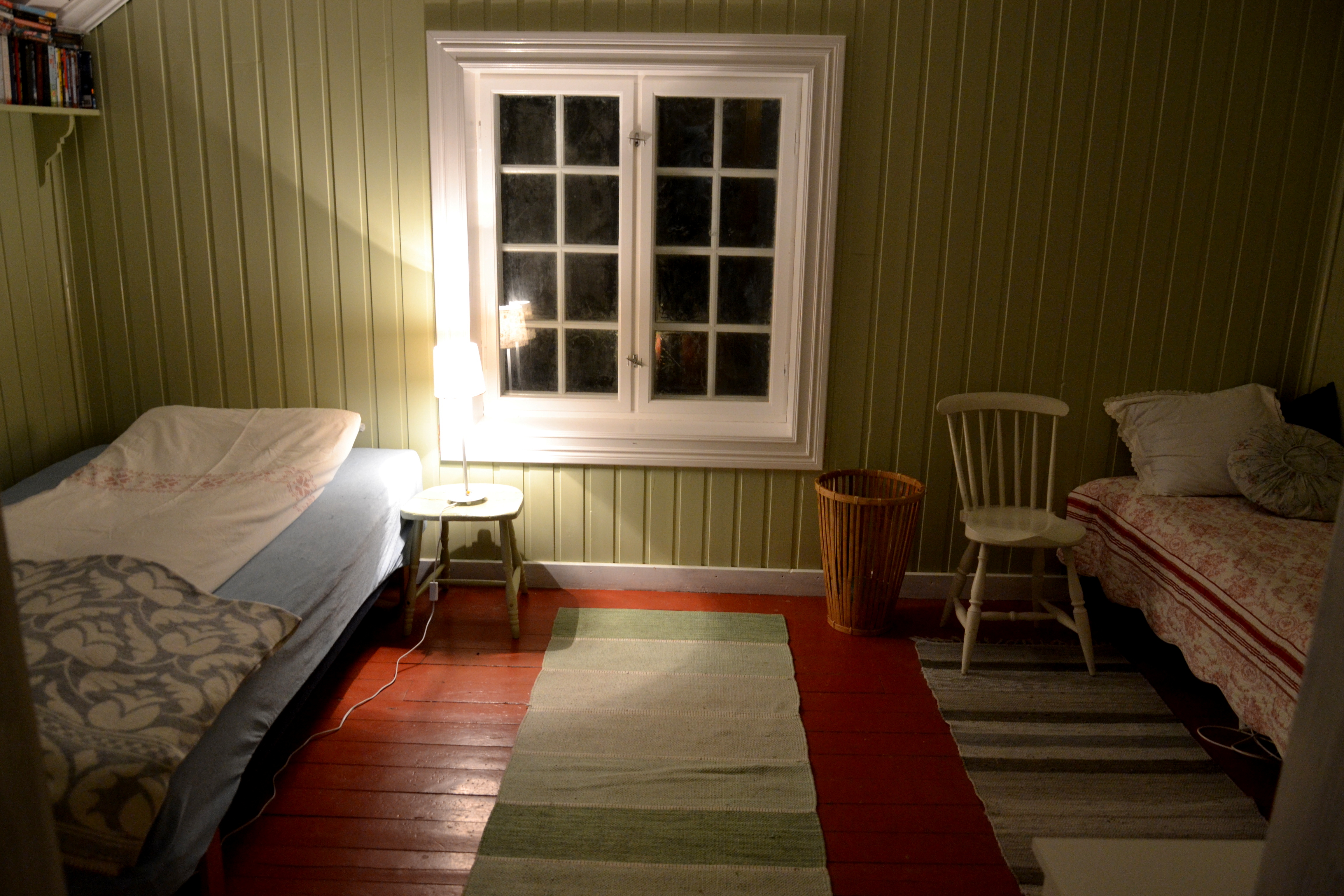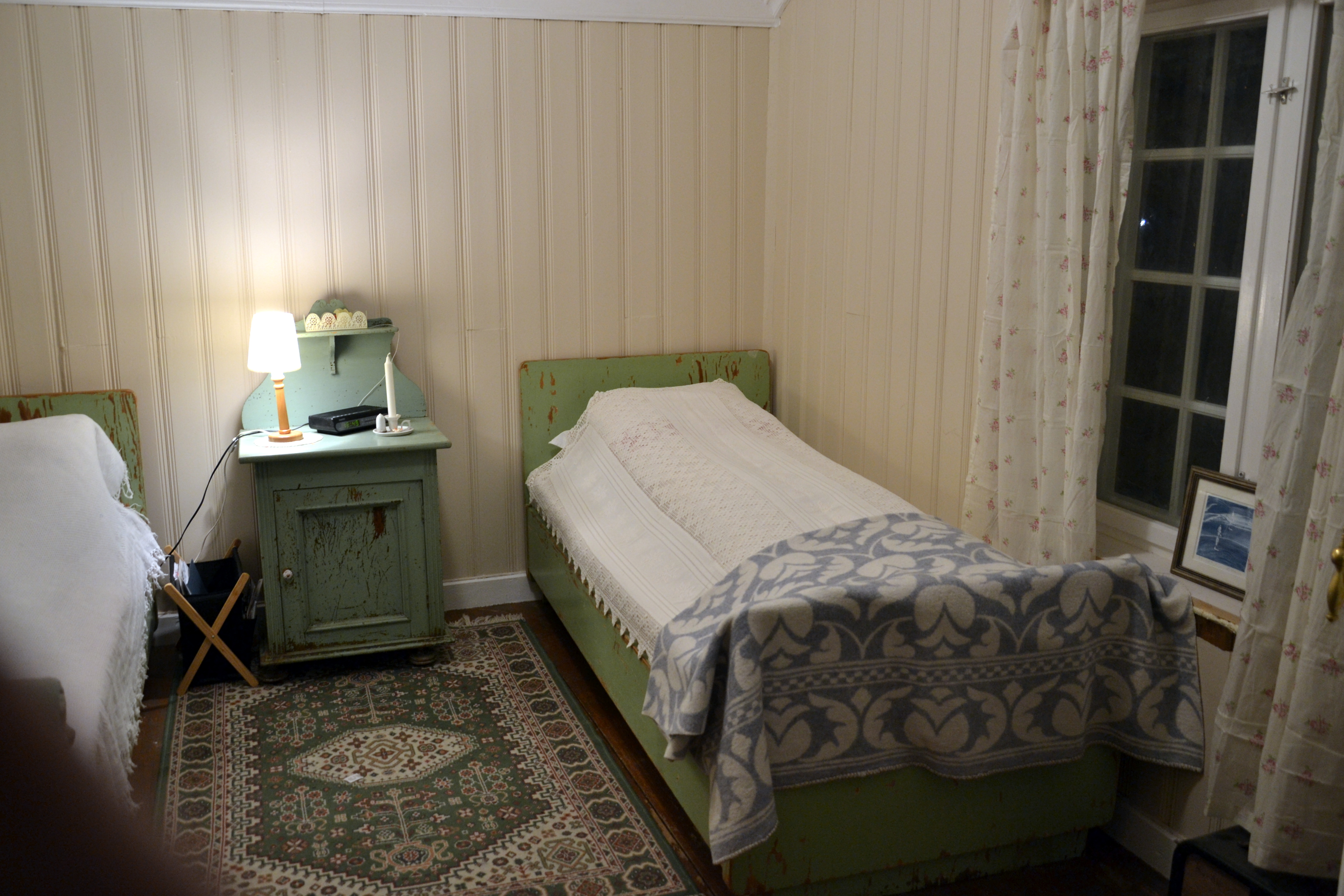 AnneMaritrommet ligger vegg i vegg, og har fått to gamle senger som jeg antar er fra -40-eller -50tallet. Litt korte etter dagens standard, men i hver fall koselige, syns jeg. Den gamle vaskeservanten som brukes som nattbord passet forresten perfekt i fargen.