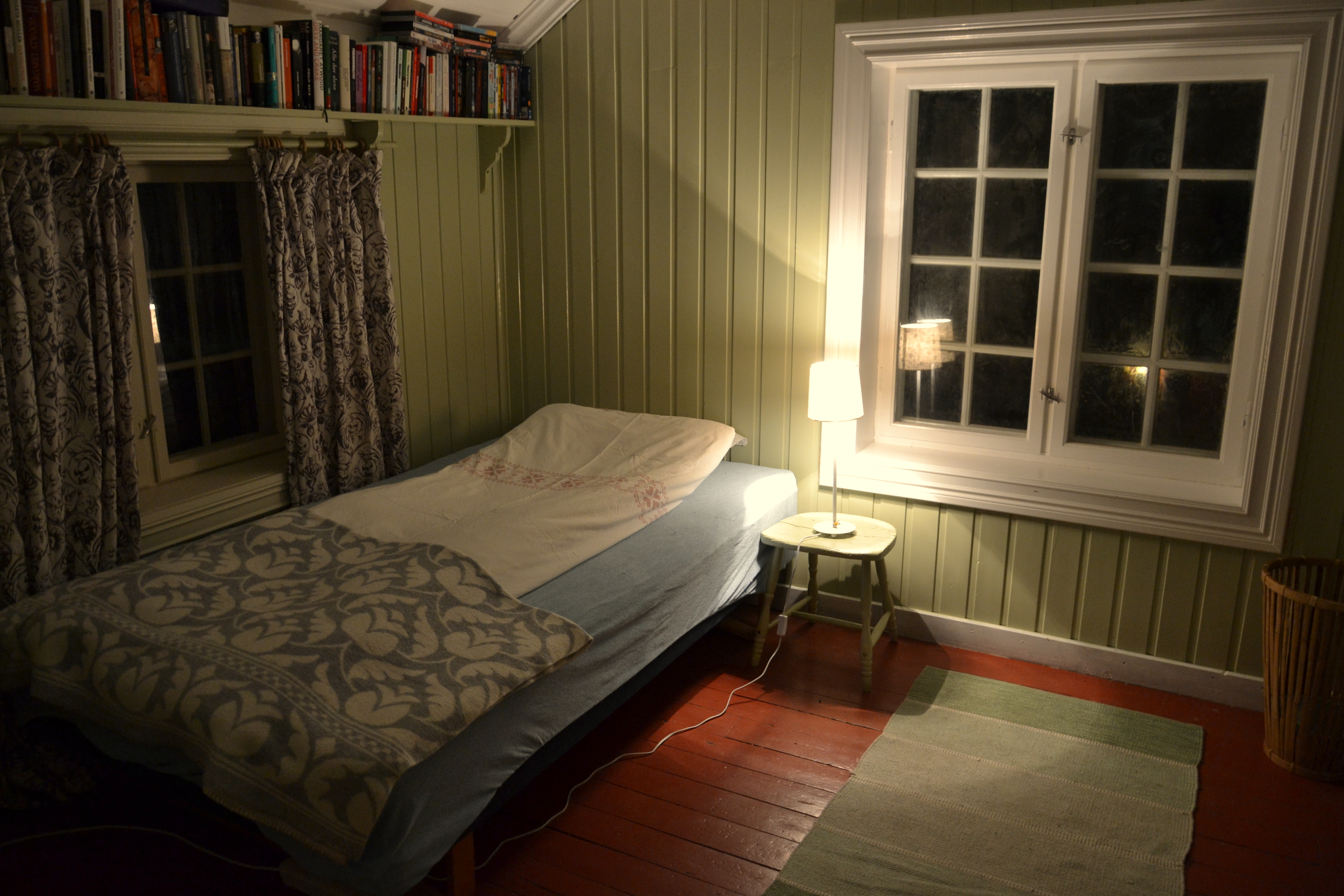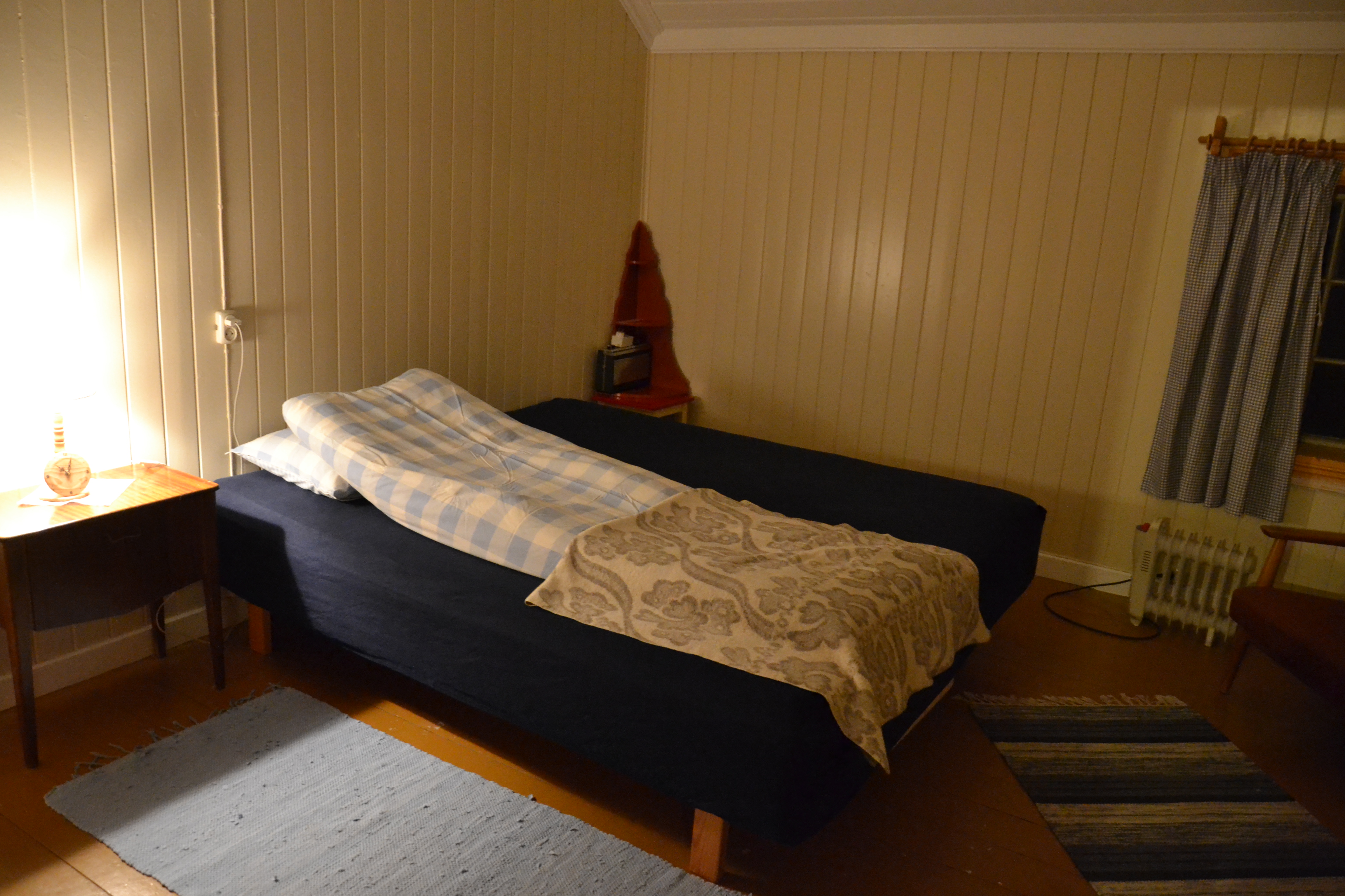 Persrommet har fortsatt ikke fått nytt vindu, da det som skal inn her nylig ble tatt ut der verandadøra nå er satt inn. Kanskje ikke det fineste av de fire rommene (ennå!), men desidert beste sengen!