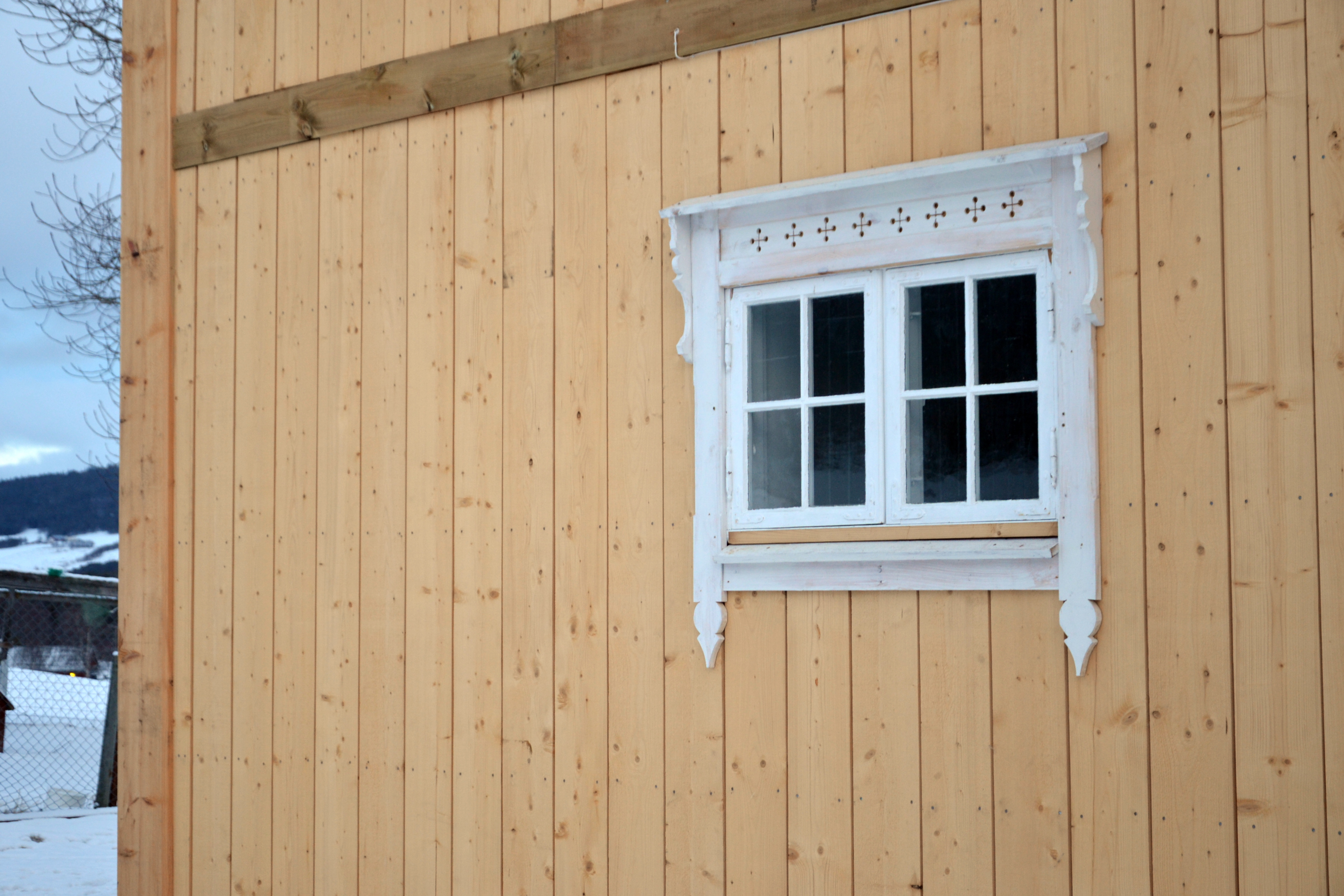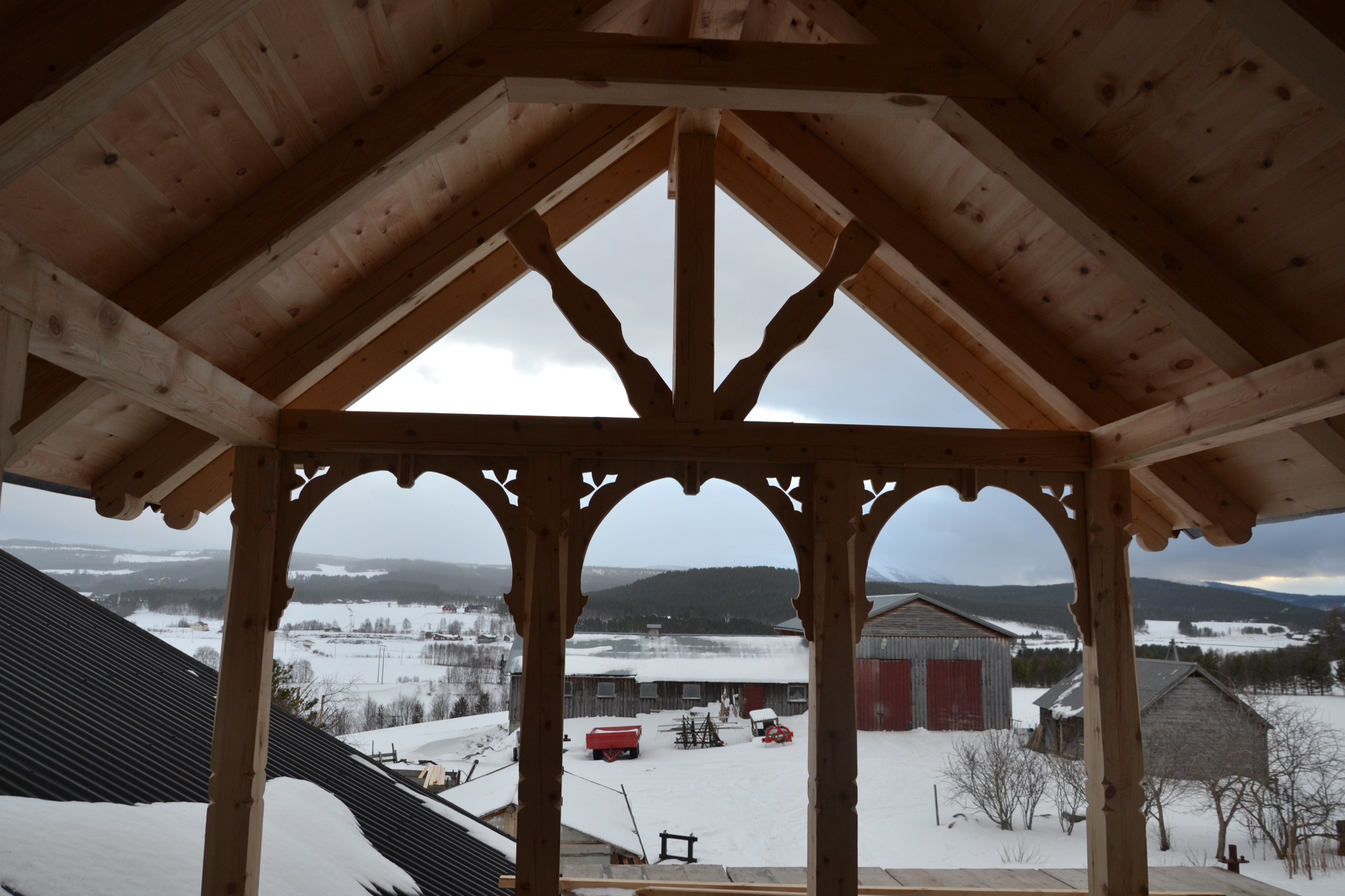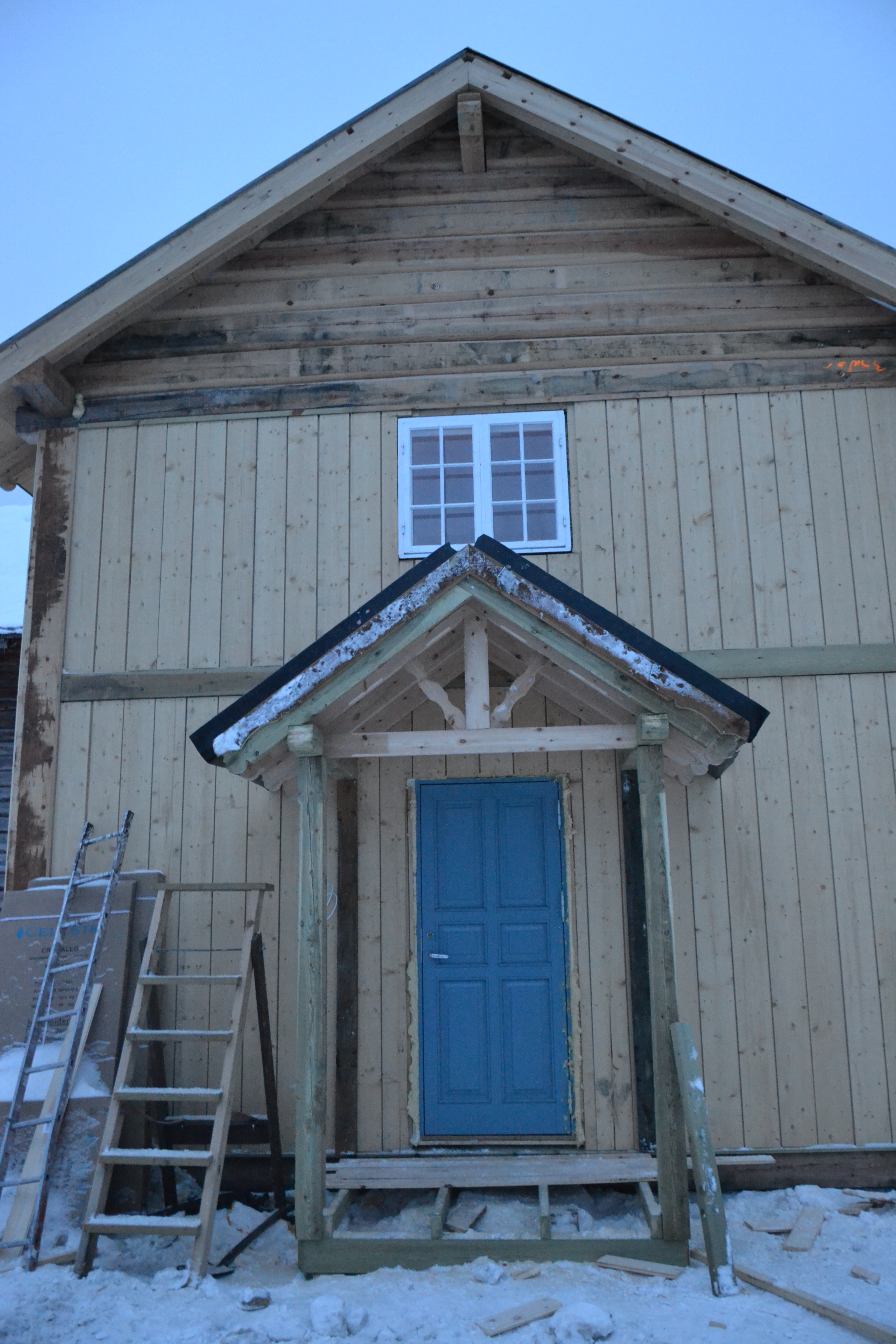 Hovedinngangen er, som jeg har vist i et tidligere innlegg, selvfølgelig tilbakeført til fordums prakt i sveitserstil. Det har krevet stor innsats i pirkarbeid og det har ikke vært så enkelt å se på de gamle bildene hvordan det egentlig har vært. Her har all Svein Olavs erfaring og kreativitet kommet godt med. Resultatet taler vel for seg, eller hva?