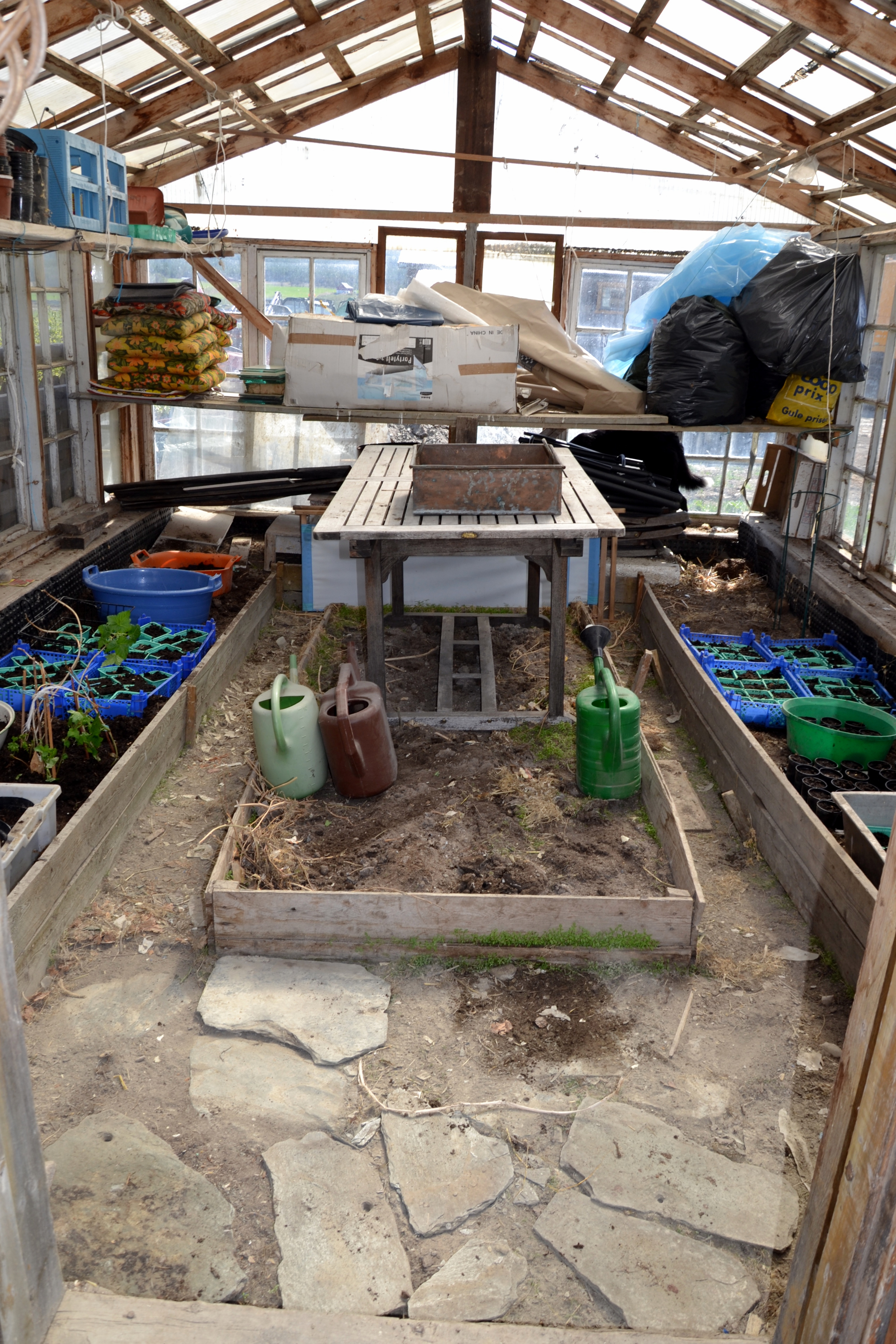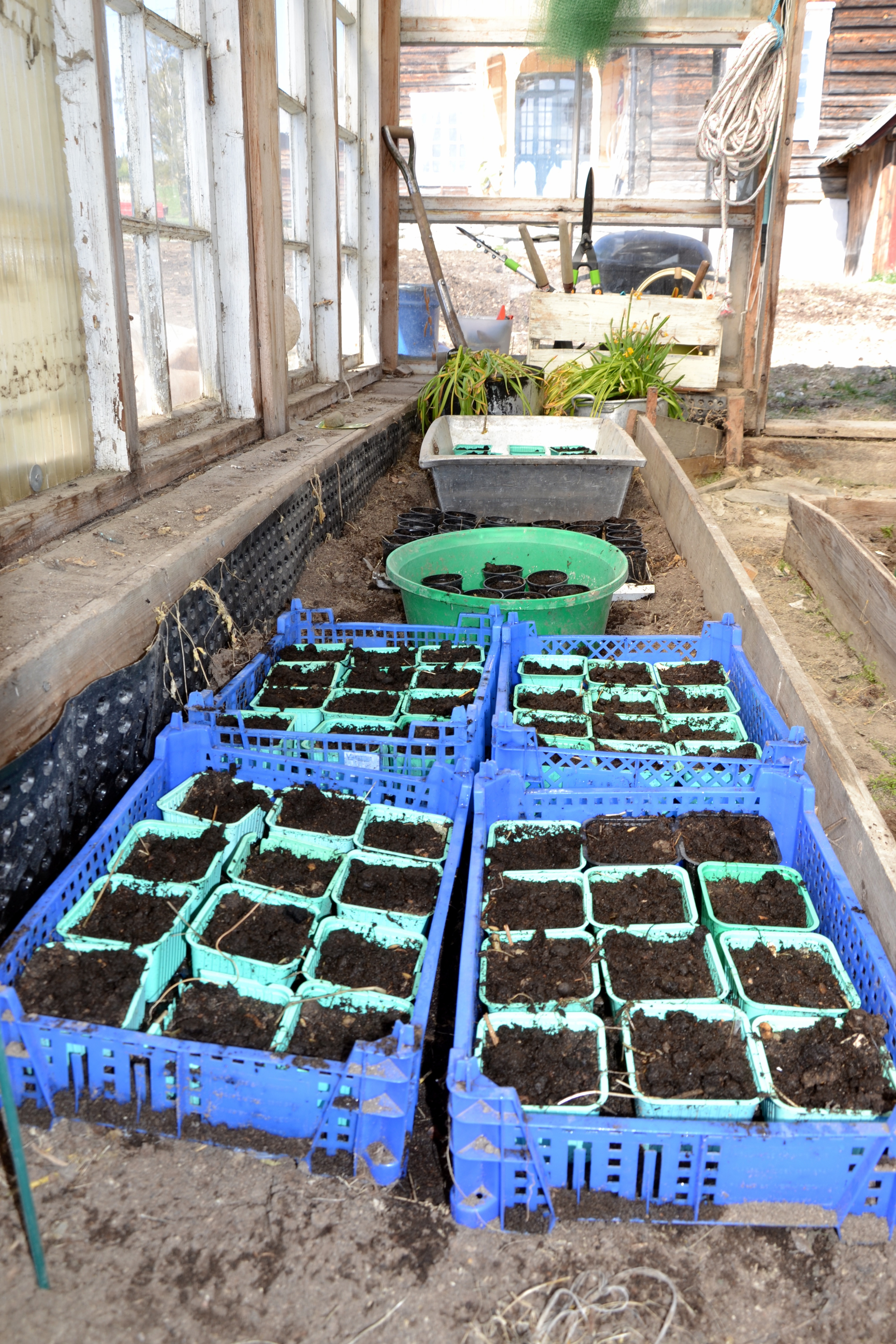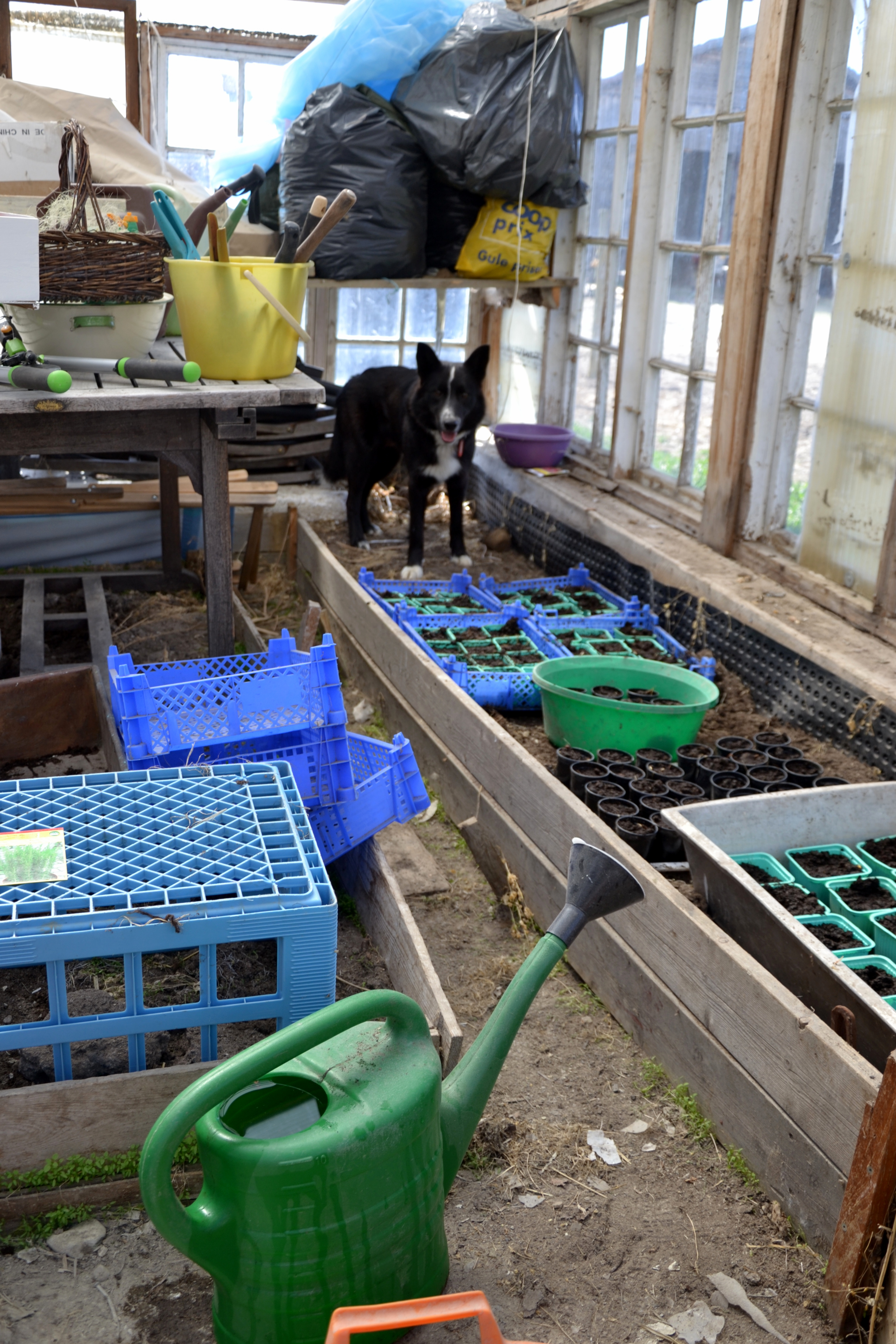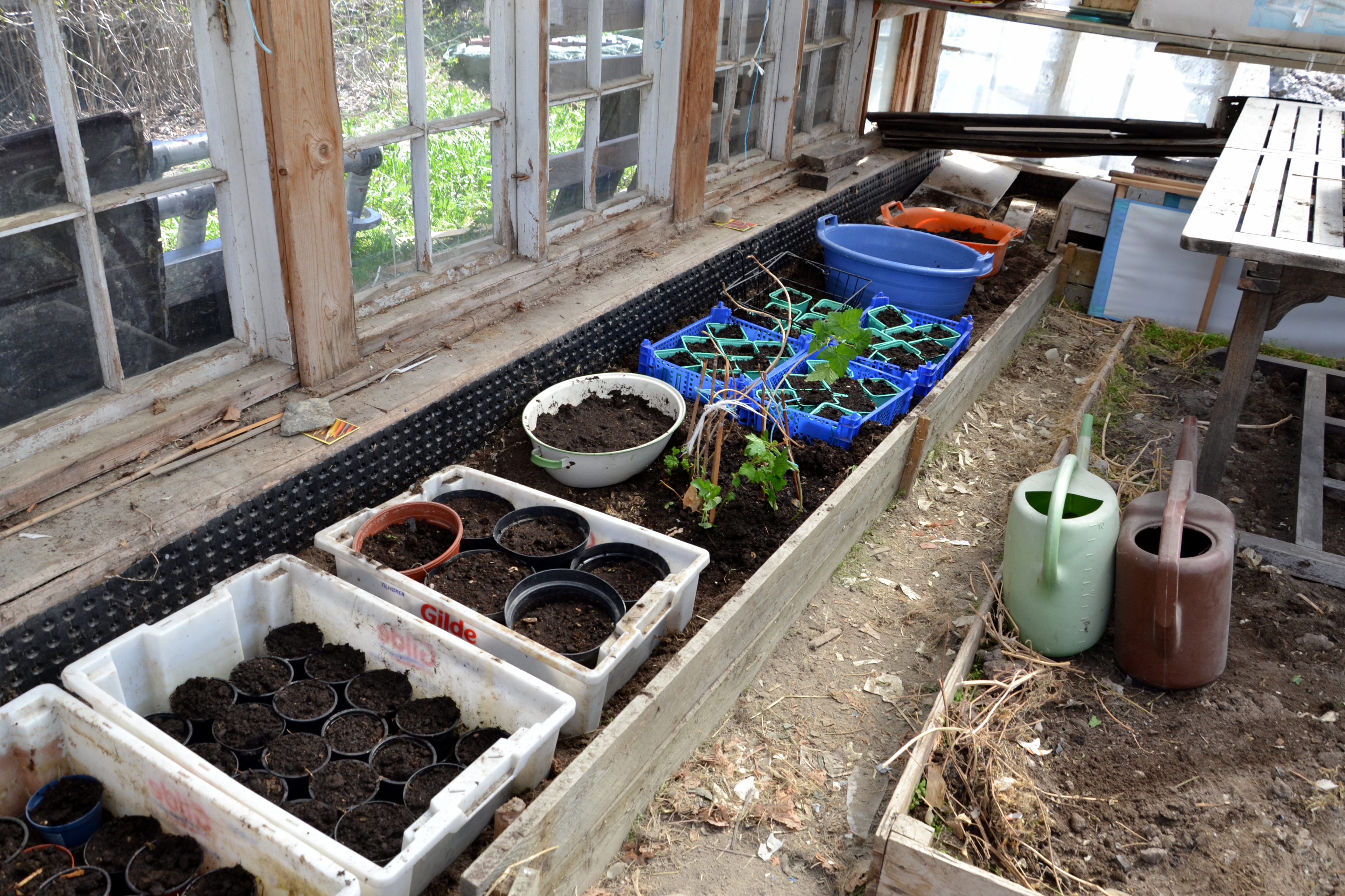 En av husets yngre krefter hadde bestemt seg for at det var på tide å ta i bruk det gamle drivhuset til noe mer nyttig enn bare et lager/oppbevaringsrom. Planen er å restaurere/bygge om drivhuset slik at det blir et kombinert drivhus/lysthus, men foreløpig ligger det prosjektet litt langt ned på prioriteringslista. Men selvfølgelig er det fint å ta det i bruk, tross diverse knuste ruter, vinduer som mangler etc etc… Det som kom i jorda, var frø til gulerøtter, sukkererter, reddiker og rødbeter. Det blir spennende å se resultatet om noen uker og måneder!
