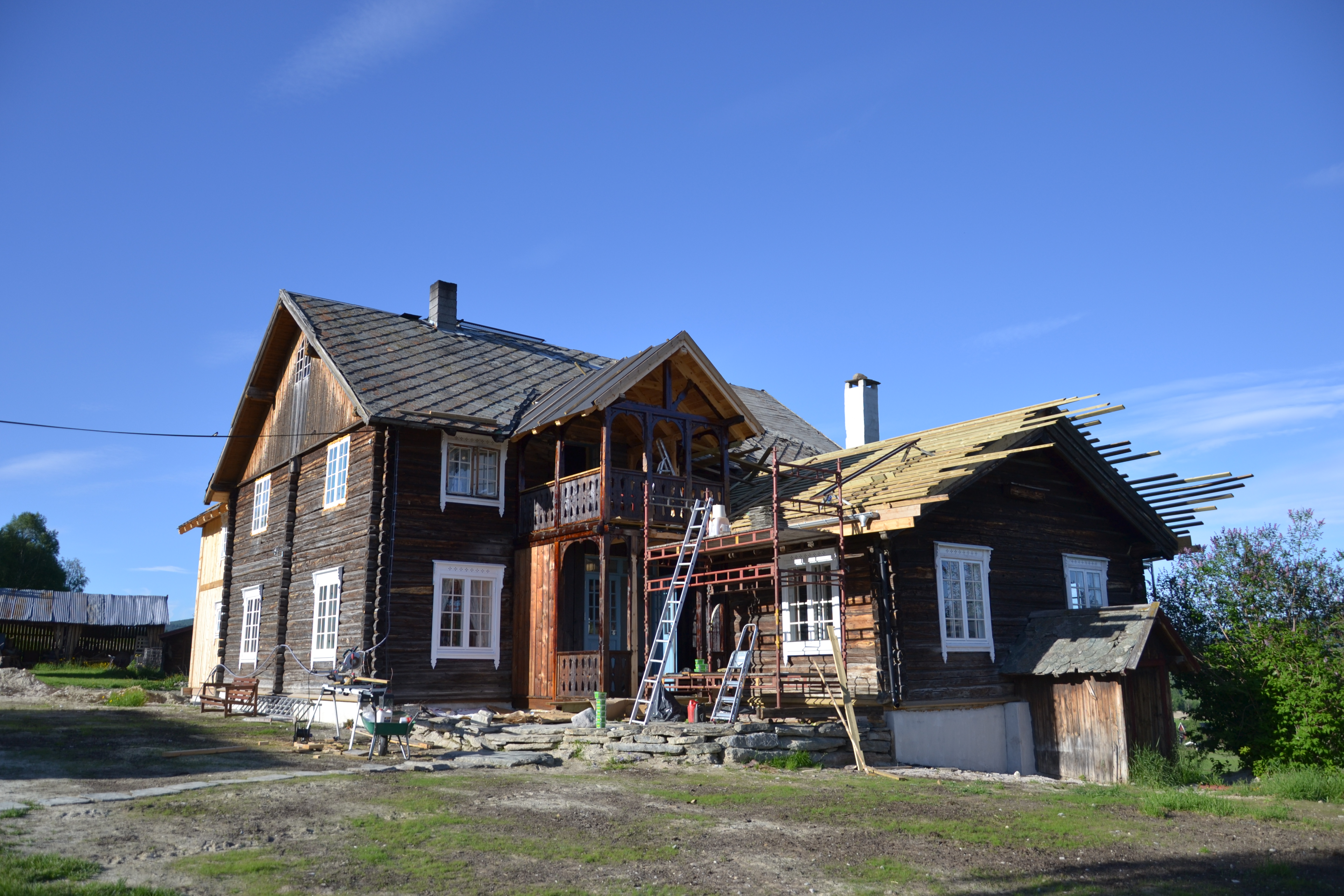 Først lektes det på taket. Her på storstua ble dette gjort oppå det gamle bølgeblikktaket, mens på resten av huset måtte først den gamle skiferen av, og så lektene på, før ny skifer kunne legges på.