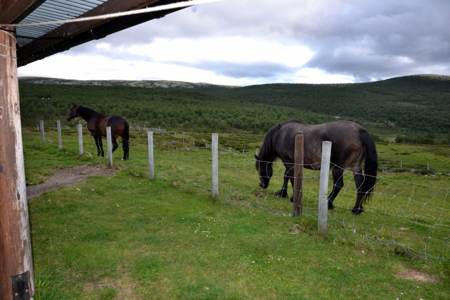 Hestene gresser rett utenfor sæterdøra