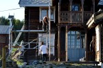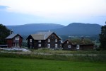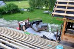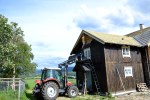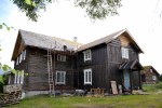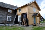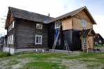 Huset kan nå ses slik det vil komme til å bli. Det vil si at vi har tjærebredd mesteparten av det som skal ha tjære på, og skifer er lagt på store deler av taket. Vi har fått kjøpt brukt altaskifer av samme type som den gamle vi nå bytter ut. Dessverre ble ikke taket ferdig – litt heft og «oppatt-taking» måtte til før det ble helt som det skal være, og dermed strakk ikke tida helt til. Det store nye tilbygget på baksiden samt litt av storstua mangler fortsatt skifer, men undertaket er tett, så det er i og for seg ingen fare, bare vi får det på før høstfrosten setter inn. Det er ikke særlig lurt å gå på taket når det kan være isete…