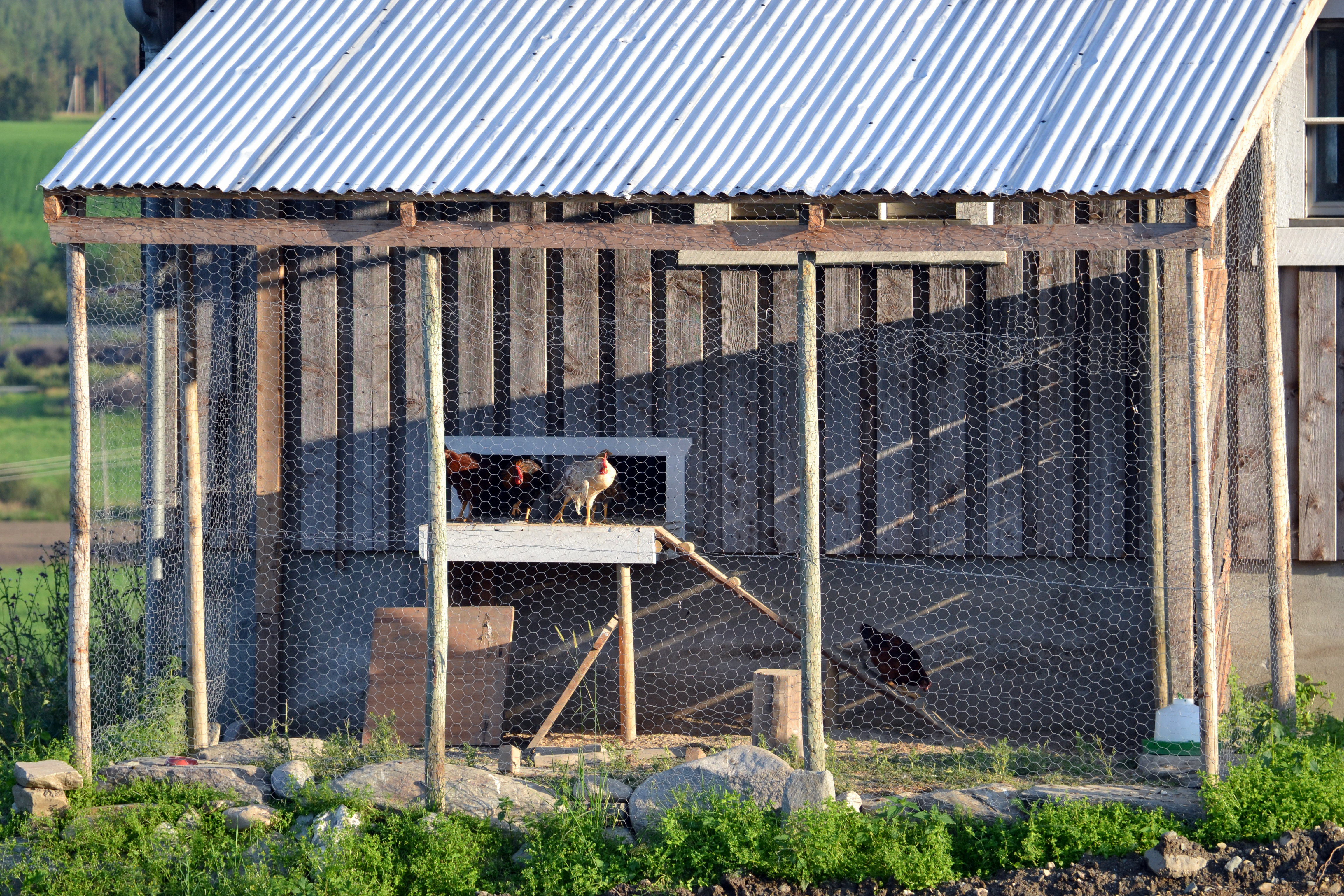 Hønsegården med inngang til hønsehuset, der hønsene kan gå inn og ut som de vil