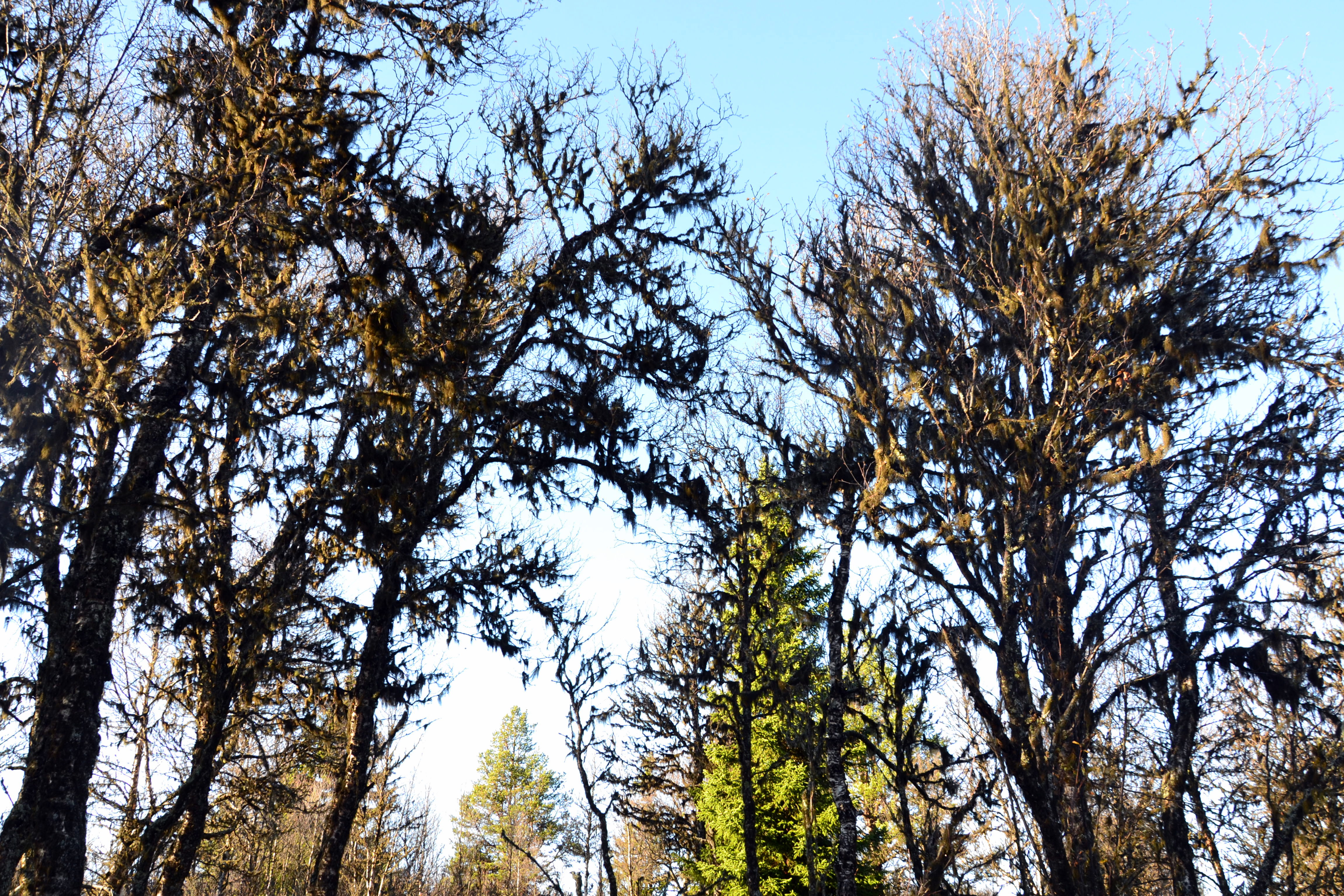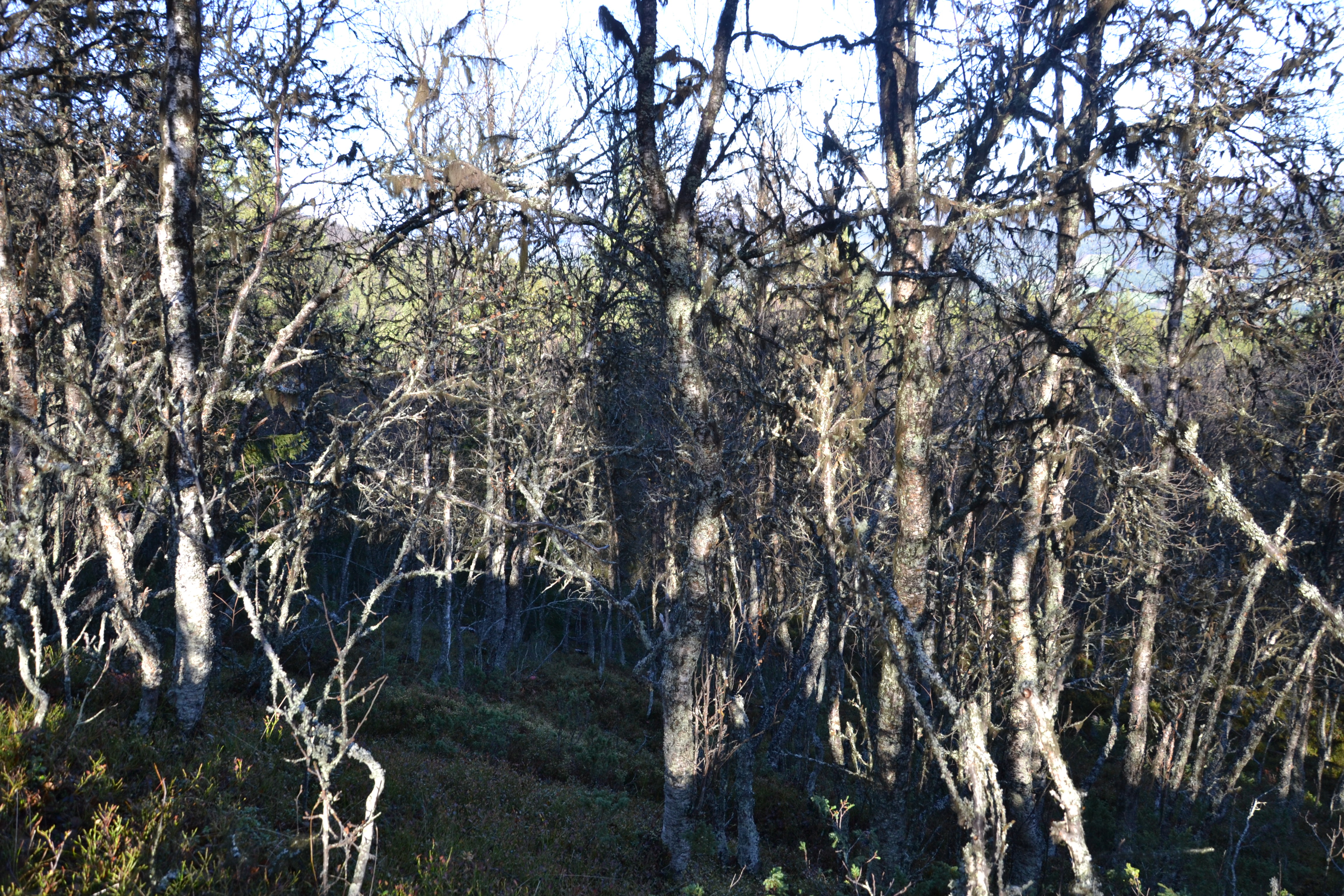 Vi vandret og klatret gjennom tett «trollskog» for å komme til toppen. Alle bladene har blåst av trærne her oppe, og de står nakne i høstsola
