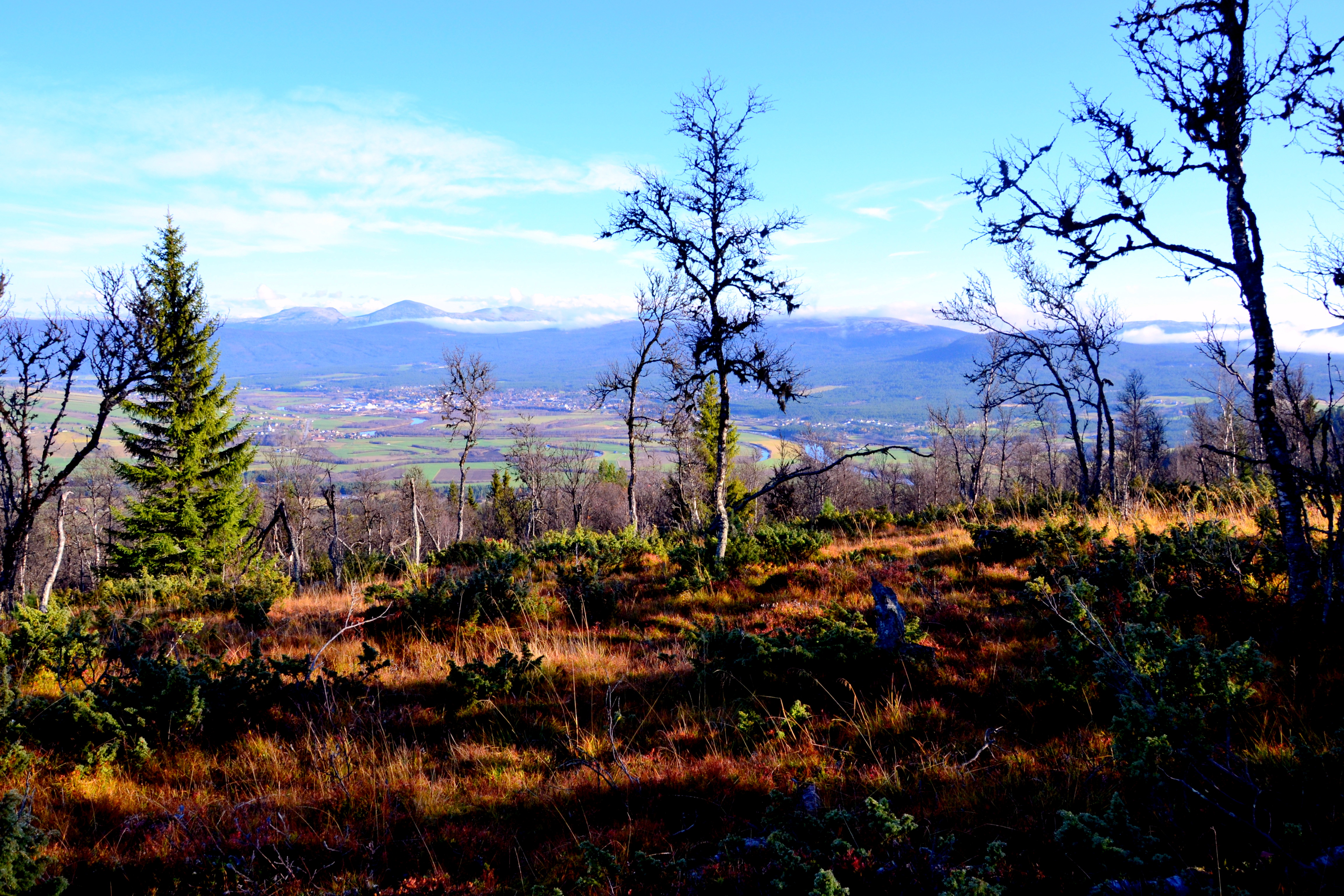 Ut på tur! I går var det ingen grunn til å sitte inne. Høstsola flommet over oss, etter at tåka litt utpå formiddagen ga etter for solstrålene, og fordampet. Vi ville prøve oss på en ny tur til Bondåsen, den lille toppen bak Fåsten. Bondåsen er litt høyere enn Fåsten, hhv 860 og 780 moh. Mellom de to toppene er det et stort søkk i terrenget, så bratt at det ikke kan forseres direkte. Det er dog mulig å gå rundt Fåsten for så å komme inn et stykke oppe på på grusveien som går til Bondåsvangen. Vi startet imidlertid vår vandring i bunnen av denne grusveien, og fikk noen bratte kneiker på vei oppover. Starten var på høyde med Storeggen, 506 moh, mens toppen av Bondåsen ligger 860 moh. Må si jeg kjente det i leggene etter hvert som metrene ble tilbakelagt. Litt usikker ble jeg, da det smalt et par skudd i nærheten av meg. Det viste seg å være en storfugljeger og hans vesle sønn og hund, og var nok ikke farlige for oss.