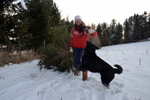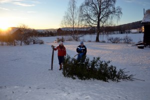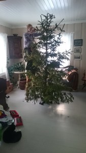 Siden vi kom hit til Storeggen, har vi funnet vårt eget juletre nesten like utenfor døren. Jentene plukker ut det de liker best, sager det ned og drar det hjem. Lille julaften tas det inn og pyntes. I år har vi valgt bort den fineste, gamle pynten etter mommo/oldemor, da vi har en liten kar på fire myke poter, som syns det er fryktelig spennende med dette rare treet inne. Vi er spente på hvordan det vil gå, hittil har han nøyd seg med å kikke og å slå litt på det som henger på grenene, uten at det har skjedd noe videre med det.