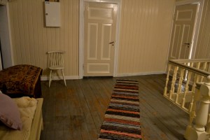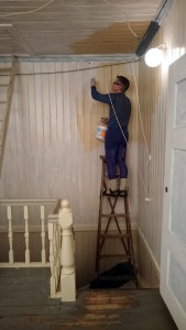 Vi har valgt tapet på en av veggene (ytterveggen) i trappestua, og som på soveromsveggen nede, har vi valgt en av de historiske tapeter fra Norsk Arv, av typen «Strandgaten» fra ca 1890. Vi bestilte fra TSH Interiør Design/Norsk Arv as som vi har god erfaring med fra tidligere, med rask og grei levering. Jeg tror nok ikke det har vært tapet i dette huset tidligere, men da vi var tvunget til å foreta grundig isolering av ytterveggene og det uansett ikke var originale vegger disse stedene, syntes vi det kunne bli fint med tapet, uten at det ville bryte med den opprinnelige stilen. Det er derfor også tapet på de to ytterveggene i Klettstua, men det får du se i et annet blogginnlegg.