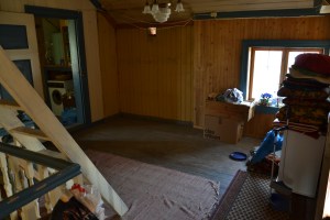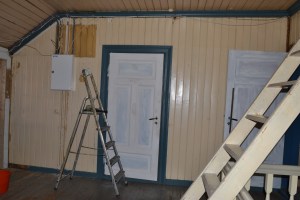 Arbeidet i trappestua har pågått over lang tid. Det var ved juletider for ett år siden den gamle isolasjonen i ytterveggen ble fjernet og erstattet med ny, og vinduet ble byttet med en dør ut mot den nye verandaen. Mye «rart» å finne i den gamle isolasjonen. Det er greit å vite at det er fjernet nå, syns jeg! Rommet har stått uten at noe vesentlig har skjedd der nå noen måneder etter at det ble isolert, men så, i jula ble det tid til å starte opp på nytt. Foreløpig har vi ikke riktig bestemt hva som skal skje med gulvet, vi lever inntil videre godt med det som det er.