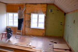 - Jan i ferd med å rive gammel panel for så å isolere ytterveggen