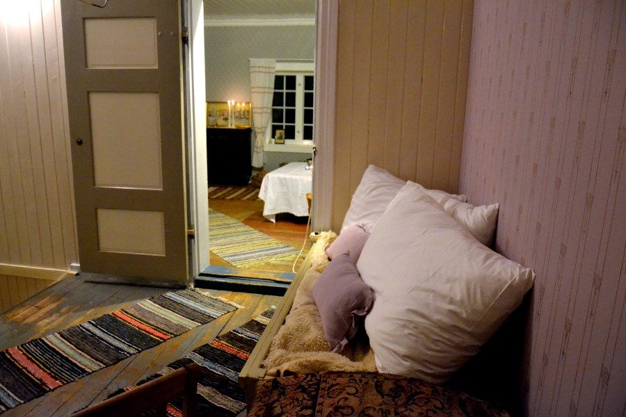 Trappestua med den tapetserte veggen til høyre. Gjennom døra ser vi inn til Klettstua