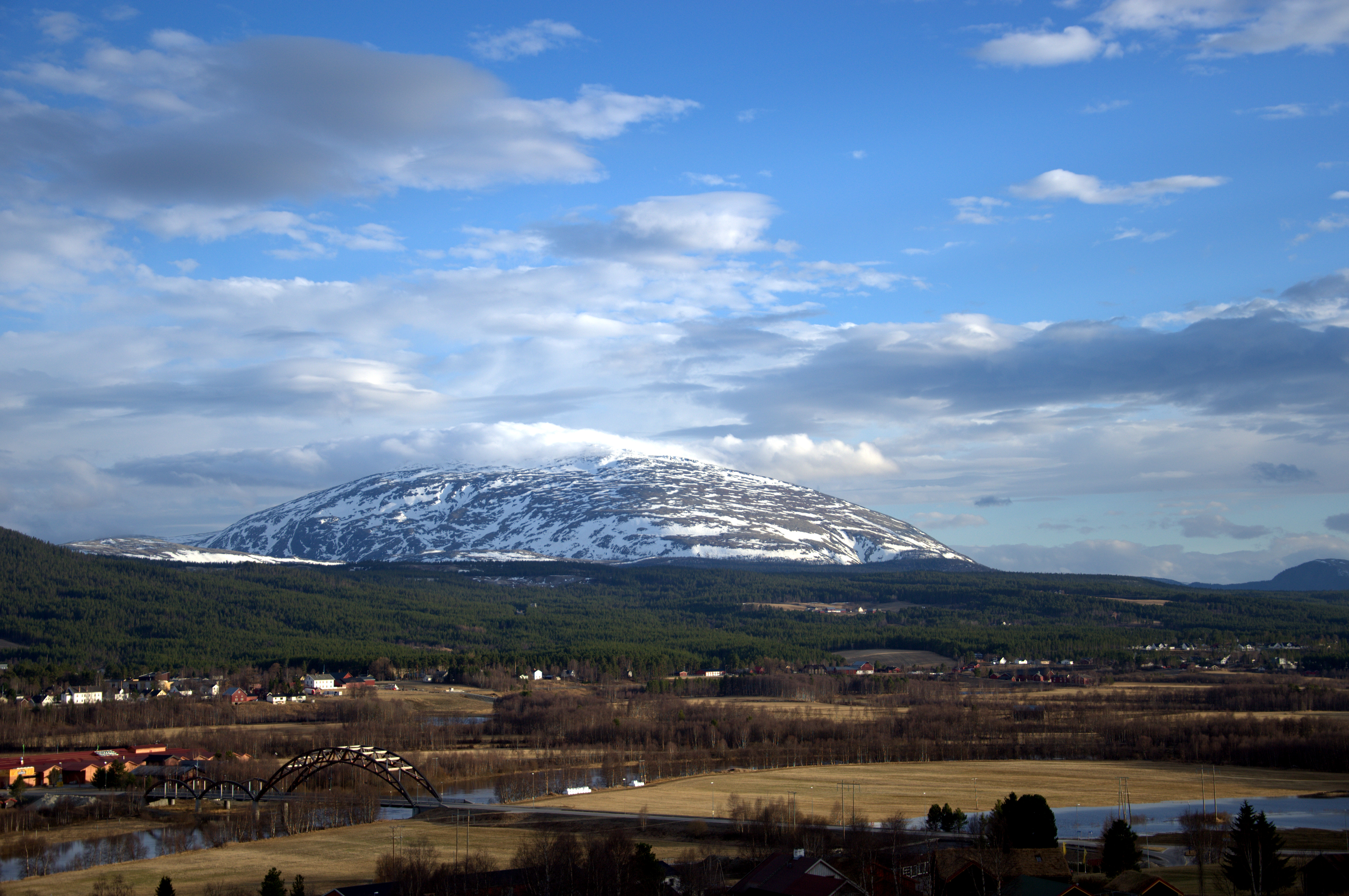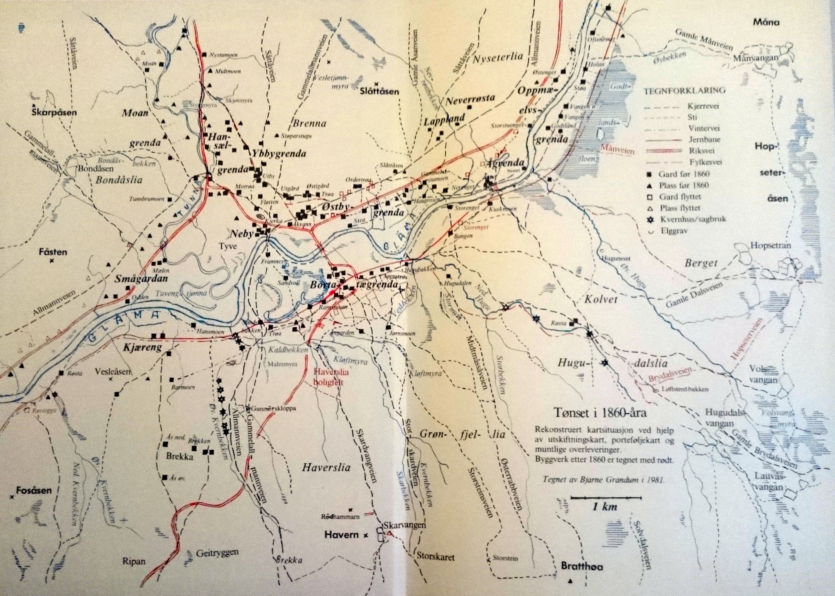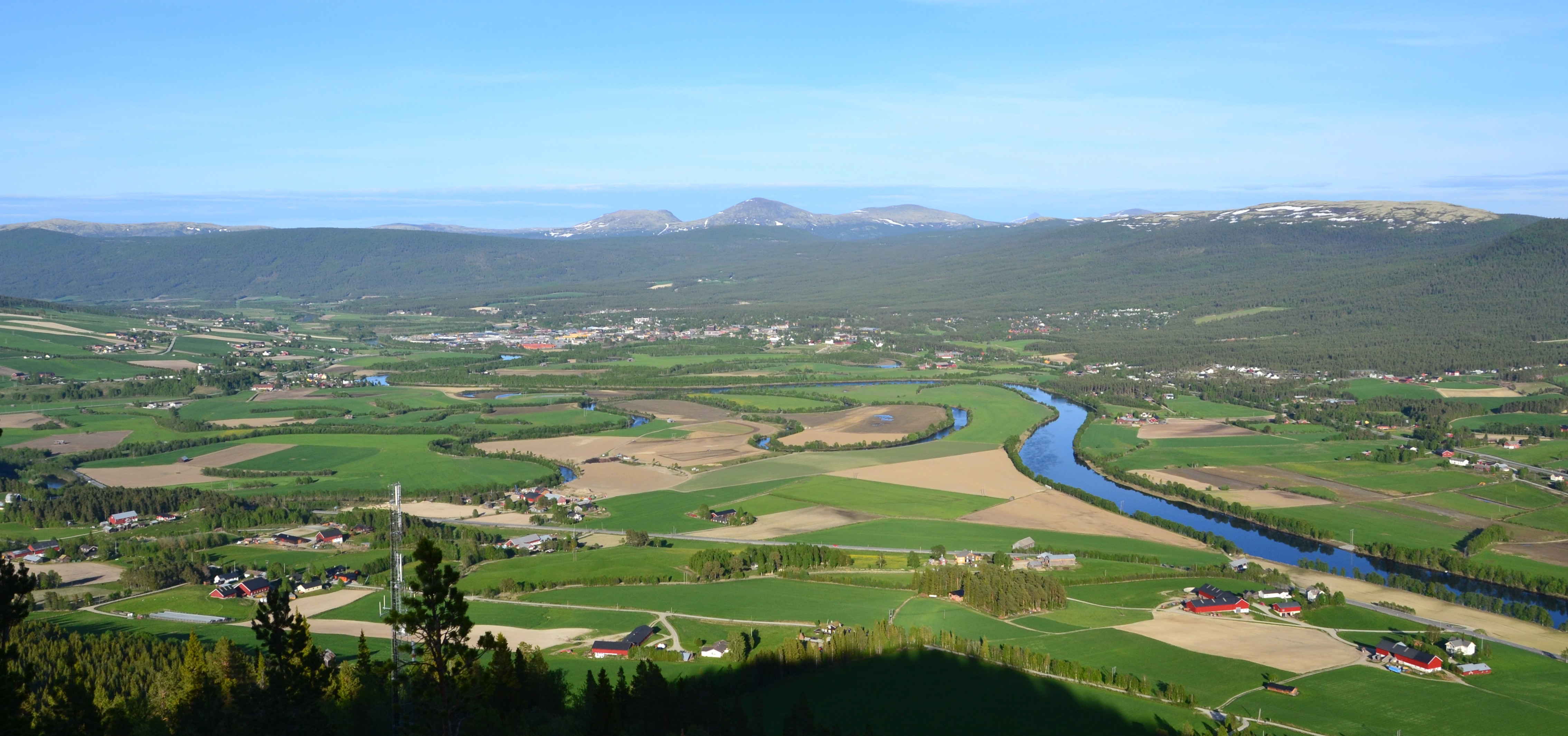 «Paa den Forhøining i Landskabet, som hinsides begrændser Sletten eller Vandet, ligger en Krands at Gaarde og grønne Enge. Gaardene prange vel ikke med stadselige Bygninger og røde Tegltag, men disse Klynger af græstækkede Smaahuse synes dog netop at høre hjemme på dette Malerie. Ovenfor Gaardrækken begynner Furuskoven, som stiger lien opad, inntil den tilsidst forbinder i Grønfjeldets gule Mos og Haverns steile Styrtninger. Men høit op over de øvrige Aaser og Fjelde skyder Tronfjeldet sin brede, furete Ryg. Den mægtige Steenjette staar der ganske ene, som om han forsmaaede at støtte seg til Nogen av de øvrige i Ætten, af hvilke ingen her kunde maale Høide med ham; ja nederst i Dalen mod Sydvest træder han endog med sin Flod lige ud i Glommen, som i rivende Strømninger skynder seg forbi hans truende Nærhed.»