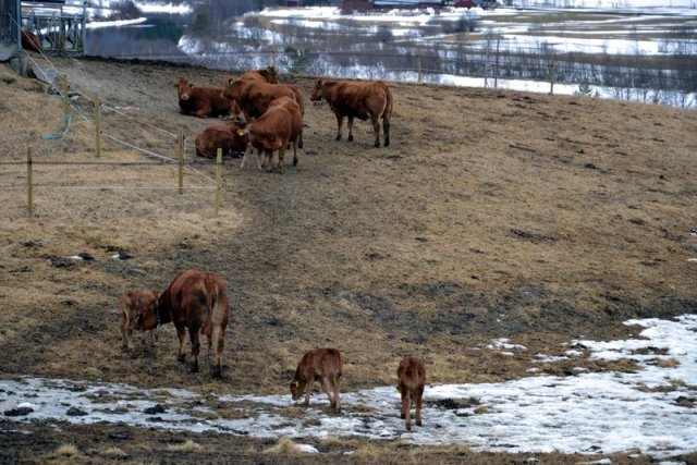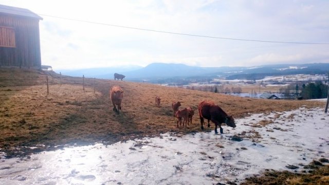 Jada, enda et innlegg om de søte små limousinene, og nok heller ikke det siste… Vi kan bare ikke rive oss løs, kalvene er vår store interesse og forelskelse om dagen. Nå er det bare en av de ti som fortsatt ikke har kalvet, men vi tror ikke det drøyer lenge før også Go’lin sin vesle kvige eller okse kommer. Det er en fryd å se mødre og kalver sammen ute på jordet. De ser ut til å nyte våren i fulle drag, og går nesten ikke inn i fjøset lenger. I går morges var det litt under null grader, og den lille «elven» av smeltevann som renner nedover jordet, hadde frosset til is. Det var litt skummelt for de minste å passere over den, og et par av mødrene måtte trå til og hente sine små «bambier» på isen.