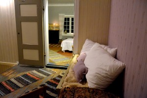 - Trappestua med den tapetserte veggen til høyre. Gjennom døra ser vi inn til Klettstua
