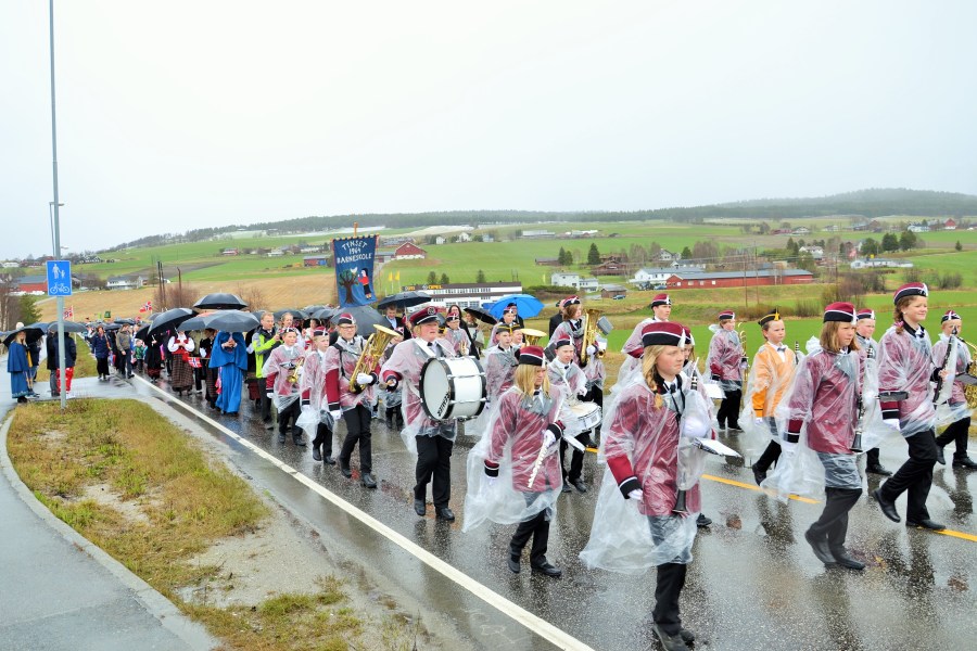 Korps etter korps sørger for god gammeldags stemning. Regnfrakker over uniformene måtte til i dag.