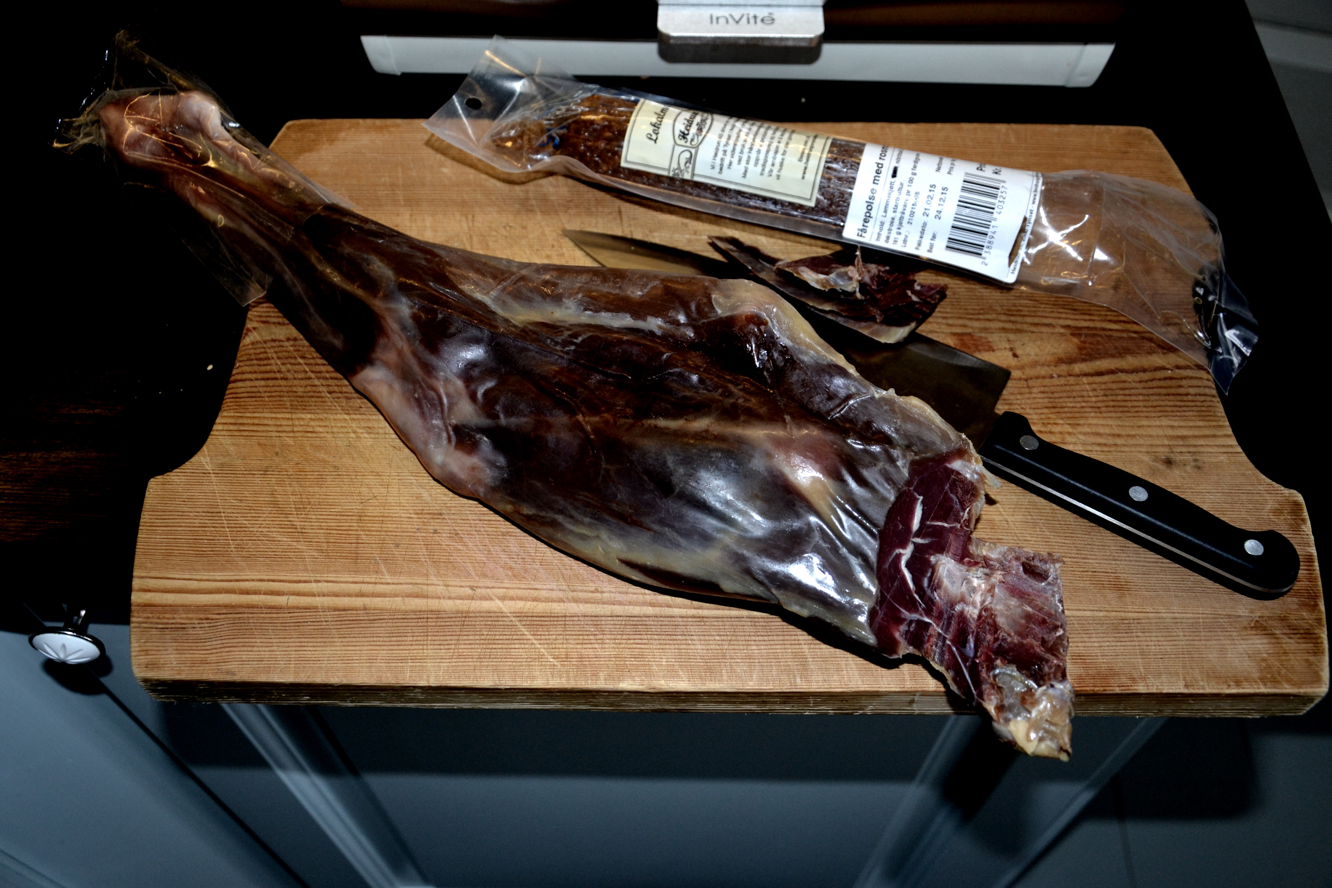 Hjemme på kjøkkenet skjæres det opp sammen med spekepølse. Jeg valgte den med rosmarin, mmm, nydelig!